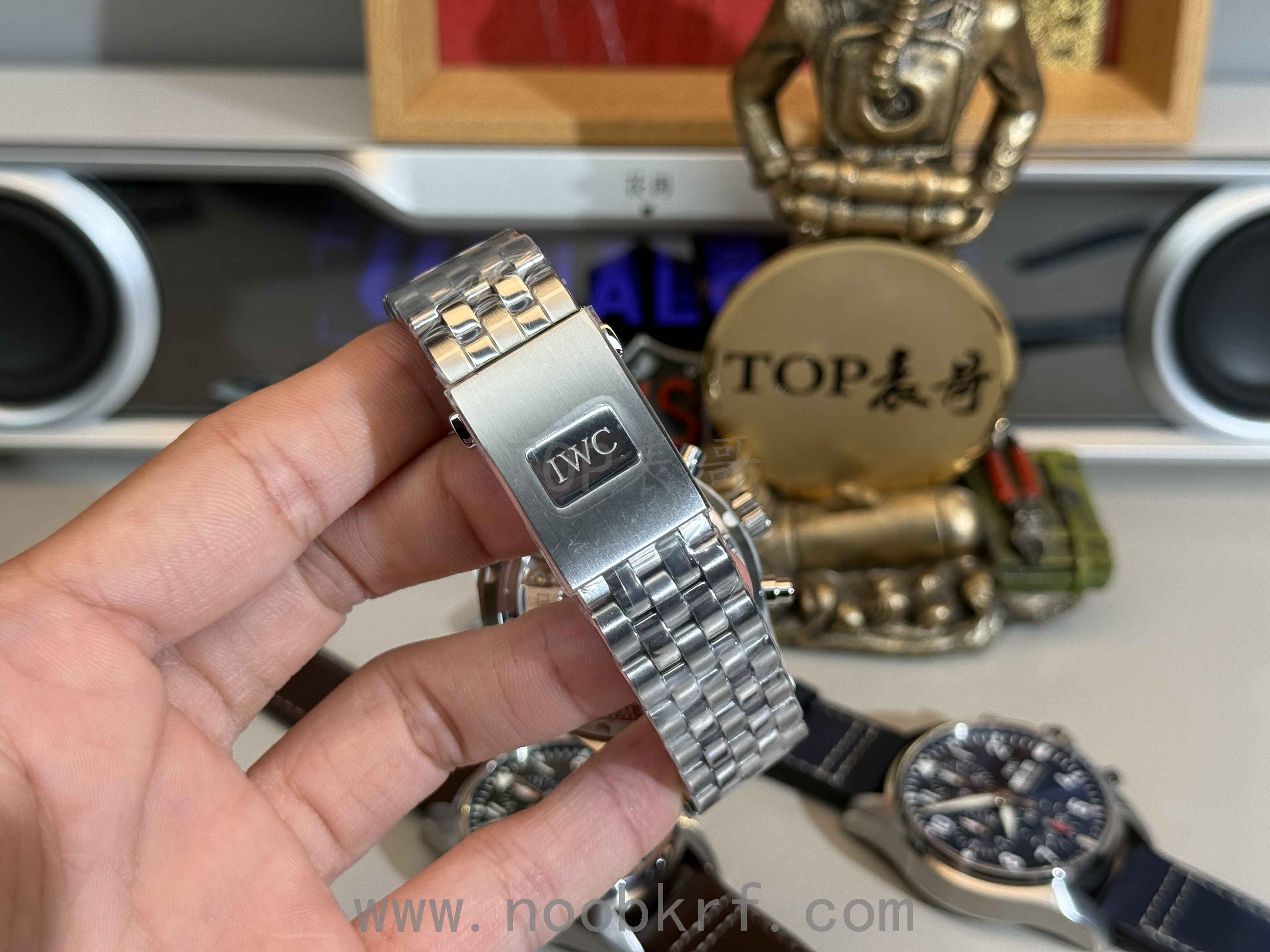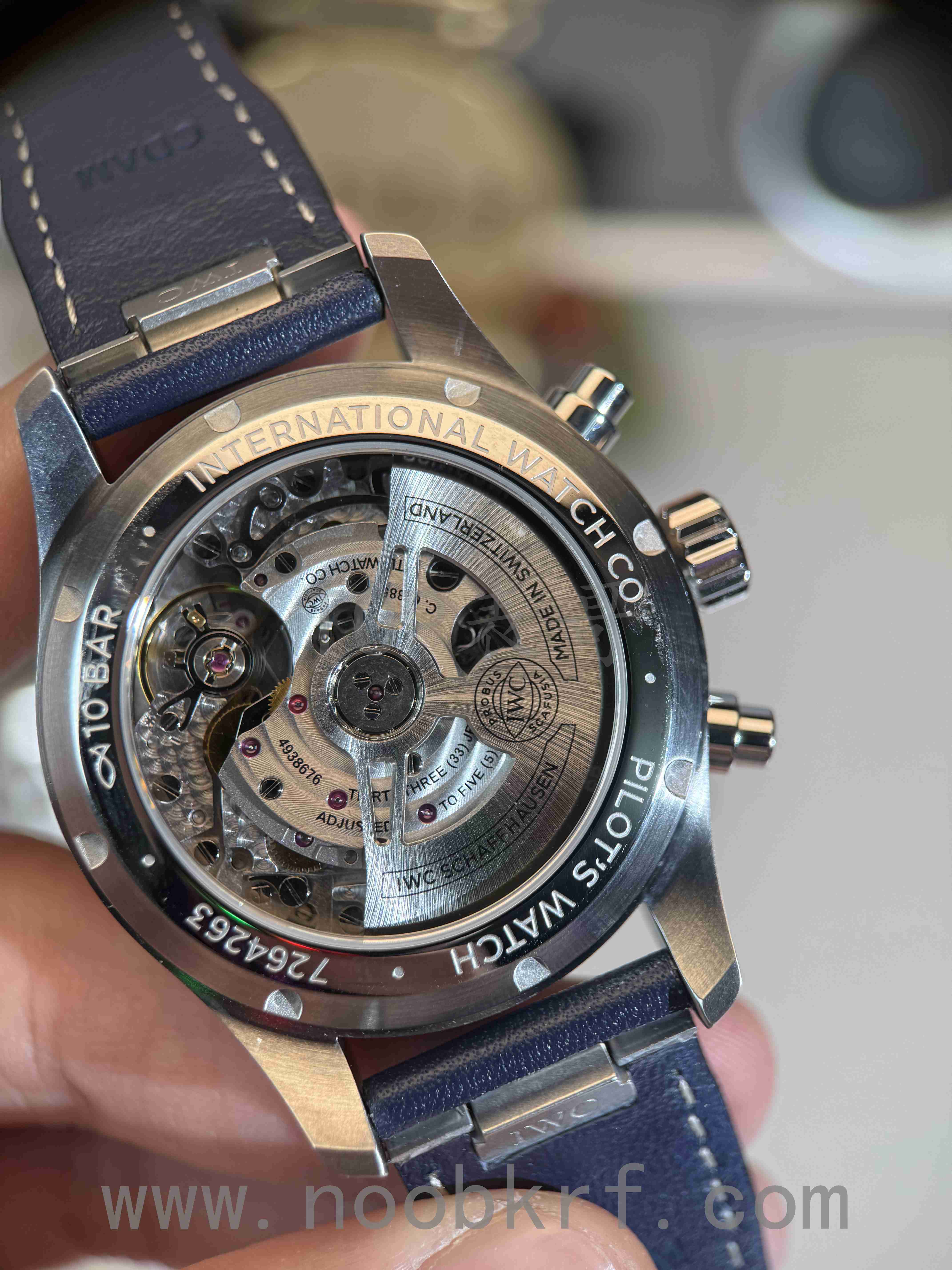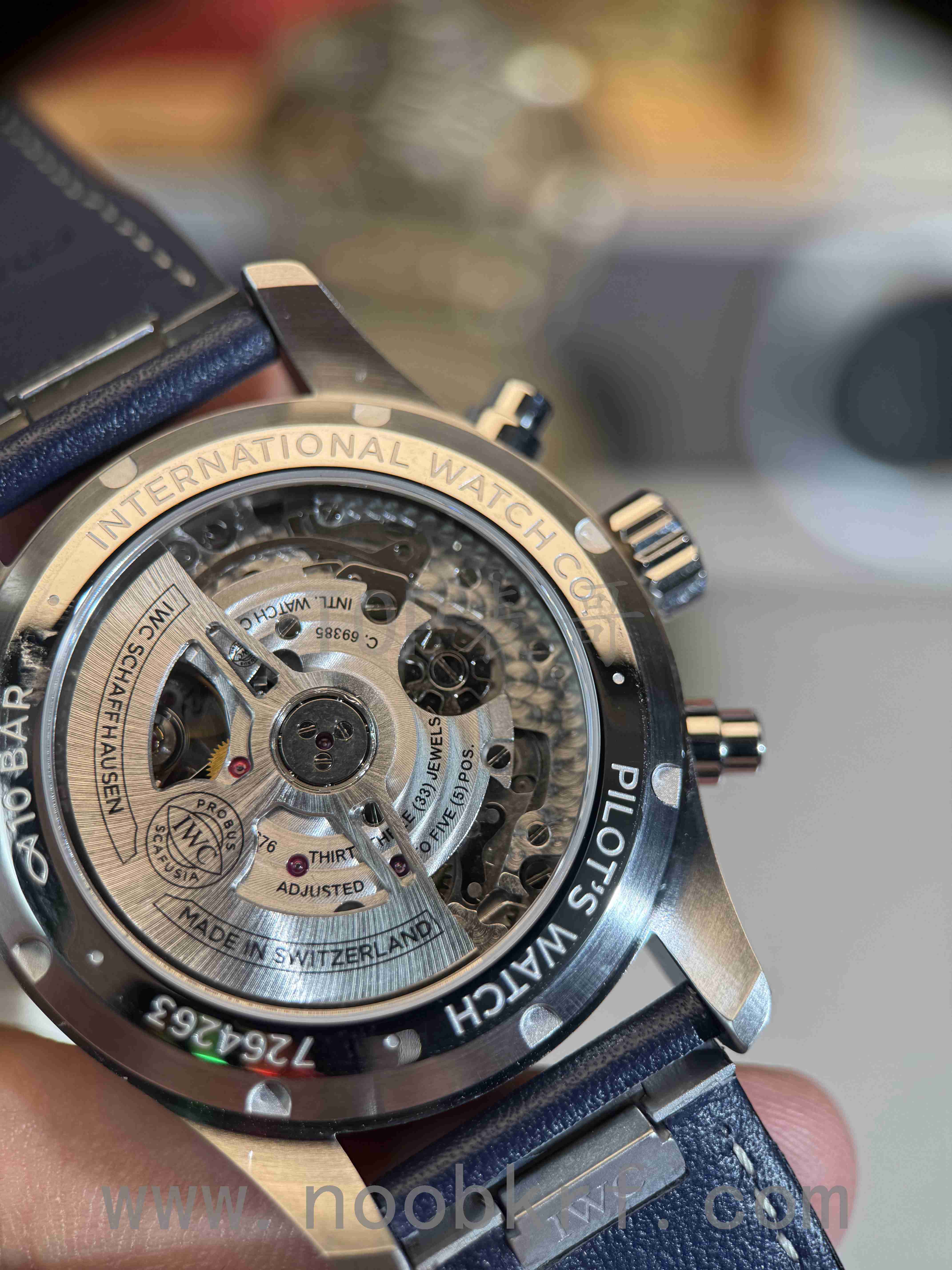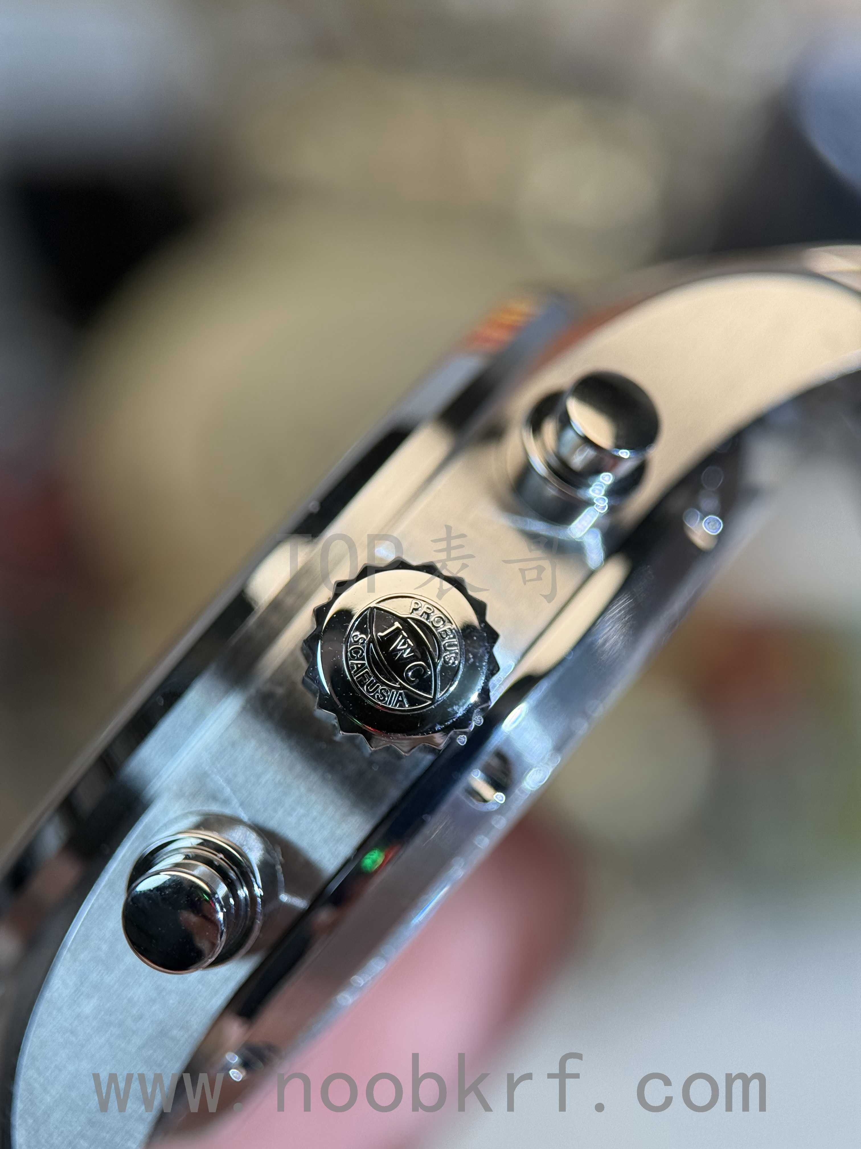 表侧表冠顶部镌刻有IWC品牌标识,周身设有防滑坑纹,得益于全新的表壳结构,腕表防水性能也从原来的六十米增至一百米。值得一提的是,上下两枚抛光计时按钮的按压手感也因为全新机芯比起老款更好了一些。