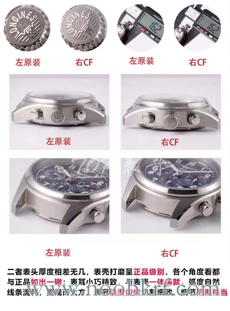 表圈和表壳皆为抛光设计,表壳侧面与表耳则是采用拉丝的打磨设计,CF工厂在表壳制造上还是没有问题的,不过表冠位置存在差异,就是把头位置偏小,正品的表冠是完全居中的。造成这点这点差异完全是基于机芯的问题,CF工厂是搭载国产的7750机芯也就是大家熟悉的上海7750机芯,而原版的L688.4机芯的基础机芯则是ETA7753,上海7750机芯是仿制ETA7750机芯而成的,7750和7753结构和功能没有太大的区别不过毕竟是两种不一样机芯所以在把头位置出现一些差异。不过在厚度上CF工厂还是同步原版,厚度尺寸一样为16.2毫米。