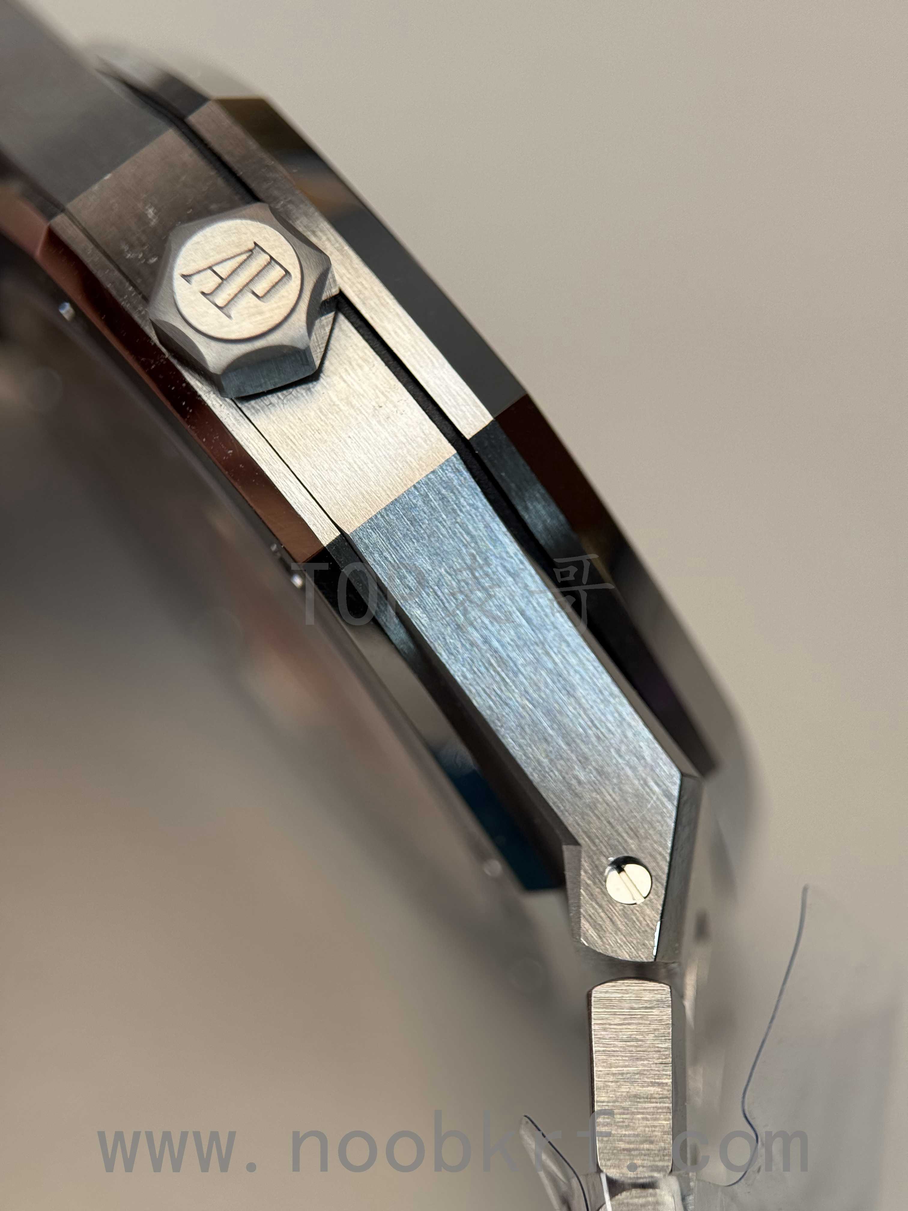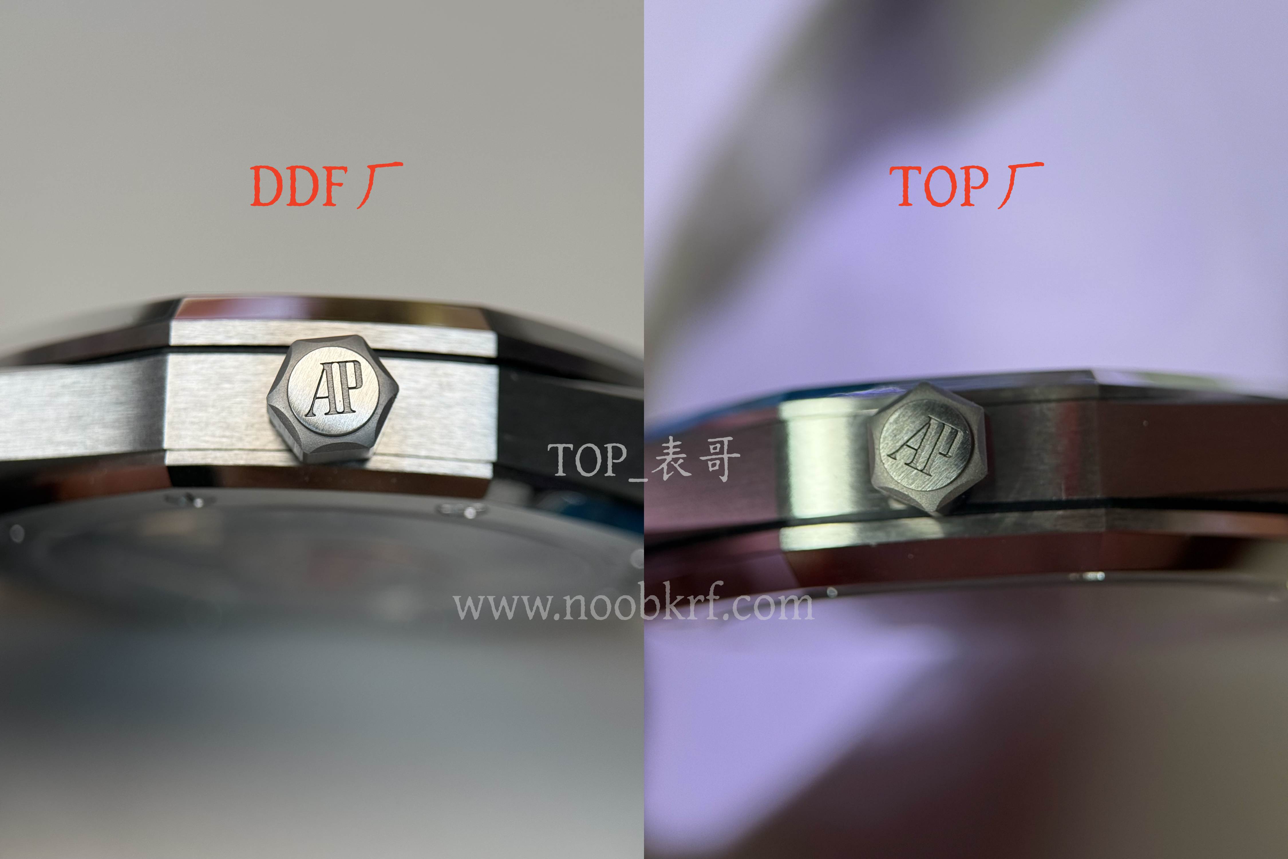 不过既然是两家不同的工厂,那么多多少少还是会存在差异的,在爱彼经典的八角外圈上的六角螺丝这个细节点,下图中所标注的TOP工厂存在个别六角螺丝中间一字螺丝孔位偏移的瑕疵,这一点反而是重蹈了APS工厂的覆辙,不过也算是个别的情况,只需要通过更换一个挑品控即可解决了。反观DDF工厂,这一点则是十分到位,良品率和细节把控还是十分到位的,不得不说以表壳而打出名堂的DDF工厂对于爱彼的表壳做工也是毫不逊色的。