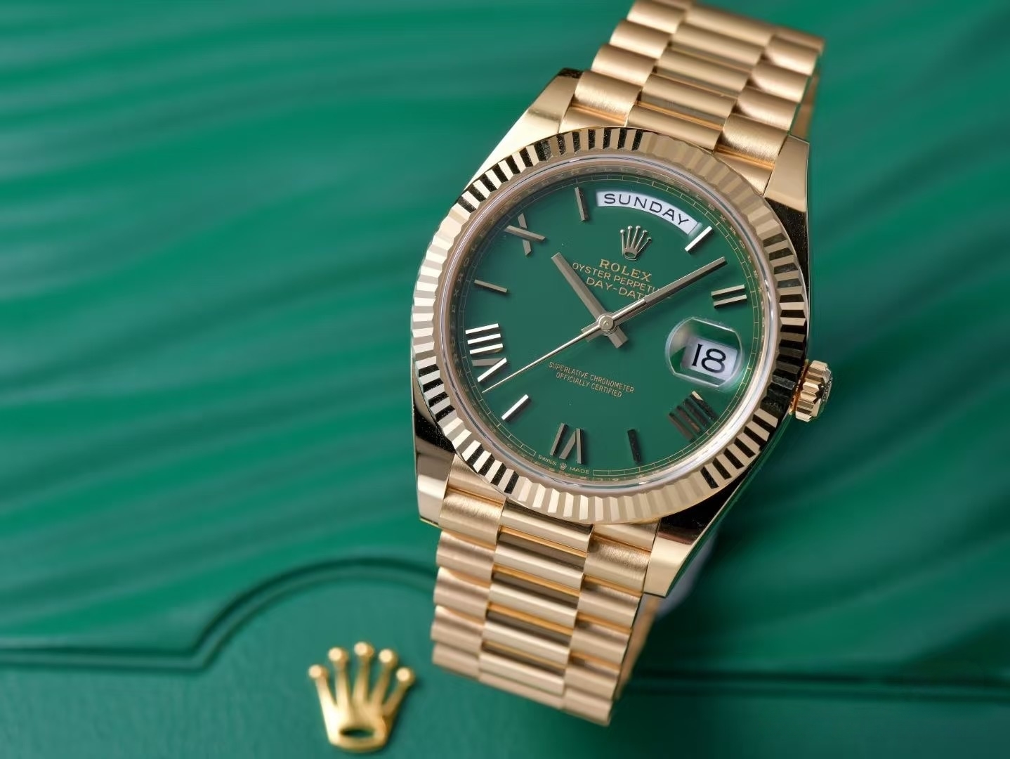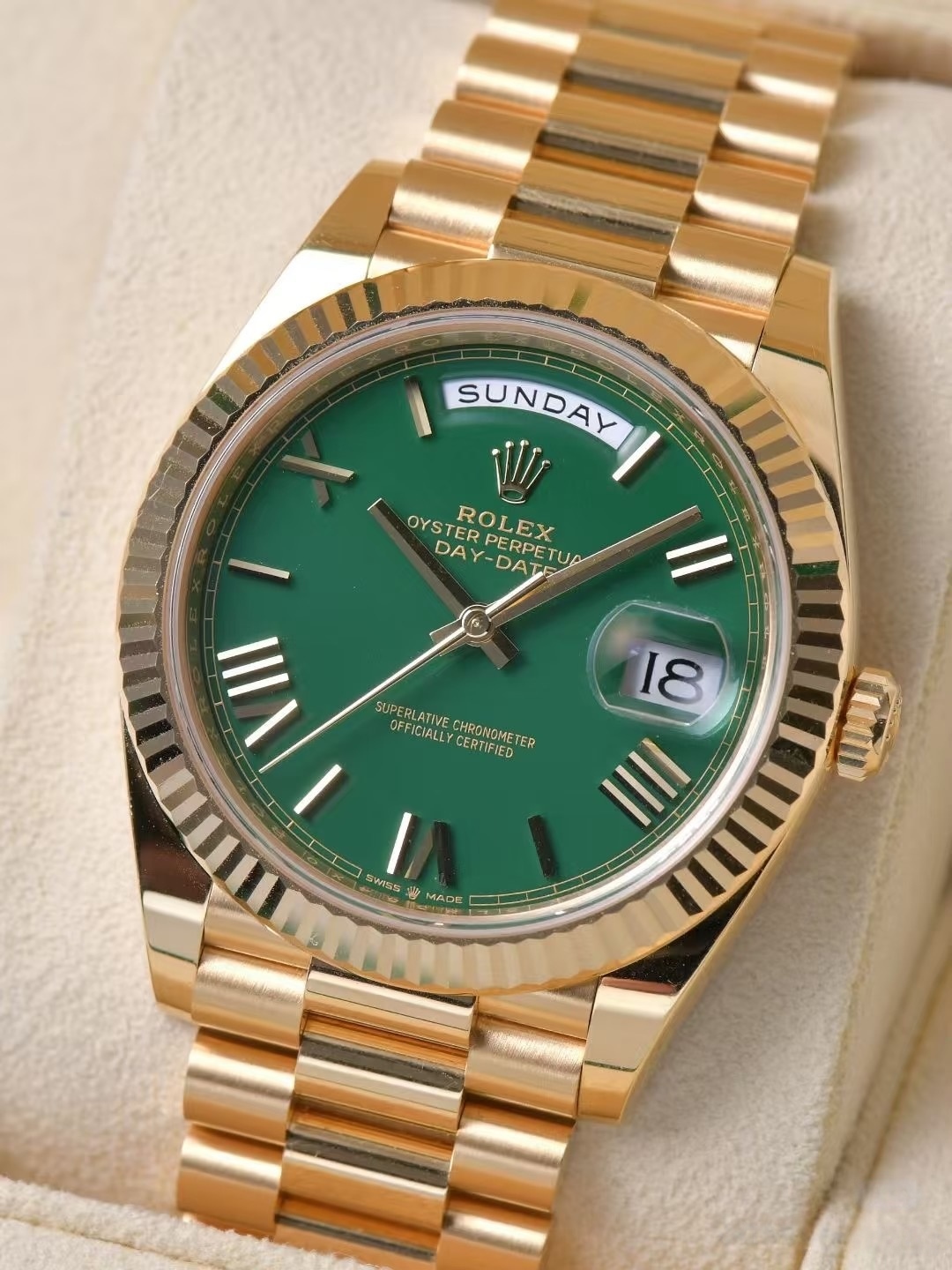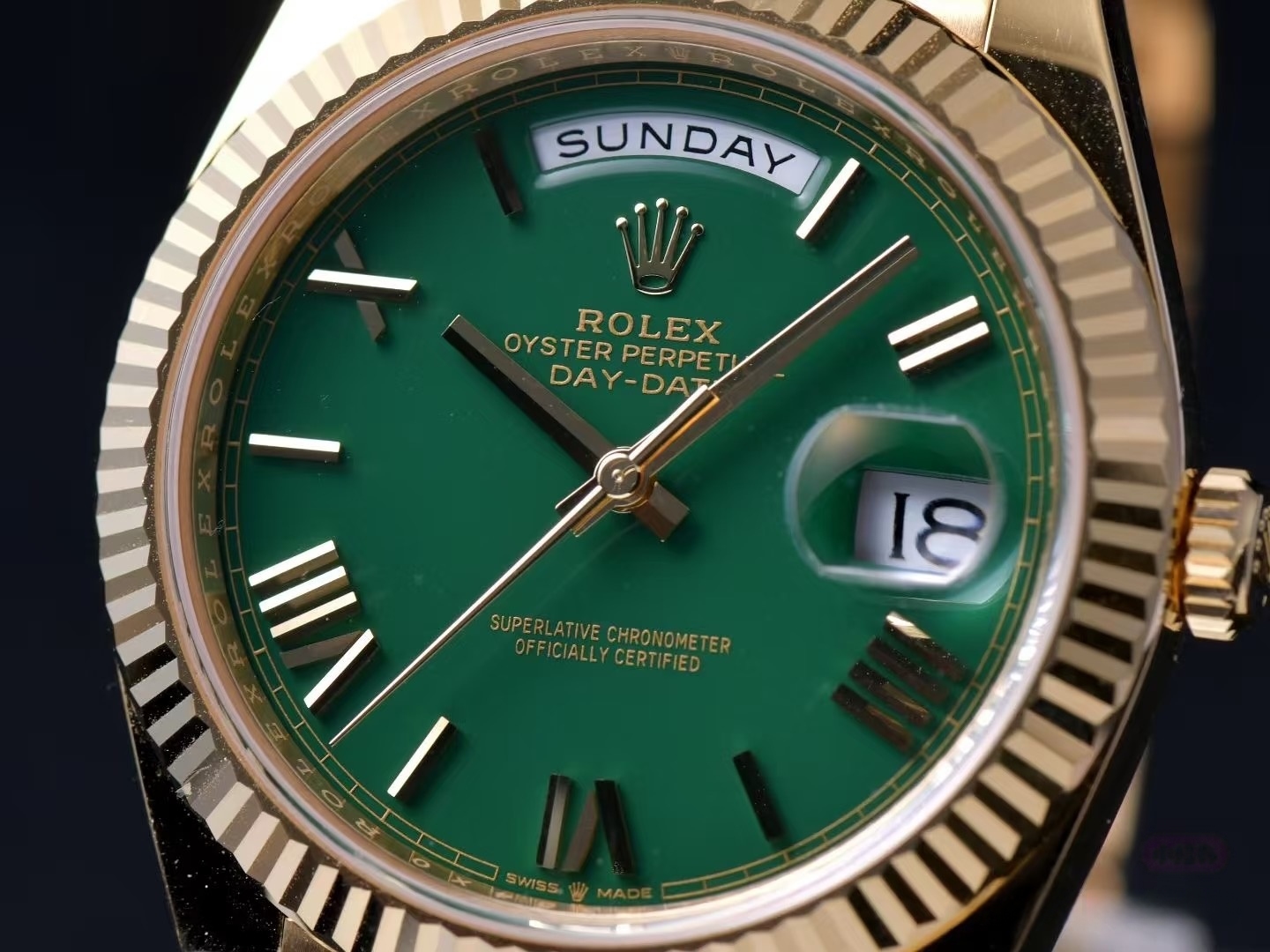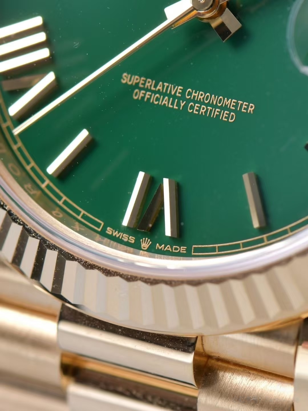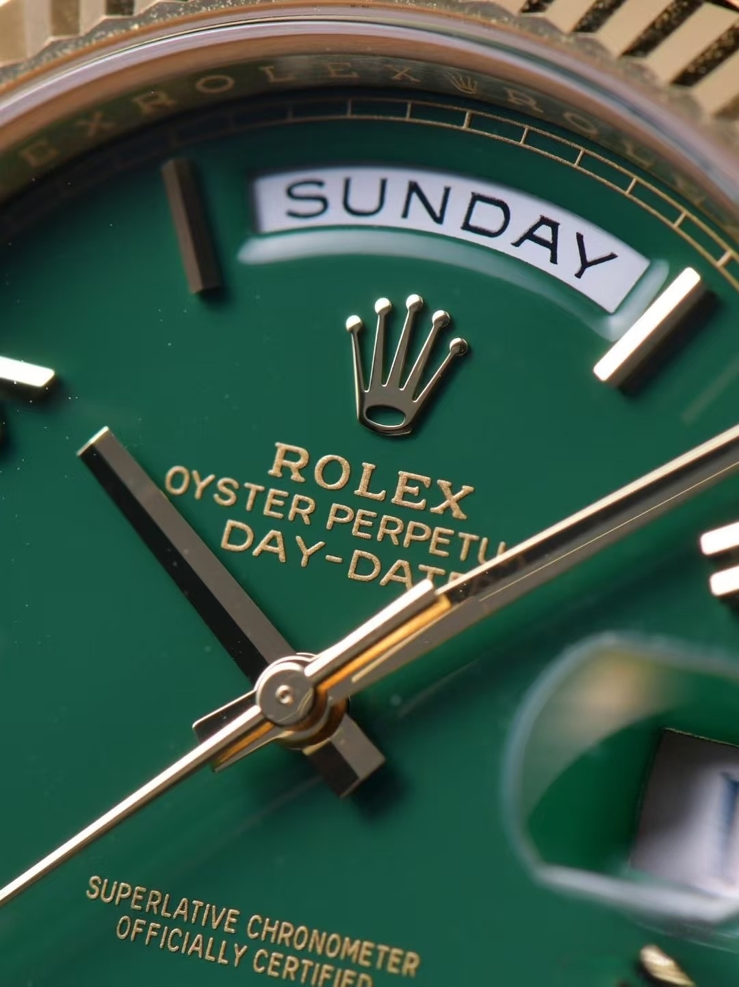 表盘是228238“赌桌绿”的灵魂所在,其工艺复杂度与辨识度,使其成为这款腕表的核心亮点。表盘采用劳力士专属“赌桌绿”漆面,灵感源自赌场经典桌布色泽,历经6层漆面叠加喷涂,每一层喷涂后都经过低温烘烤固化处理,确保色泽均匀饱满、细腻通透,且长期佩戴不易褪色、不易氧化。在不同光线环境下,表盘呈现出截然不同的美感:强光下,是鲜活灵动的翠绿光泽,通透无杂色,质感细腻如玉;暗光环境下,则转为深邃内敛的墨绿,温润醇厚,层次丰富有质感。表盘时标采用18K黄金罗马刻度,经立体压印、手工精细抛光处理,立体感十足,刻度表面光滑细腻,与翠绿表盘形成鲜明对比,读数清晰直观。表盘延续Day-Date系列经典双日历设计,12点位置为星期窗,3点位置为日期窗,实用且具辨识度;窗口边缘经过精细打磨,无任何毛刺感,日历字体清晰规整,搭配劳力士标志性的蓝水晶放大镜,放大效果清晰,方便快速读取日期,既保留了系列经典基因,又将表盘的精致工艺展现得淋漓尽致。