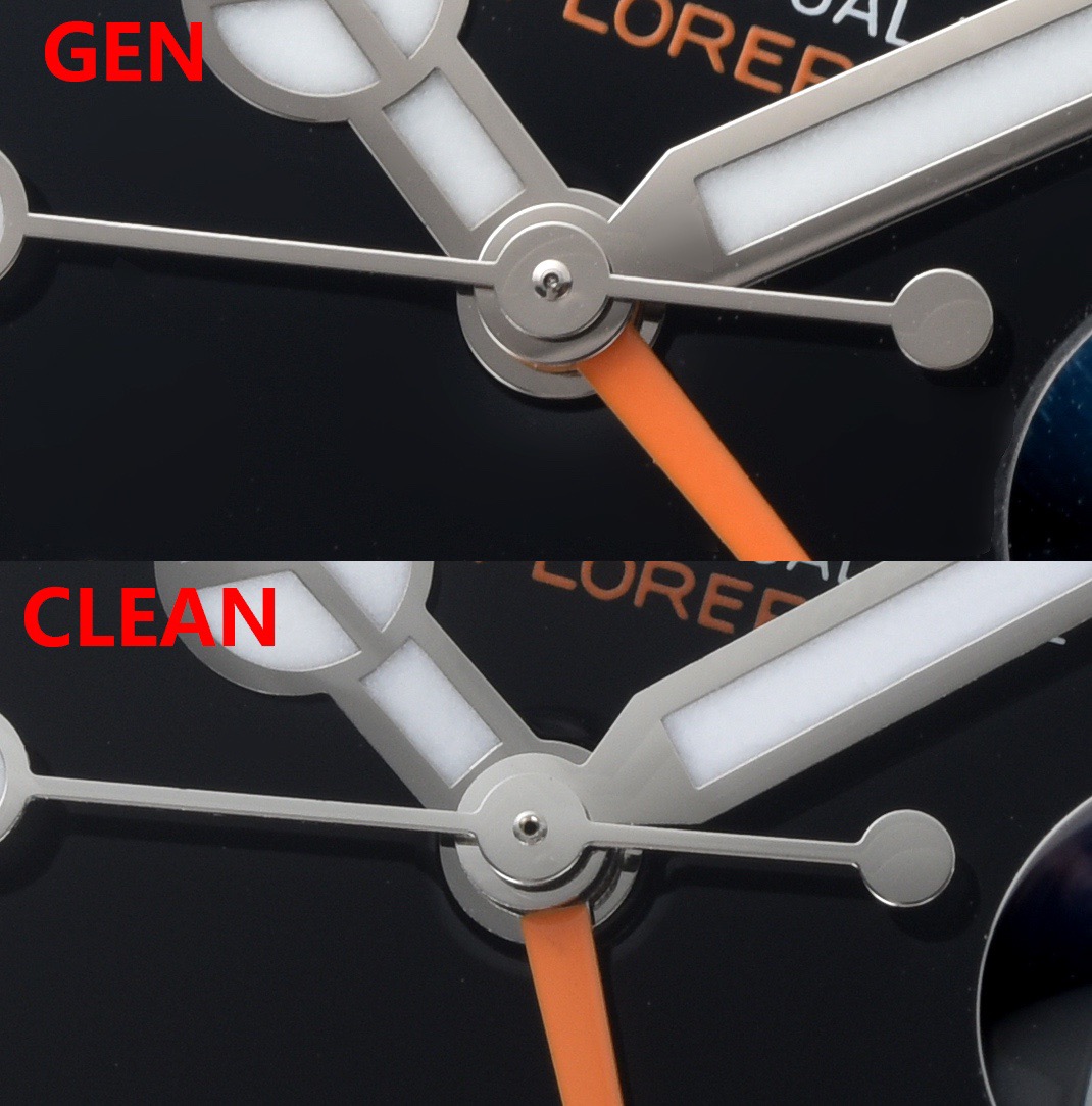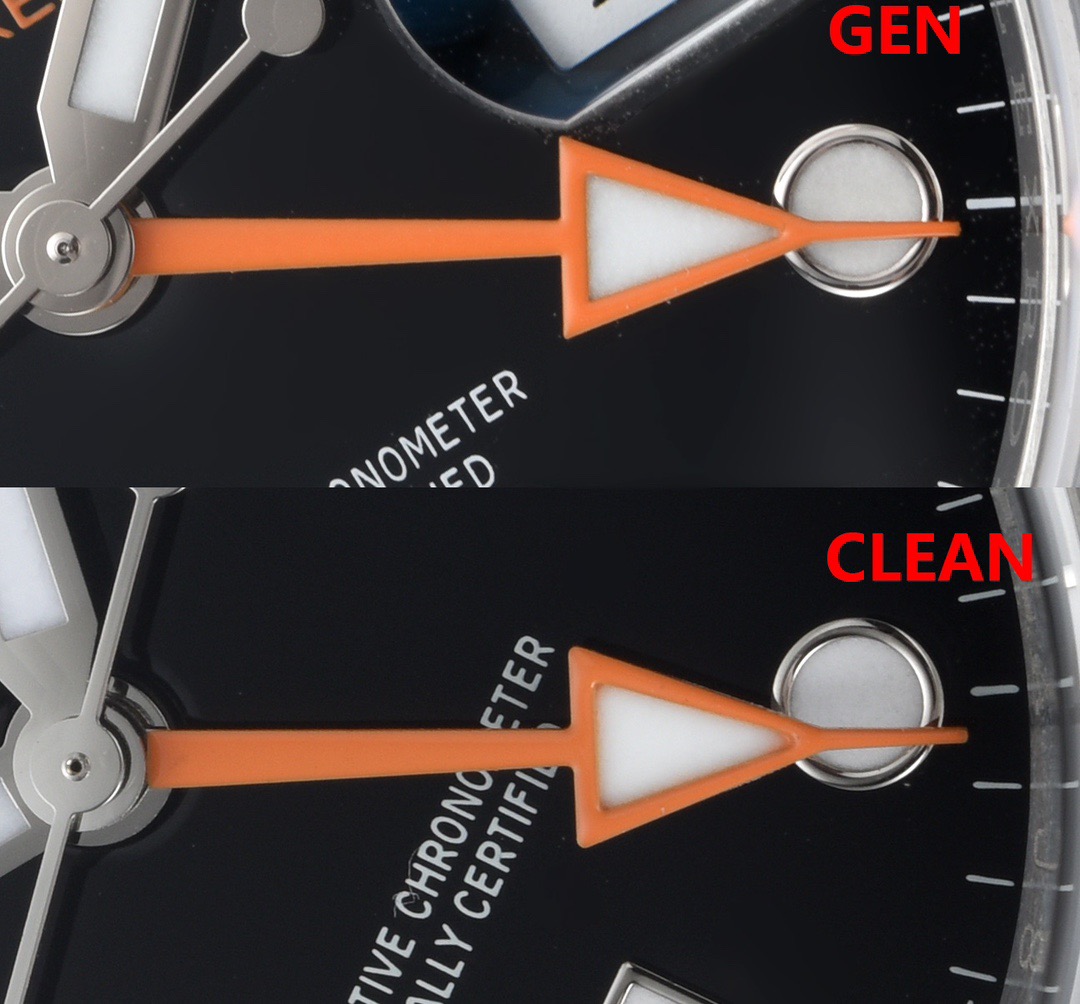 这里表哥给大家简单总结一下,clean工厂的劳力士黑探2226570-0002黑盘还是非常不错的,整体的外观做工基本就是告别一眼假的存在,不过相比较白探2的熏黑磨砂指针,黑盘的钢针多多少少还是存在细节上的不足的,在放大5倍的微距下,不管是clean工厂还是V厂的指针中轴的轴套在抛光的细腻程度上就没有办法做到对版的还原,并且在轴套的形状上clean的是常见的圆柱形,而GEN原版为铆钉形的设计,单独这方面就是明显不如白探2对版了,另外在指针的厚实感而侧面圆弧度打磨方面还是达不到正品的细腻程度的。