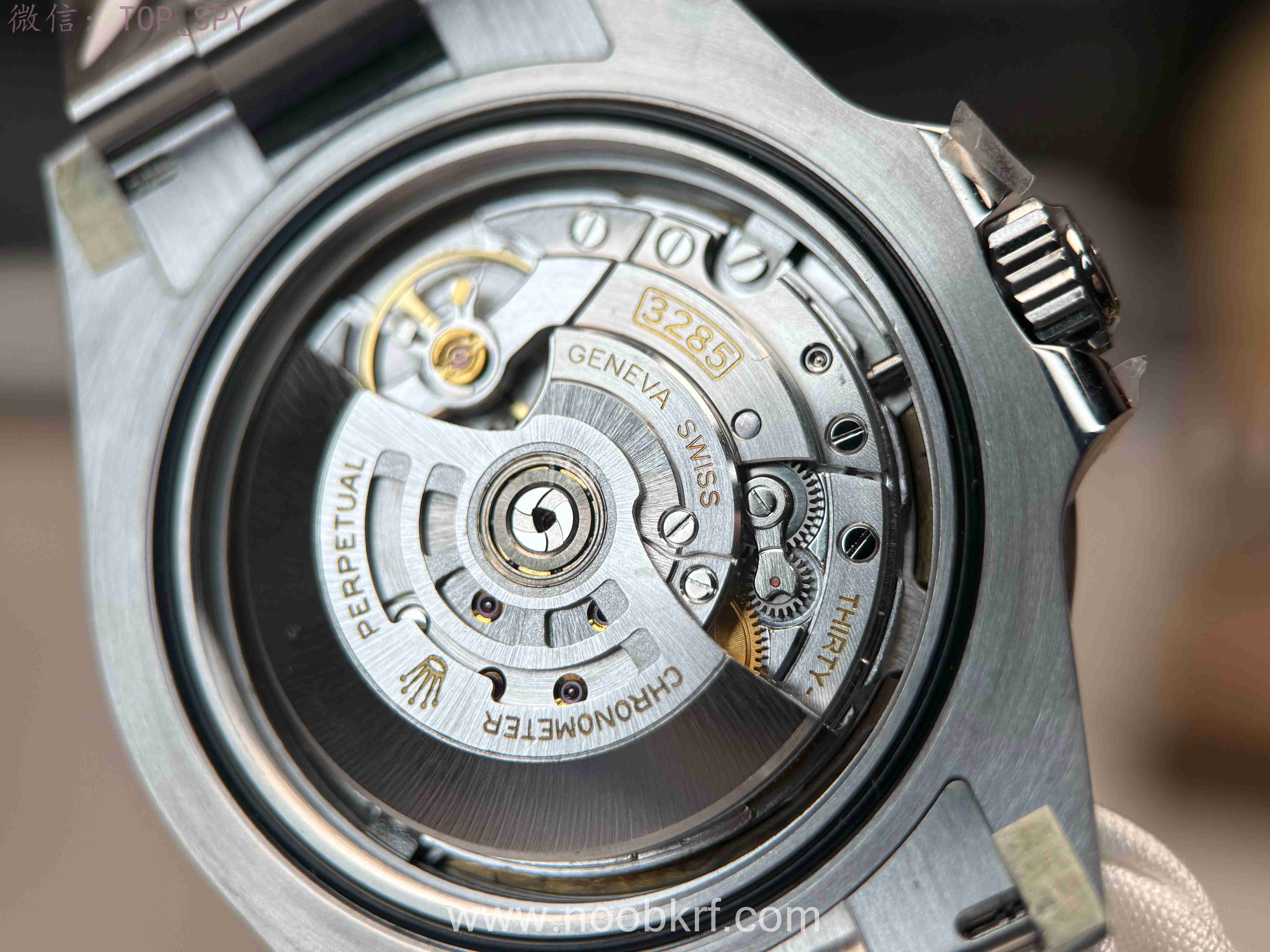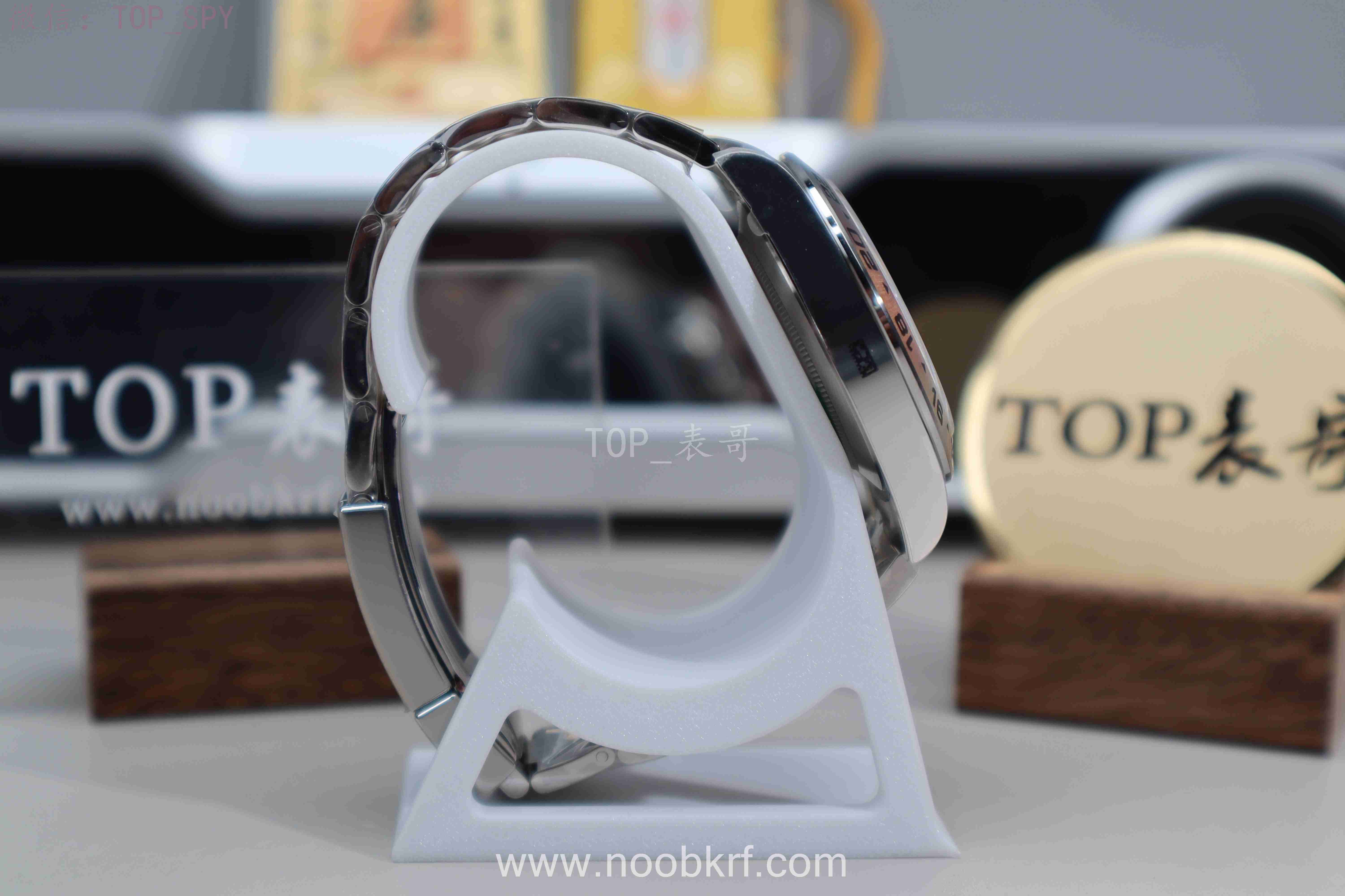 最重要的一点就是V厂在把头方面进行对版的修正,外观形状上进行一对一的扁平“压缩”,长度上对标原版,略微高于护肩,把头上的皇冠logo也是进行了细腻的由粗往细的慢慢过度,在夜光上也是增强了亮度和颜色上更加偏向于蓝光的效果,总结来说还是一款不错的复刻表的。