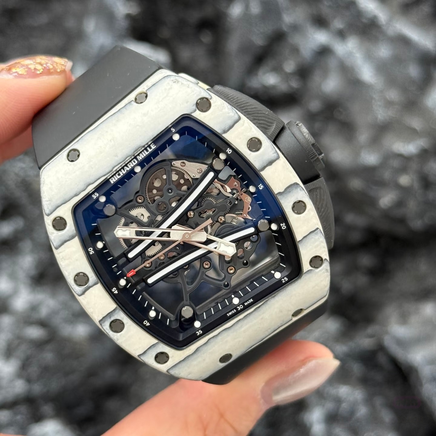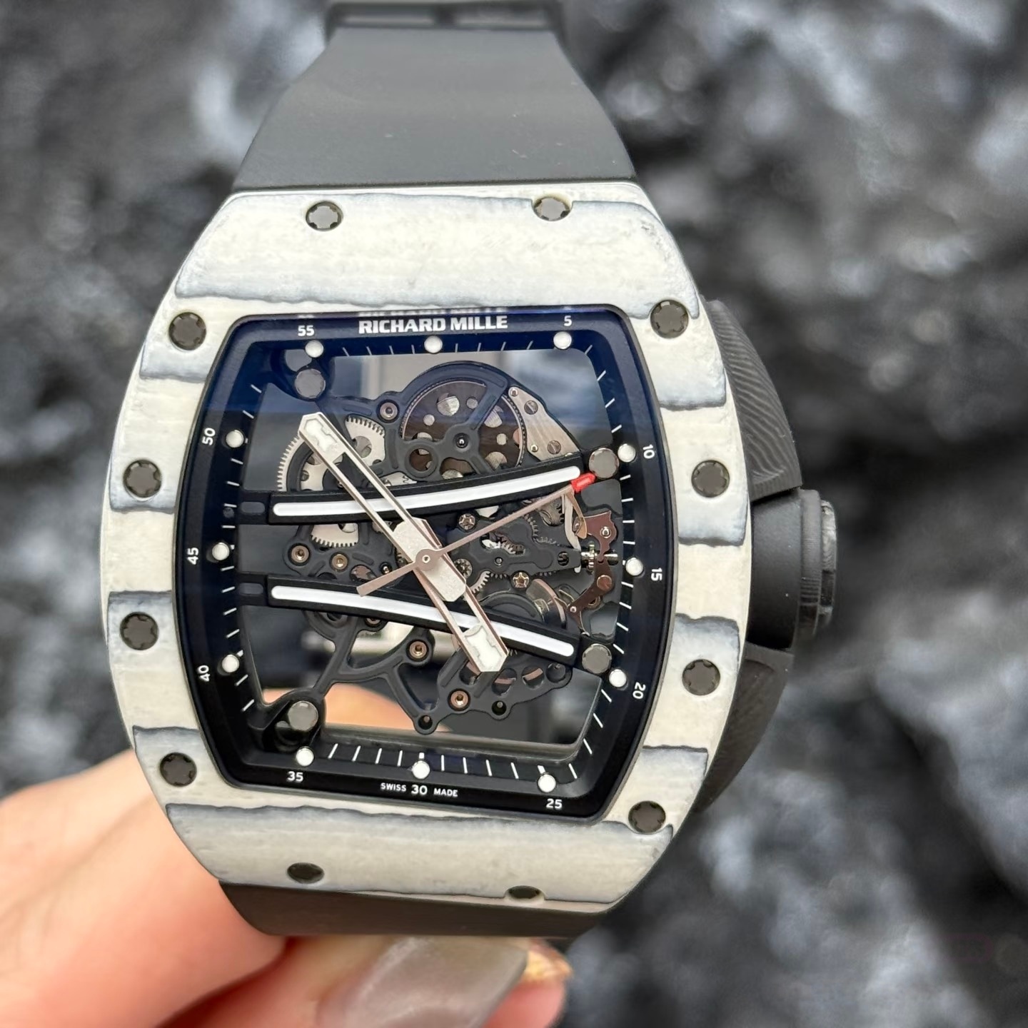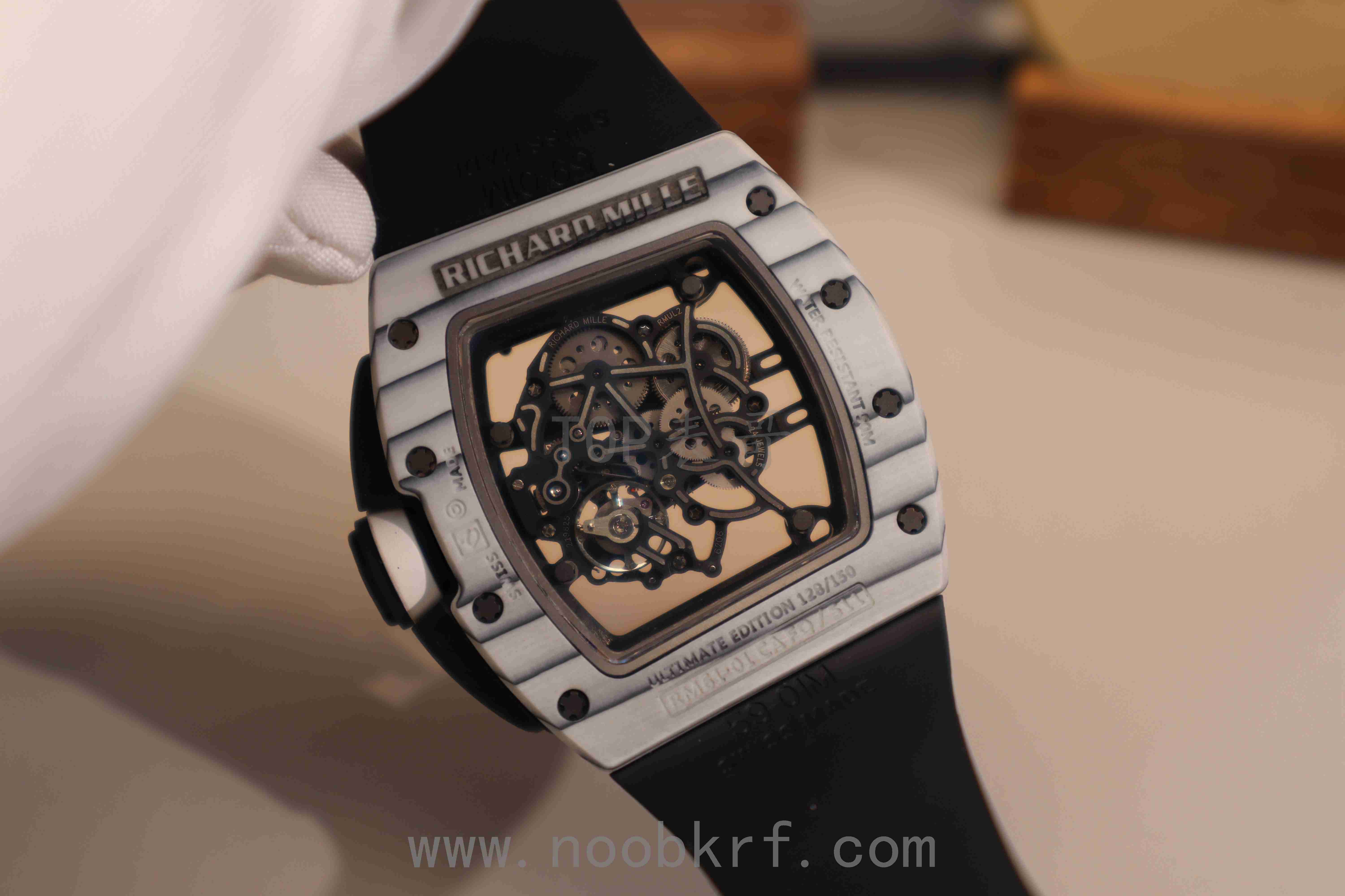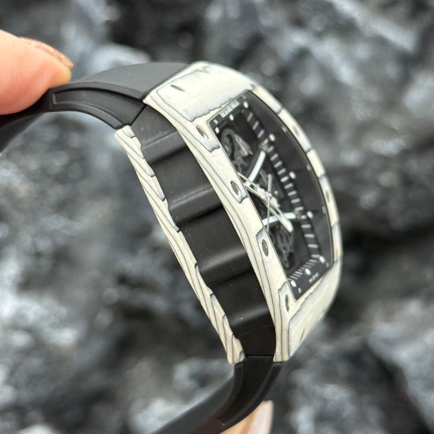 RM61-01 白跑道:白色 NTPT 碳纤维 / 白陶瓷,超轻量 (约 80-100g),高抗刮性