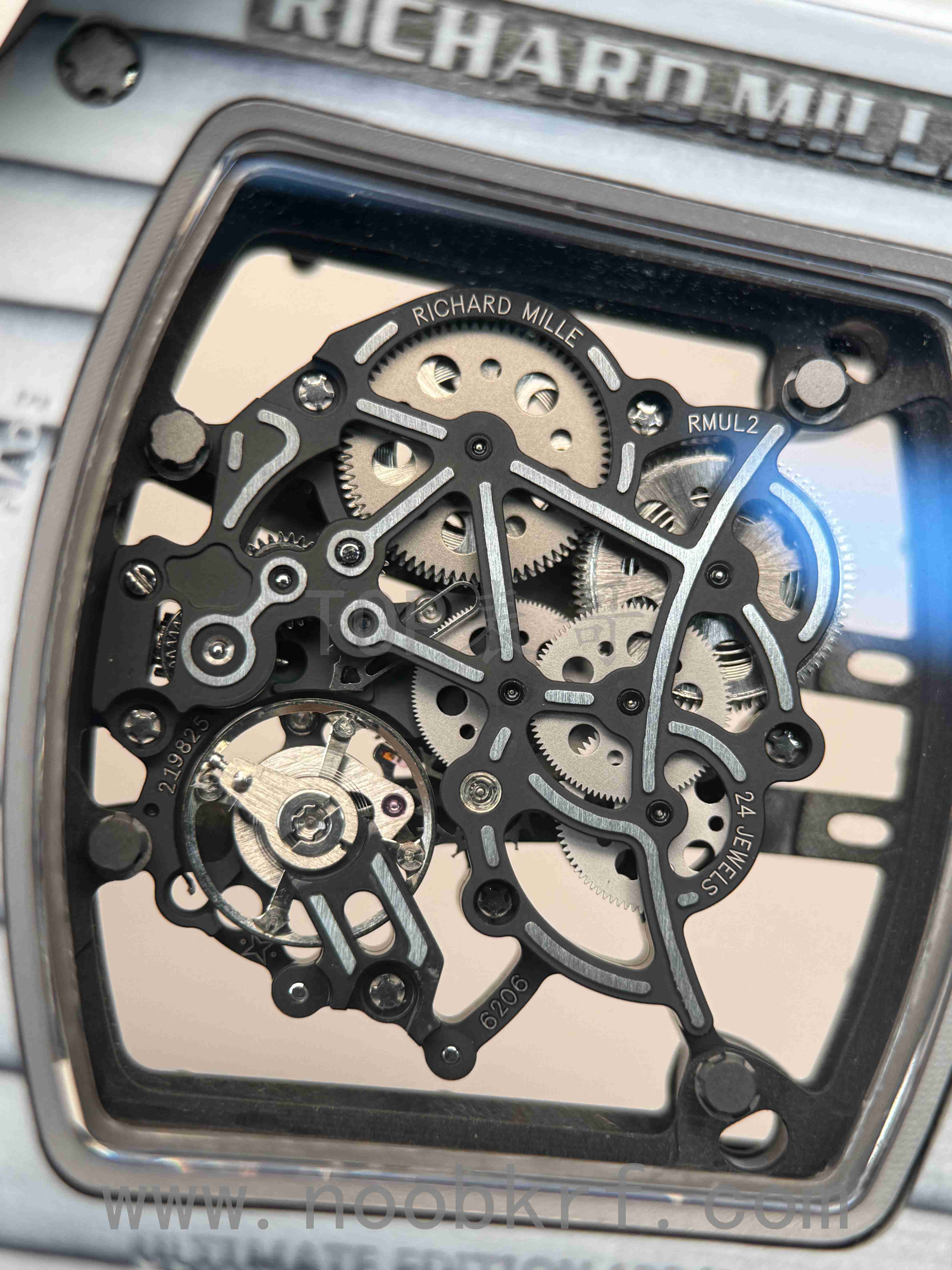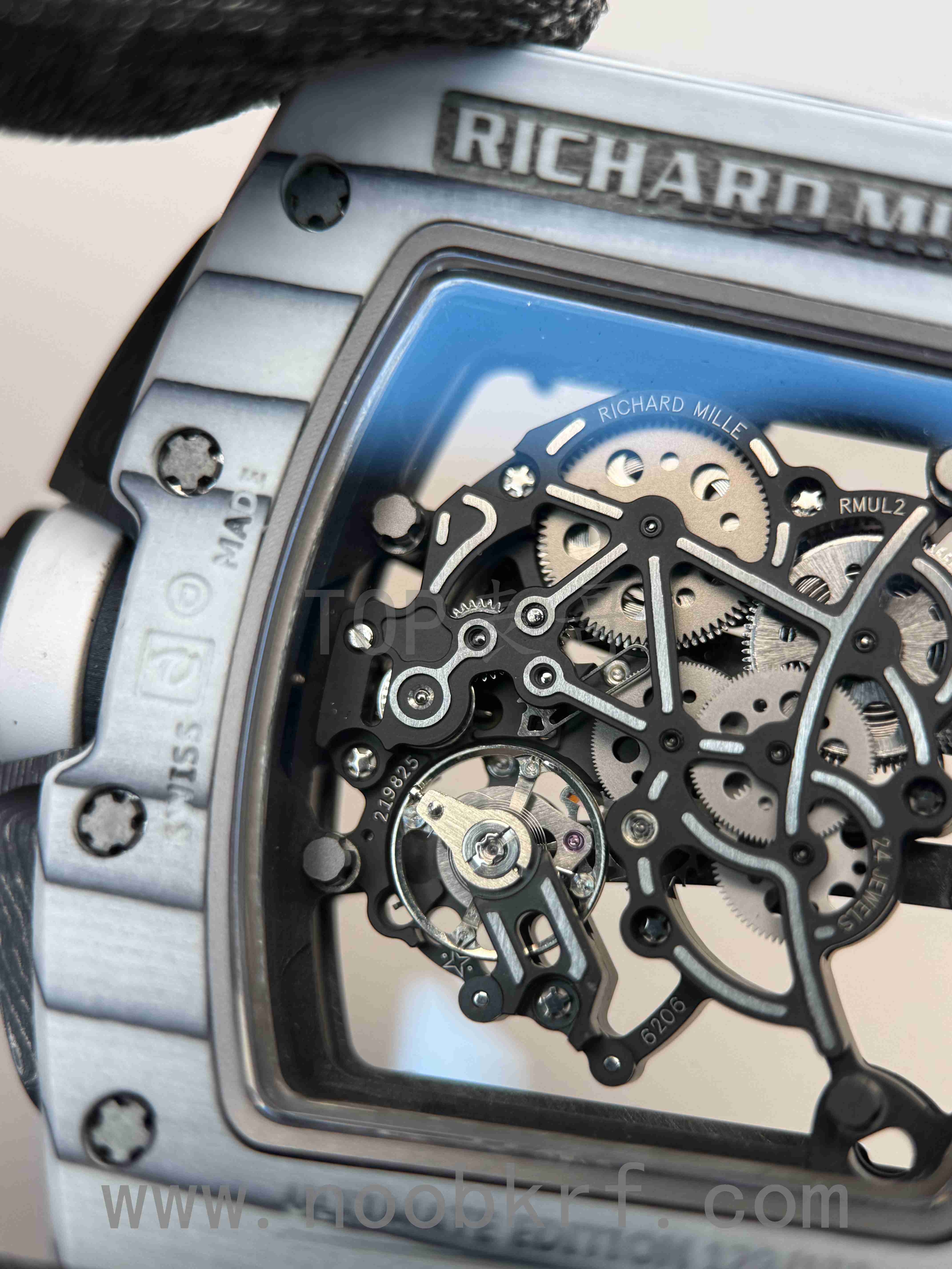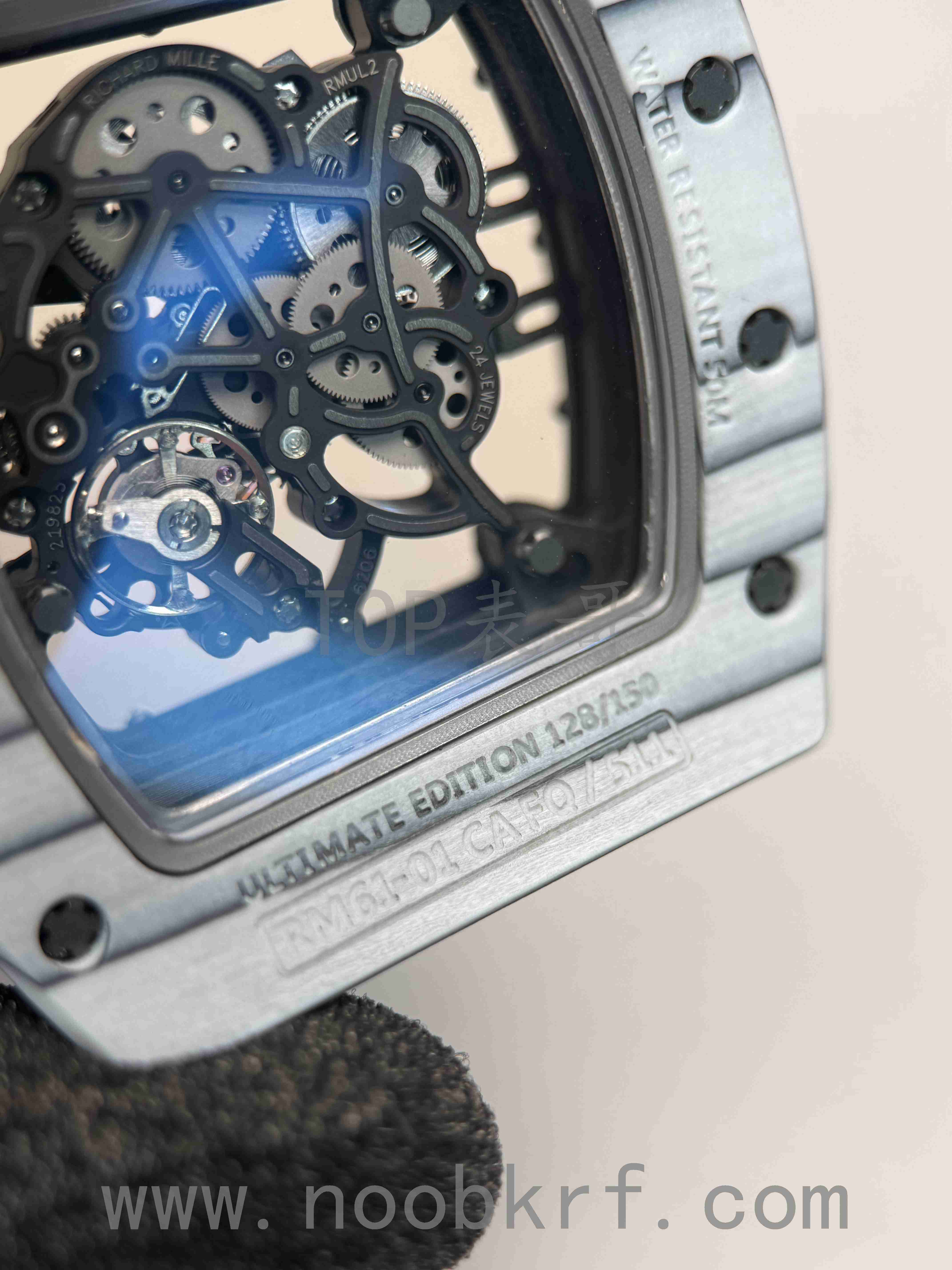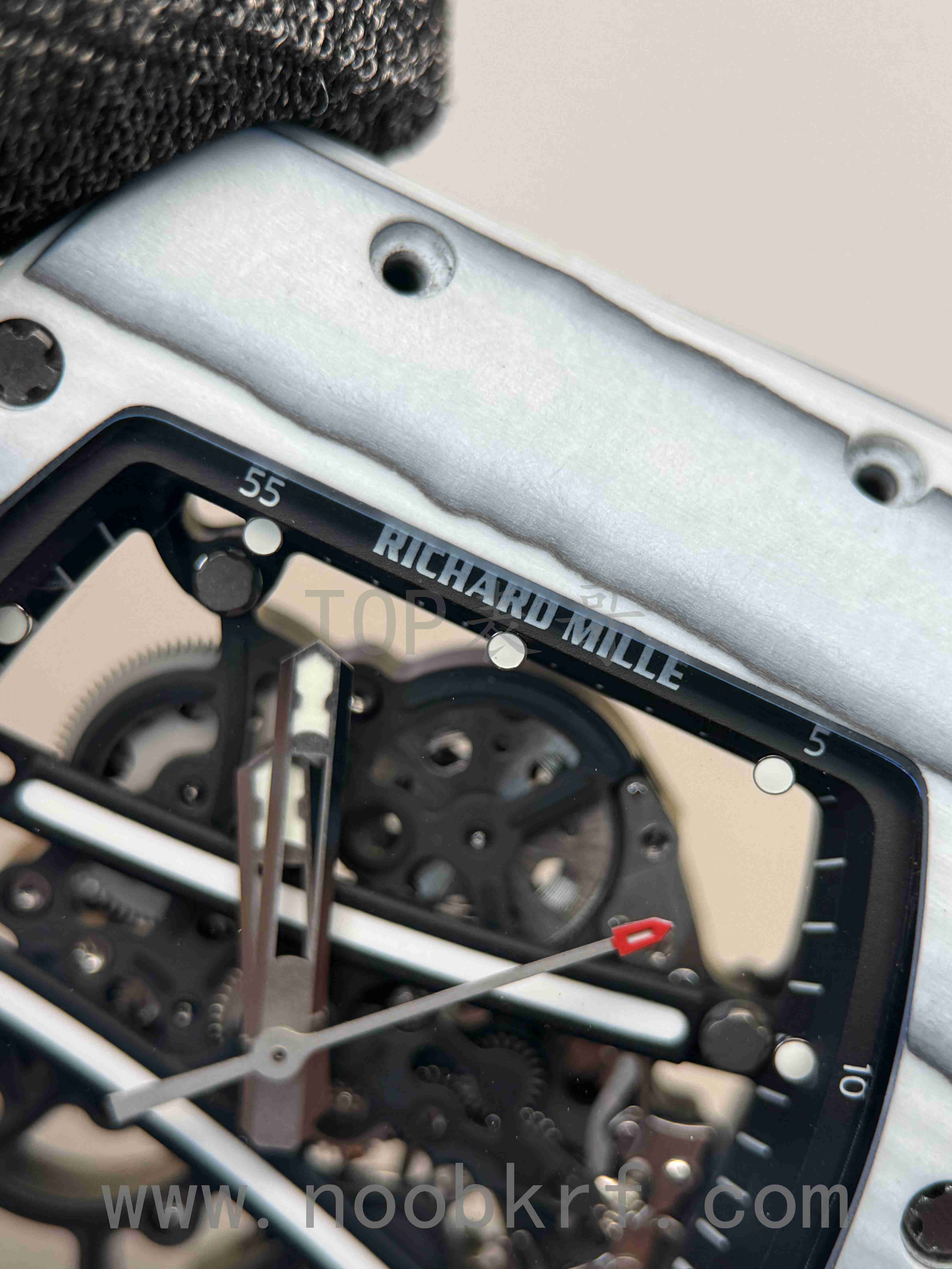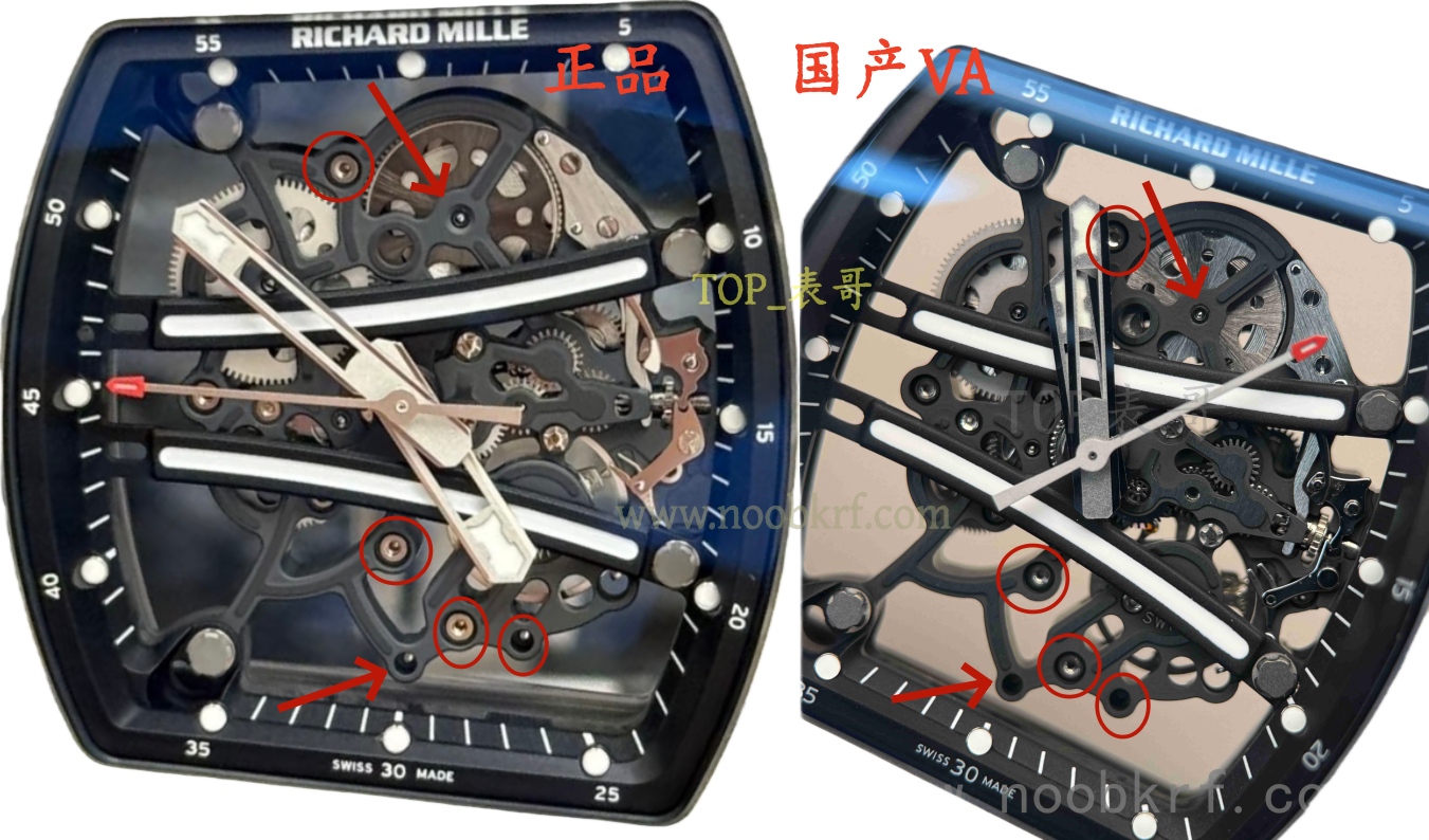 061和055机芯均为RMUL2机芯,不过061机芯整体为偏熏黑的处理,而055则不是反而偏明亮,061最明显的则是体现在双发条盒的左亮右暗的两种颜色的处理,而这个国产的va机芯版本这方面是对版的,同样的APRF机芯也是同步这个设计。
