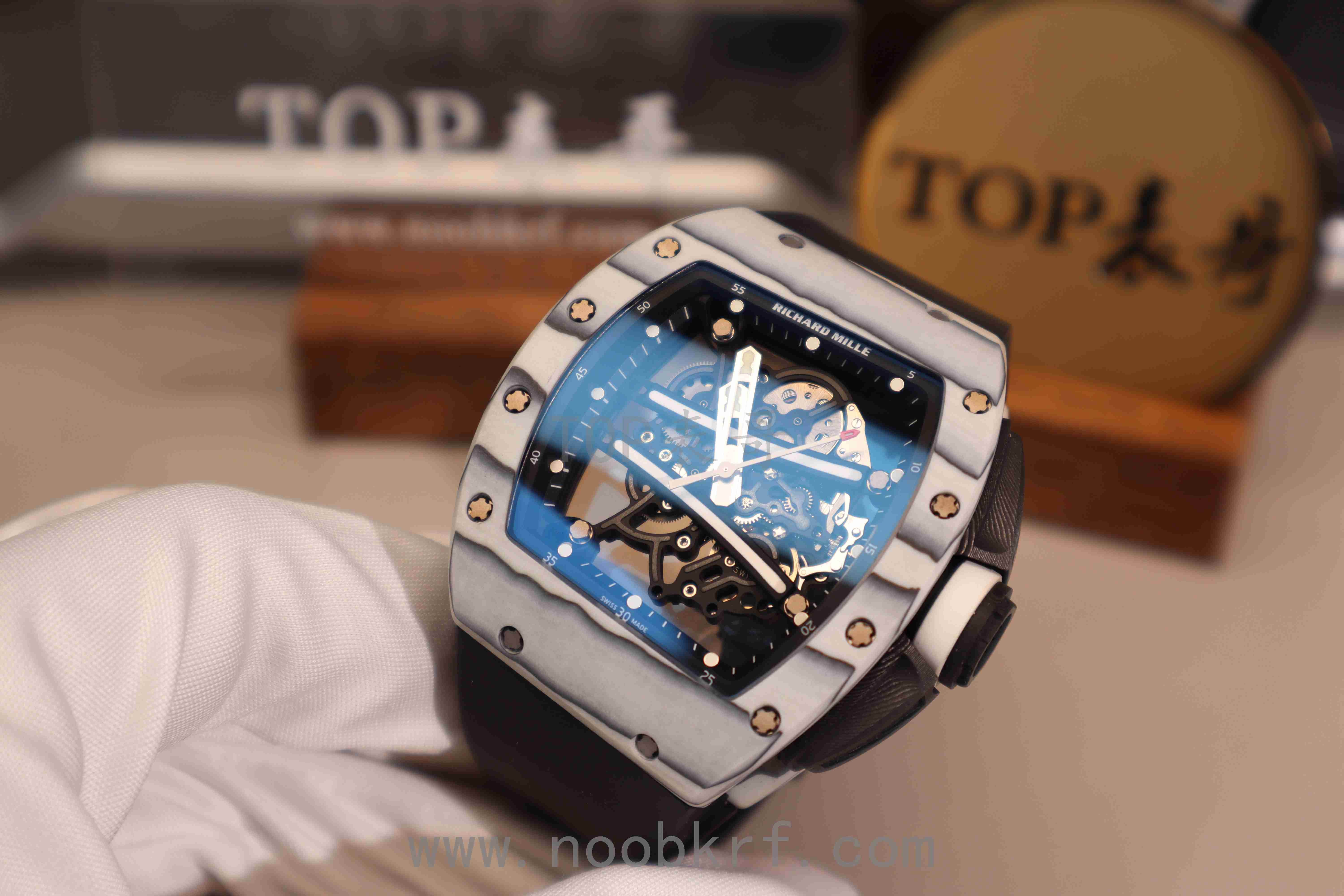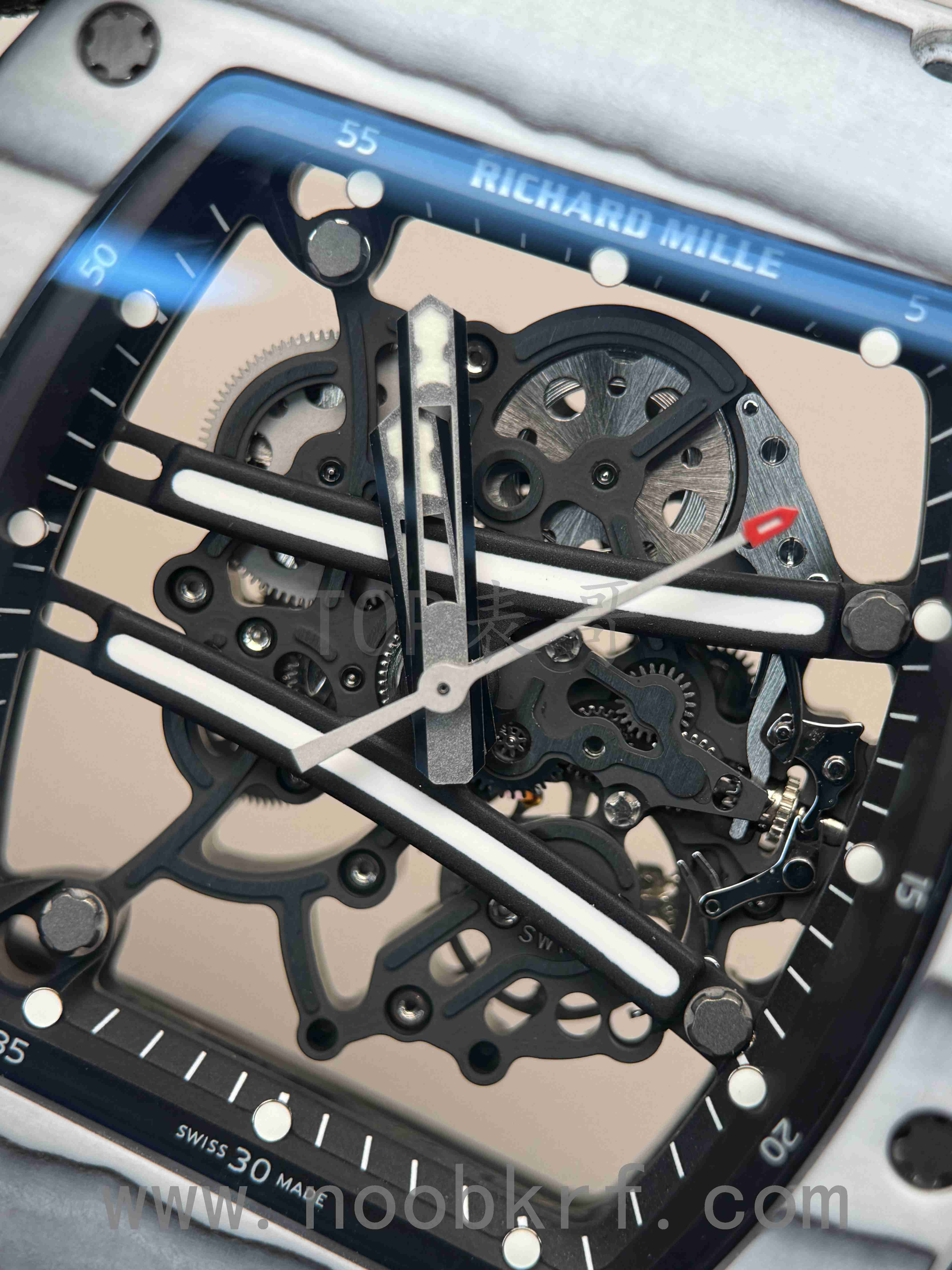 hello,大家好,我是TOP表哥,今天带给大家的腕表评测来自一款改装定制款式的理查德米勒061白跑道ntpt表壳,搭载的是2026年最新版本的国产化vaucher的RMUL2机芯版本。