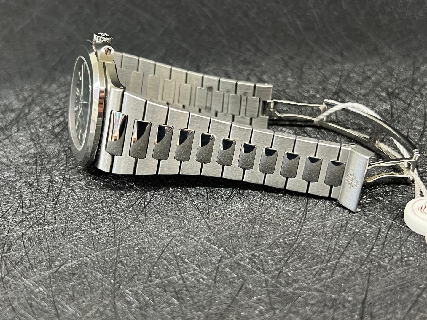 表带:表带同样采用不锈钢材质,每一节表链都保持着方中带圆的设计风格,搭配 Fliplock 折叠式保险扣,扣侧镌有百达翡丽经典的 Calatrava 标识,佩戴贴合手腕。
