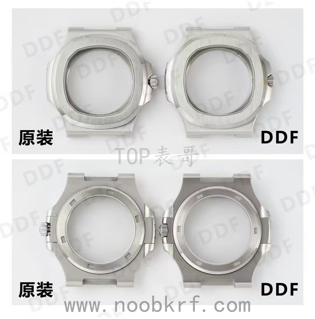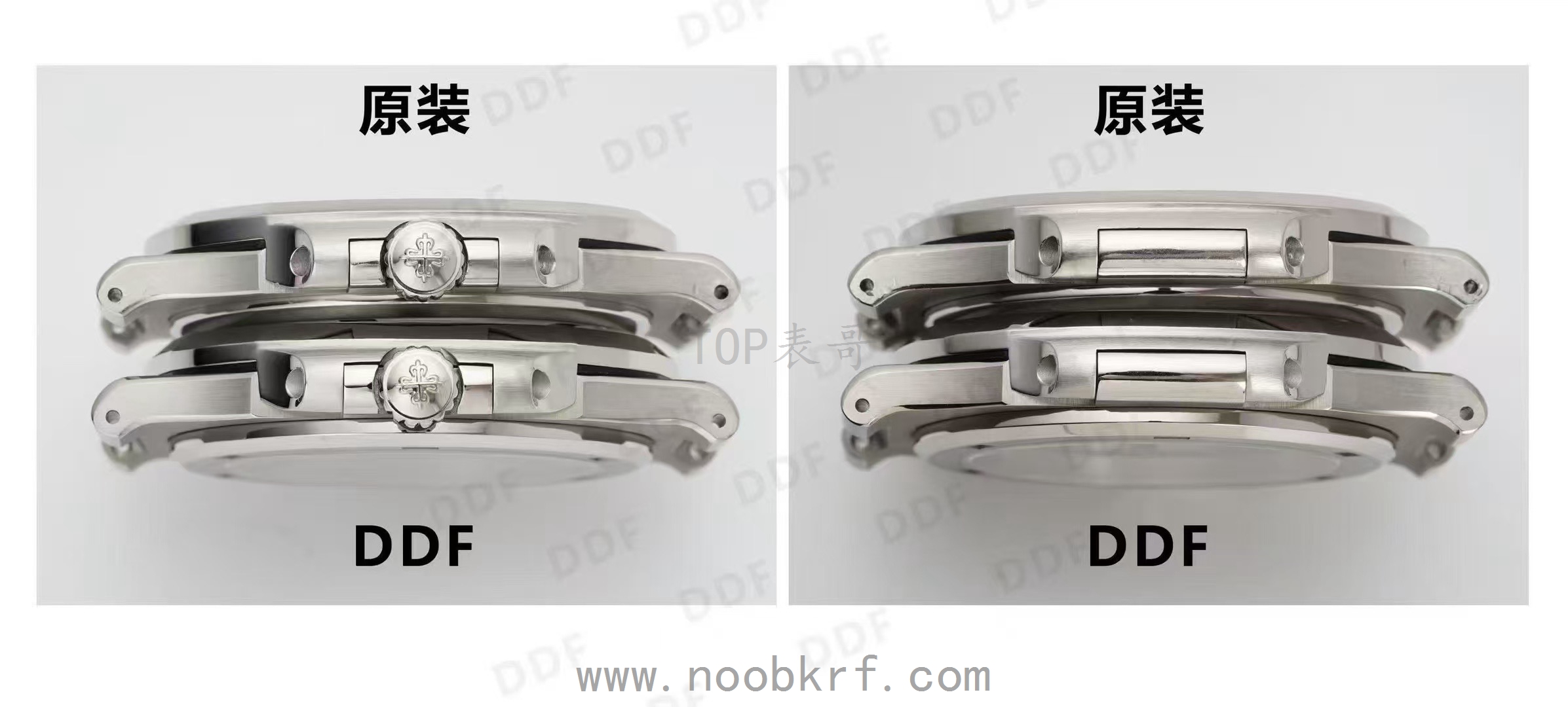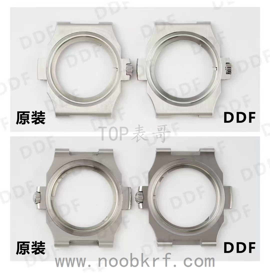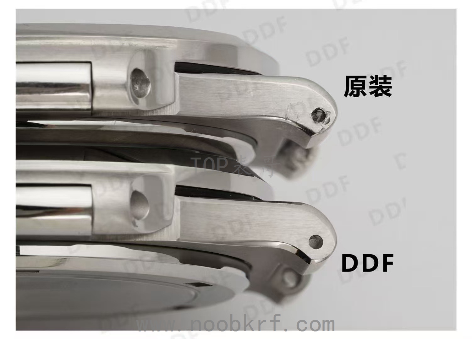 左侧对比中,DDF 表冠的纹路、造型与原装表冠完全一致;右侧对比中,DDF 表壳的表带连接位的金属切削工艺、线条弧度与原装的工艺质感几乎无差异。