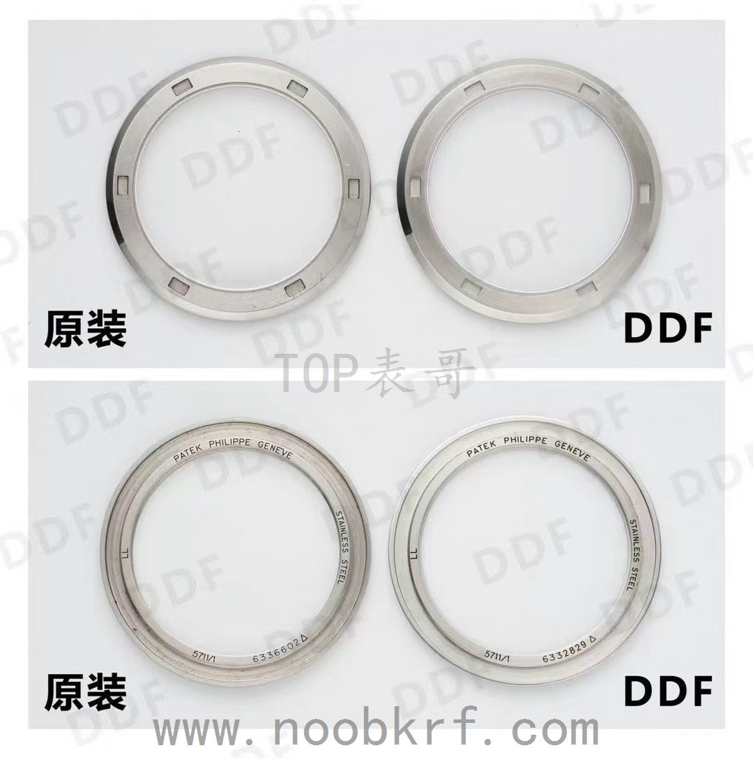 上半部分表圈固定位,原装为方形凹槽设计,DDF 为矩形凹槽设计,形状细节存在微小差异;下半部分表圈刻字,DDF 的 “PATEK PHILIPPE GENEVE” 字样、字体大小、刻字深度与原装完全一致,型号编码的呈现方式也高度契合。