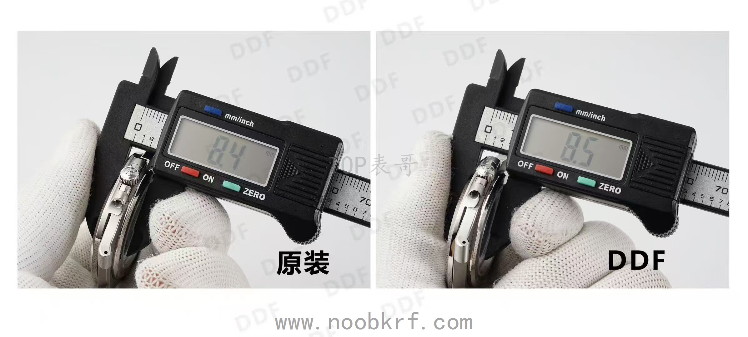 使用数显游标卡尺测量,原装表壳厚度为 8.4mm,DDF 版本厚度为 8.5mm,两者厚度差异仅 0.1mm,在工艺精度上体现出对原版的贴近性。