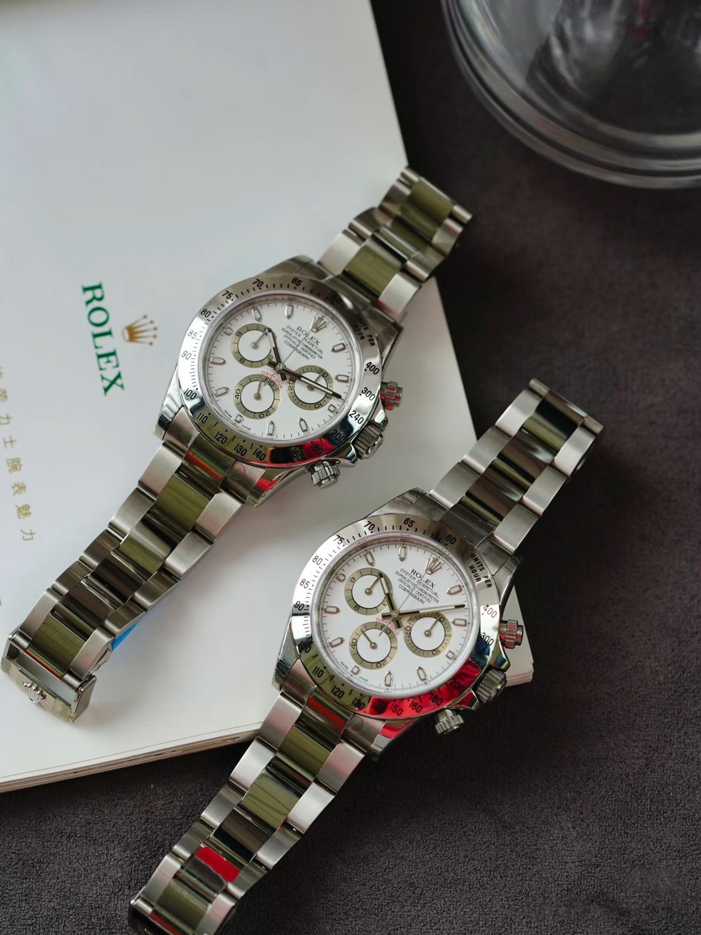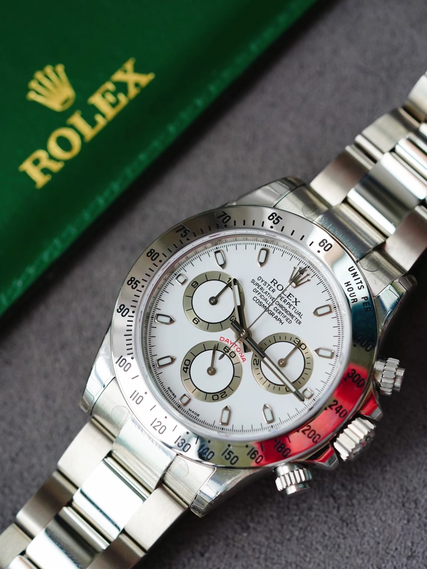 外观上,该款采用40mm标准904L蚝式钢表壳,搭配固定钢质测速计表圈,表冠配备三扣锁与护肩,防水达100米,蓝宝石水晶玻璃带防反光涂层。经典白盘搭配三个黑色计时小表盘,18K白金立体夜光时标,生产期间历经多次迭代:2002年表圈字体加粗,2004年指针加粗,2006年盘面边缘添加品牌及表号印记,后期部分版本升级长效蓝色夜光。表带为904L钢蚝式三排链节,折叠保险扣带易调链节,佩戴舒适便捷。