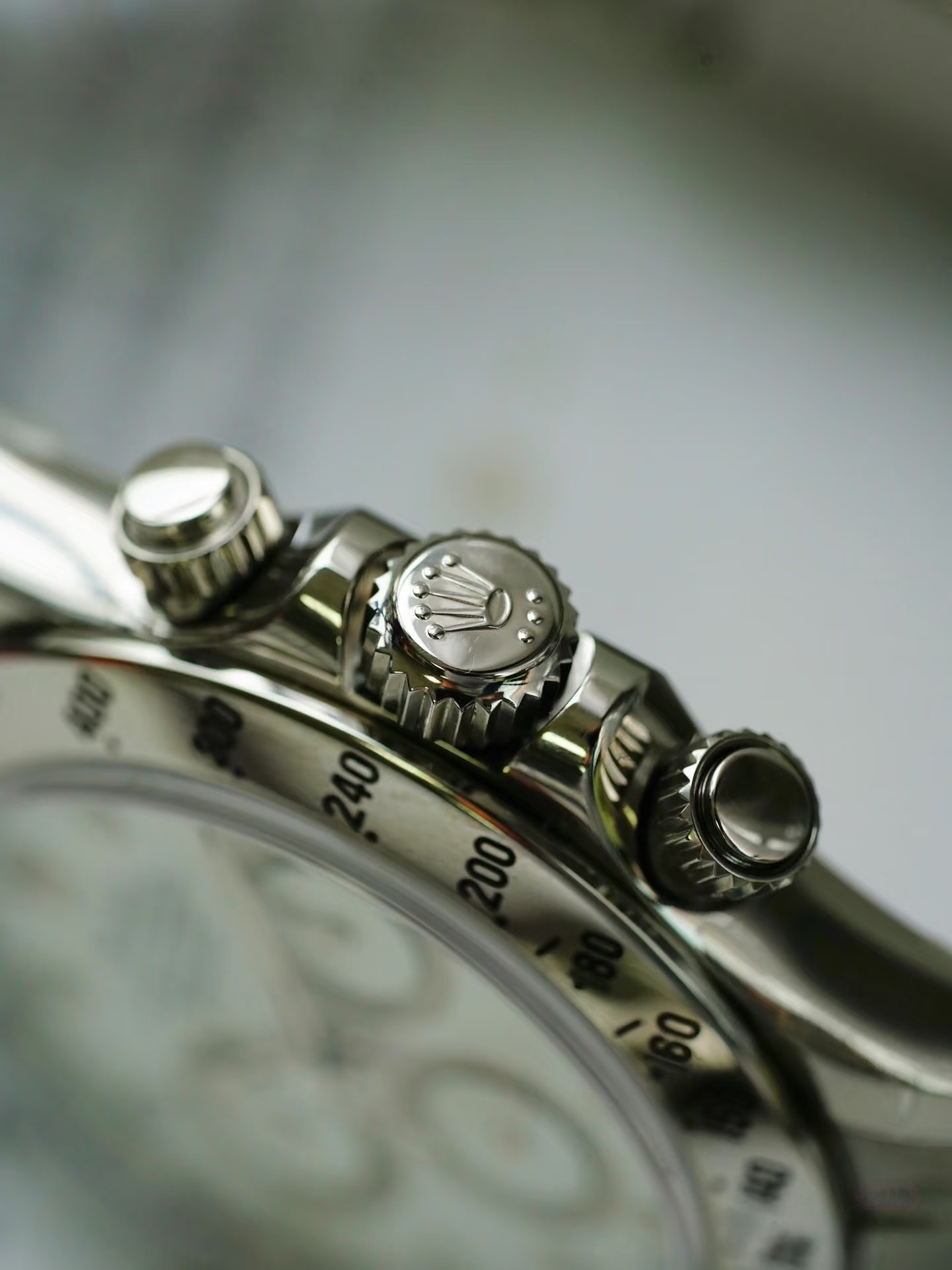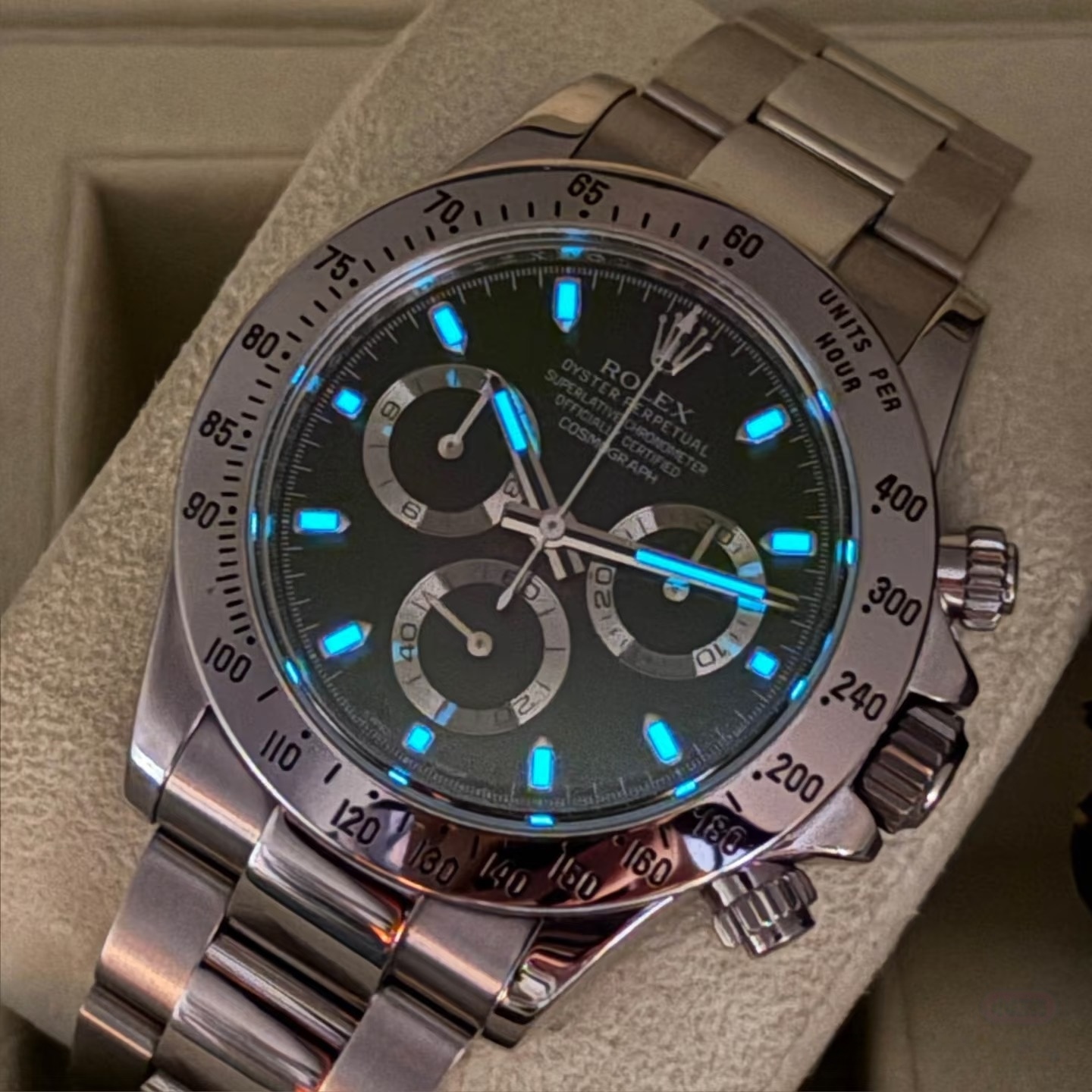 2013 年前后,劳力士将 116520 的夜光材质从Super-LumiNova(绿色夜光) 全面切换为Chromalight(蓝色夜光,劳力士自研),蓝色夜光的持久性和在黑暗中的辨识度更高;2016 年出厂的 116520,必然是蓝色 Chromalight 夜光;绿色夜光仅出现在 2013 年前的老款中;不存在同一枚原装表同时有绿、蓝两种夜光的情况,补夜光的表在二手市场价格会大幅折损。
