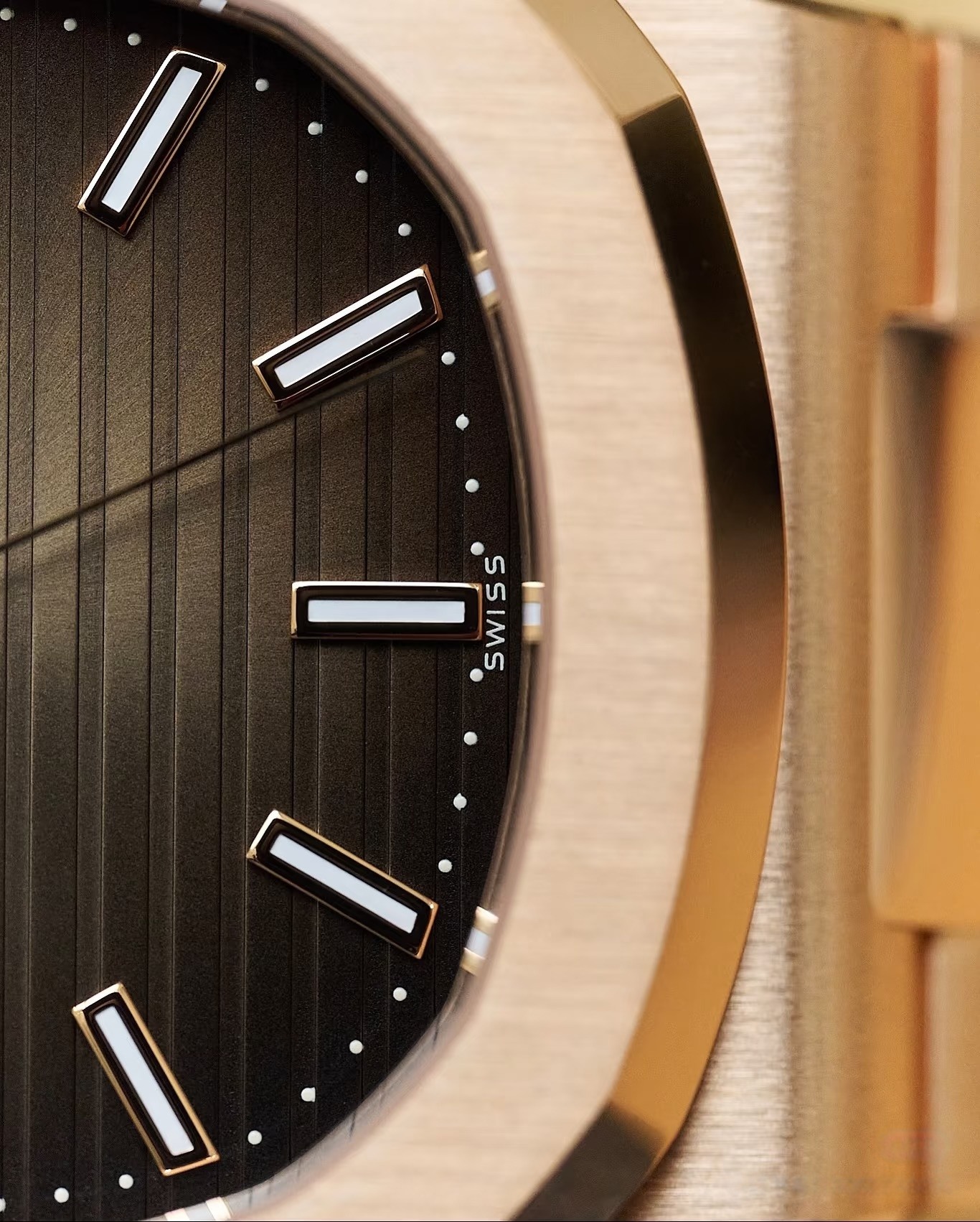 表盘采用深棕色渐变旭日纹设计,是其标志性特征,光线照射下呈现自然渐变光泽,层次感十足;表面布满水平日内瓦压纹,既提升质感,又能防反光,保障读时清晰。