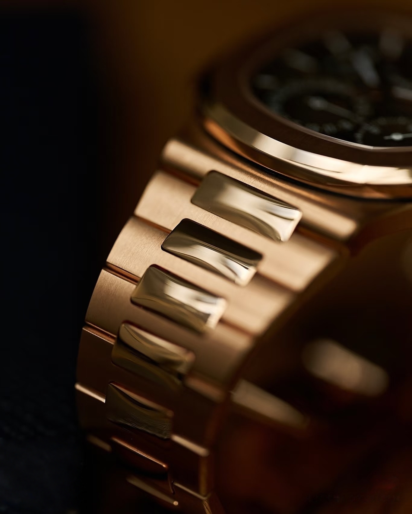 钢带与表壳采用一体式设计,同样选用18K 5N玫瑰金,与表壳完美衔接,质感统一。链节圆润,经抛光与拉丝处理,触感细腻,佩戴不刮腕,舒适度极高。