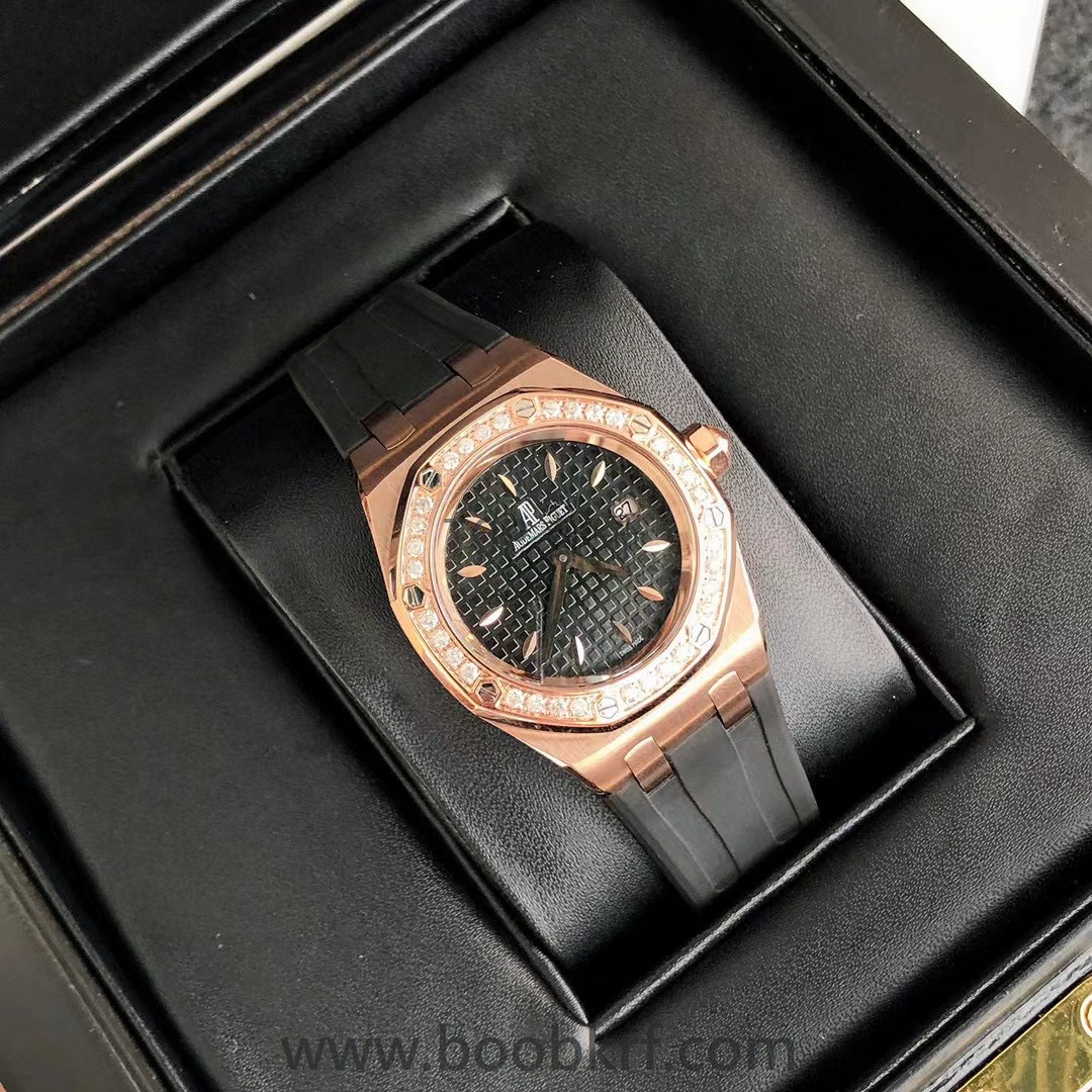 爱彼皇家橡树系列型号67601石英腕表,皇家橡树系列独有的八角形外观还拥有爱彼独特的设计风格也将女士优雅风格融入其中,深受女明星们的爱戴,即使只有33毫米的小尺寸,也将爱彼独有的纯净美感与刚毅线条展现的淋漓尽致而镶满钻石的表圈也为佩戴的女士增添了更多的柔美。(32颗1.6明亮式切割美钻,总重约0.65克拉)巴蒂镶嵌一枚半透明凸面蓝宝石,搭载瑞士进口石英机芯,拥有实用的日历显示功能,女士们佩戴起来不会显得沉重 ,配专柜最新全套包装发货!这种货一般数量不是很多哦,所以手速要快
