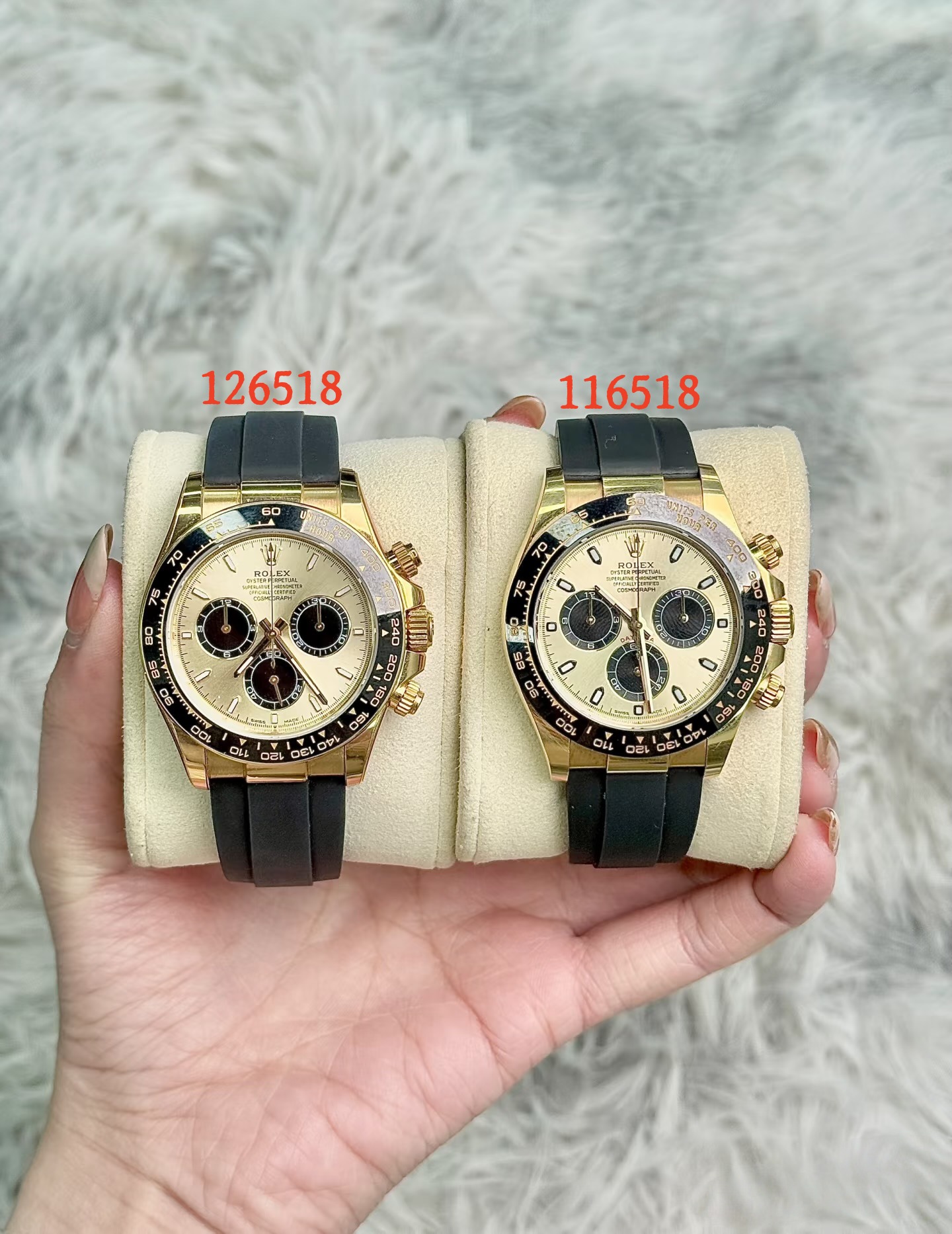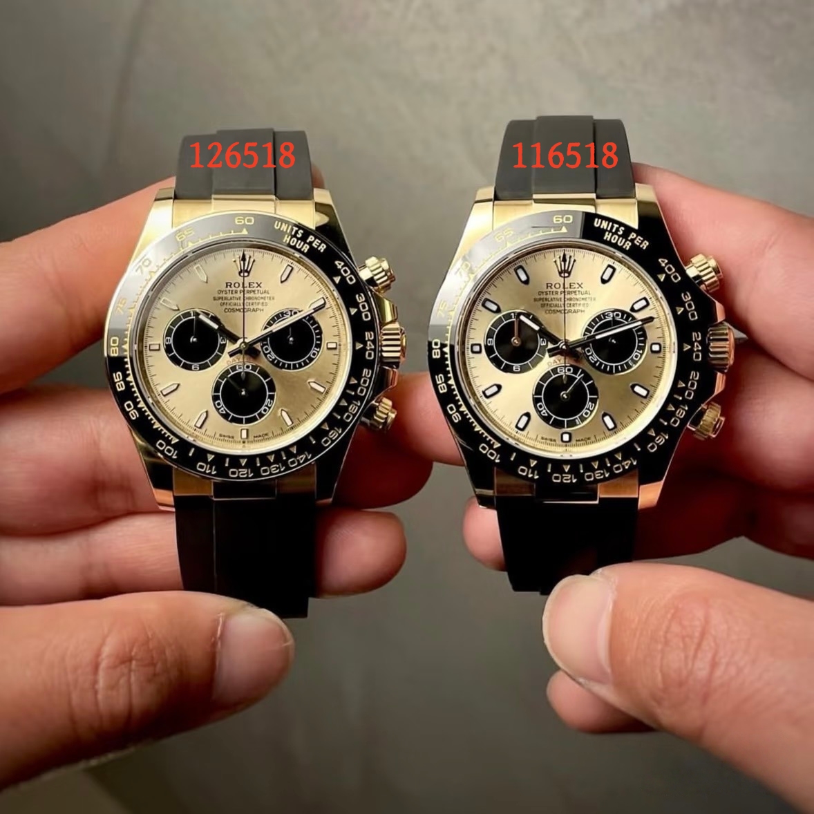 作为迪通拿系列核心热门款,“余文乐”腕表分为新款126518LN与老款116518LN,二者核心差异清晰且各有特色。机芯上,新款搭载4131型自动上链计时机芯,老款则为4130型,虽均为72小时动力储存,但新款精准度与抗磁性能更优;外观上,新款黑色Cerachrom陶瓷圈新增18K黄金包边,表圈厚度缩至11.9mm更贴腕,老款无包边且表圈偏厚,同时新款计时圈边缘更细、刻度更清晰。表扣方面,新款配备Glidelock快调装置,调节更便捷,老款为普通折叠扣。价格上,新款公价约32.69万元,二级市场未使用品稳定在45万左右,老款二手价约38-42万元。黄金材质、经典配色与明星效应的三重加持,让新旧款均保值性出众,腕间一枚,既是时光的见证者,亦是不张扬的品味宣言。