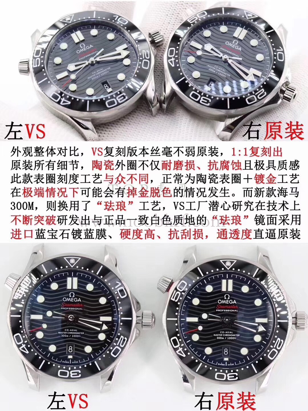 VS新品:欧米伽全新海马300 米 42MM 潜水表 搭载钢带抢先体验!1:全新海马300 升级改为透视底(老款密底)2:全新海马300升级为与正品一致全陶瓷表盘(老款为普通表盘)3:升级陶瓷圈上的刻度和字 采用“白珐琅”工艺 不易变黄 有光泽。(老款为银灰色)4:表针针形和老款不同,针形加大,读时更清晰5:表带(主要是头粒)和扣与旧款不同,新海马300扣可以调节长度。