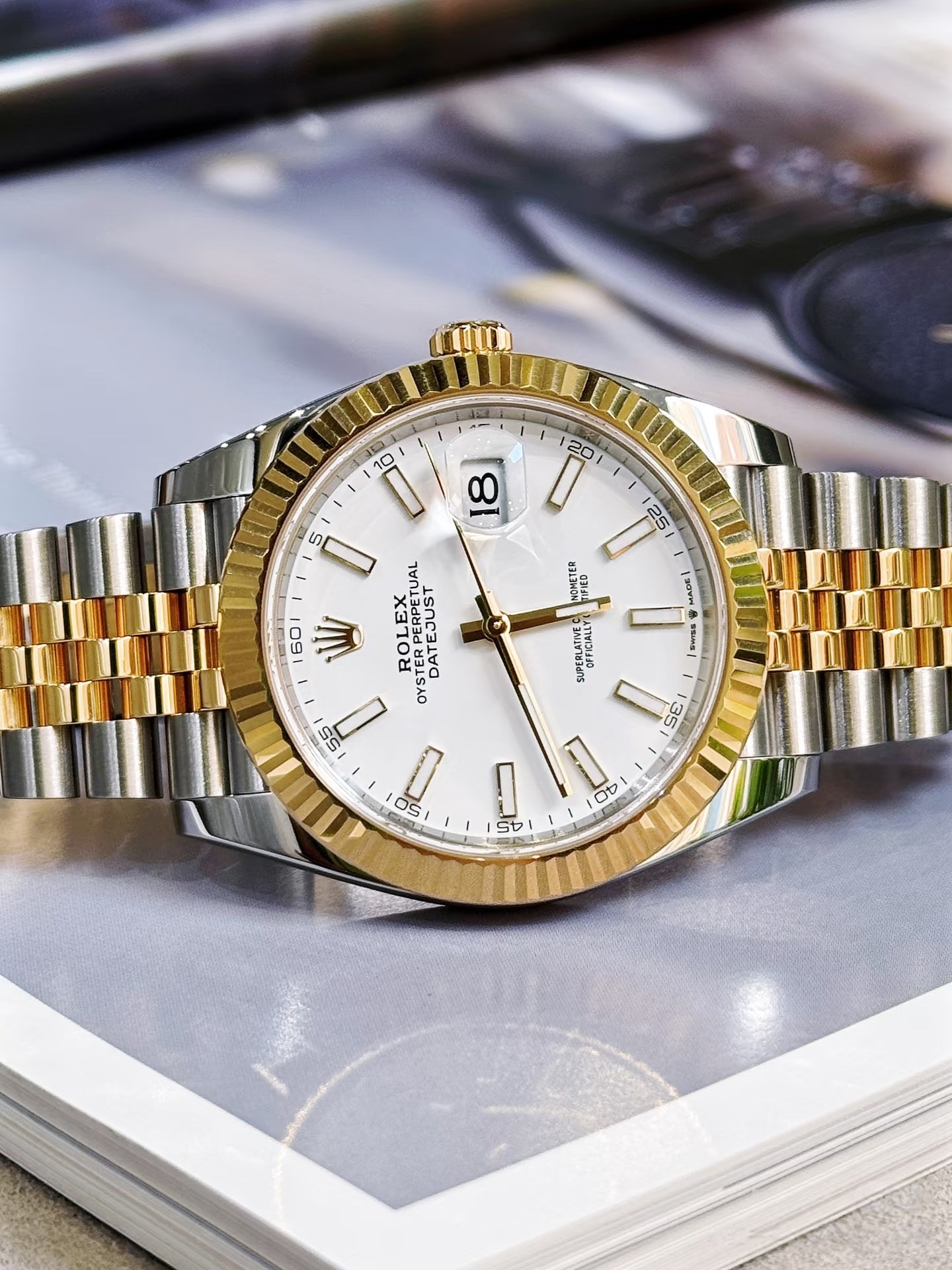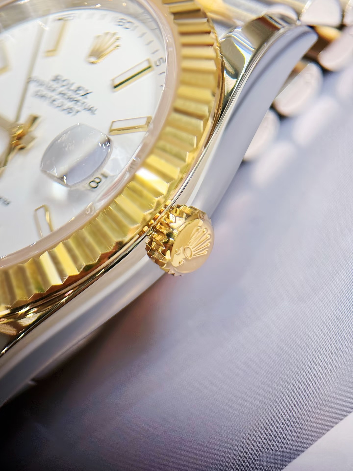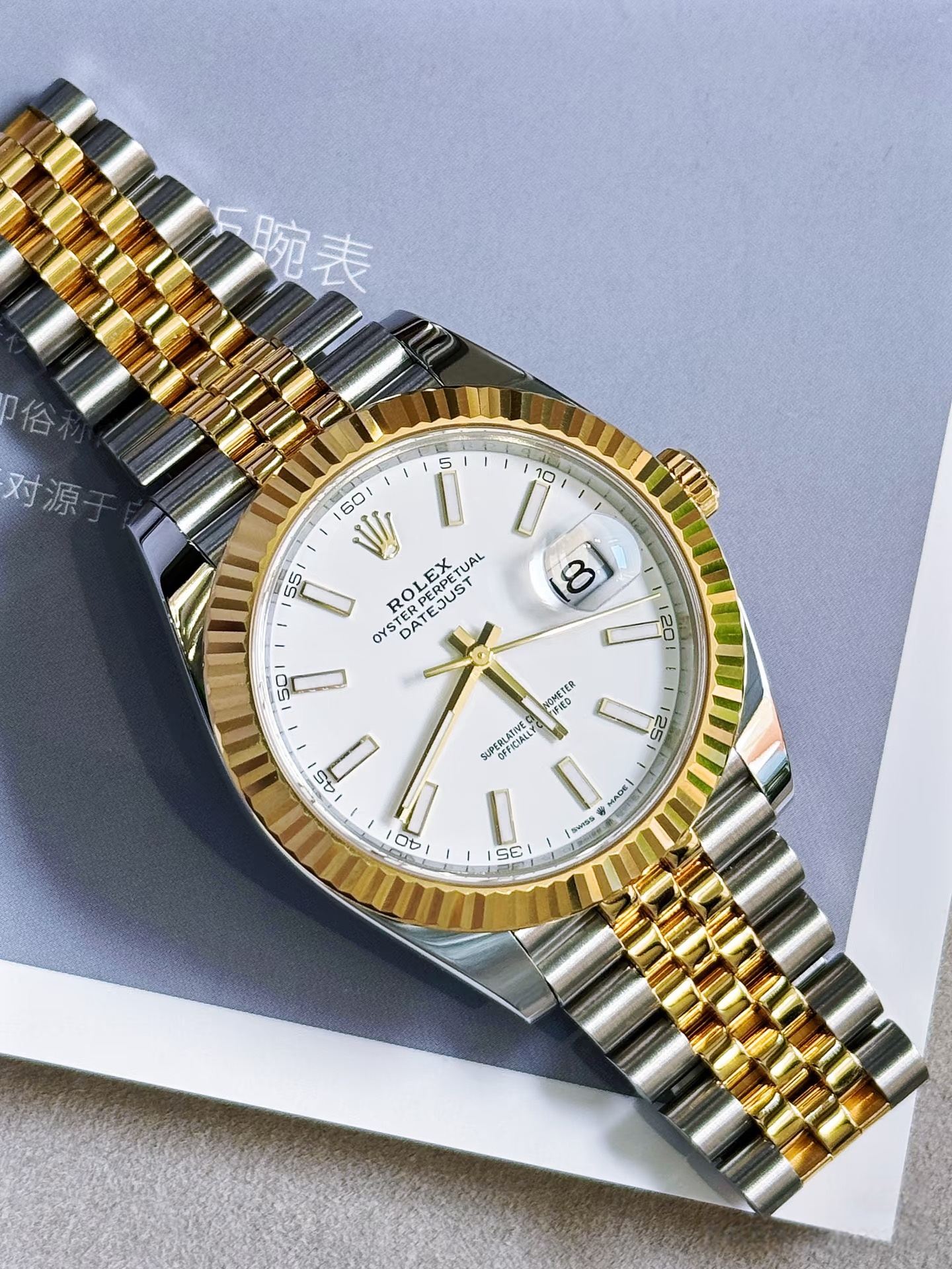 粹白白单调莹润通透温润,太阳纹刻纹折射出细腻光泽,适配商务、通勤等雅致白形成柔和对比白简约,也是该型号白盘的标志性特色之一盘面颜色是腕表灵魂,采用劳力士独家调配的银灰渐变色,区别于普通灰色的单调,呈现出层次丰富的高级质感。它以银调为基底,从盘面中央向边缘渐变为深邃灰,过渡自然柔和,自带冷调金属光泽,简约大气且极具辨识度,光线照射下渐变层次更清晰,适配商务、通勤等多场景,彰显佩戴者沉稳雅致的品味。点睛之笔是12个棒状夜光时标,与银灰渐变底色完美呼应,丰富视觉层次又不破坏渐变美感,兼顾实用性与颜值,契合这款腕表的高端简约调性。