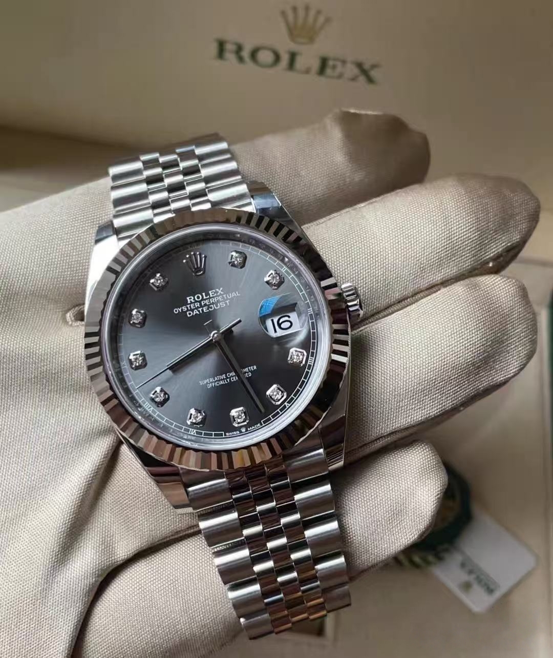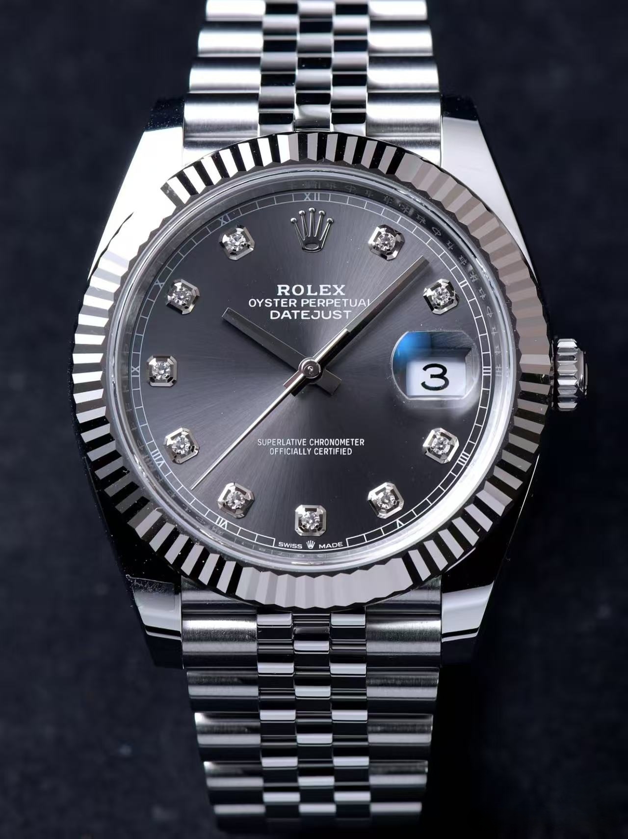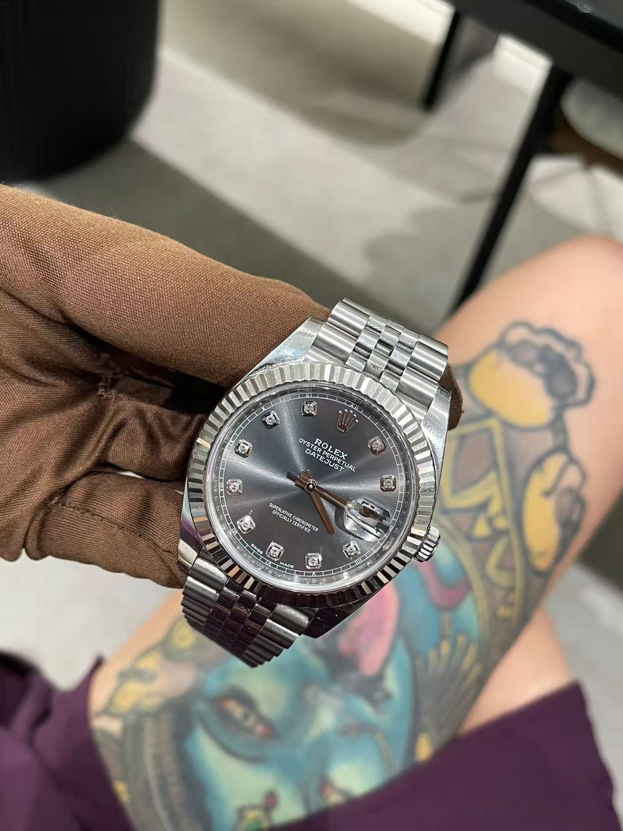 clean工厂改名后为C plus工厂,在复出后推出最了一款让大家心心念念已经的劳力士日志41毫米灰色表盘钻石刻度腕表,又名灰钻41日志,译音“会赚”。