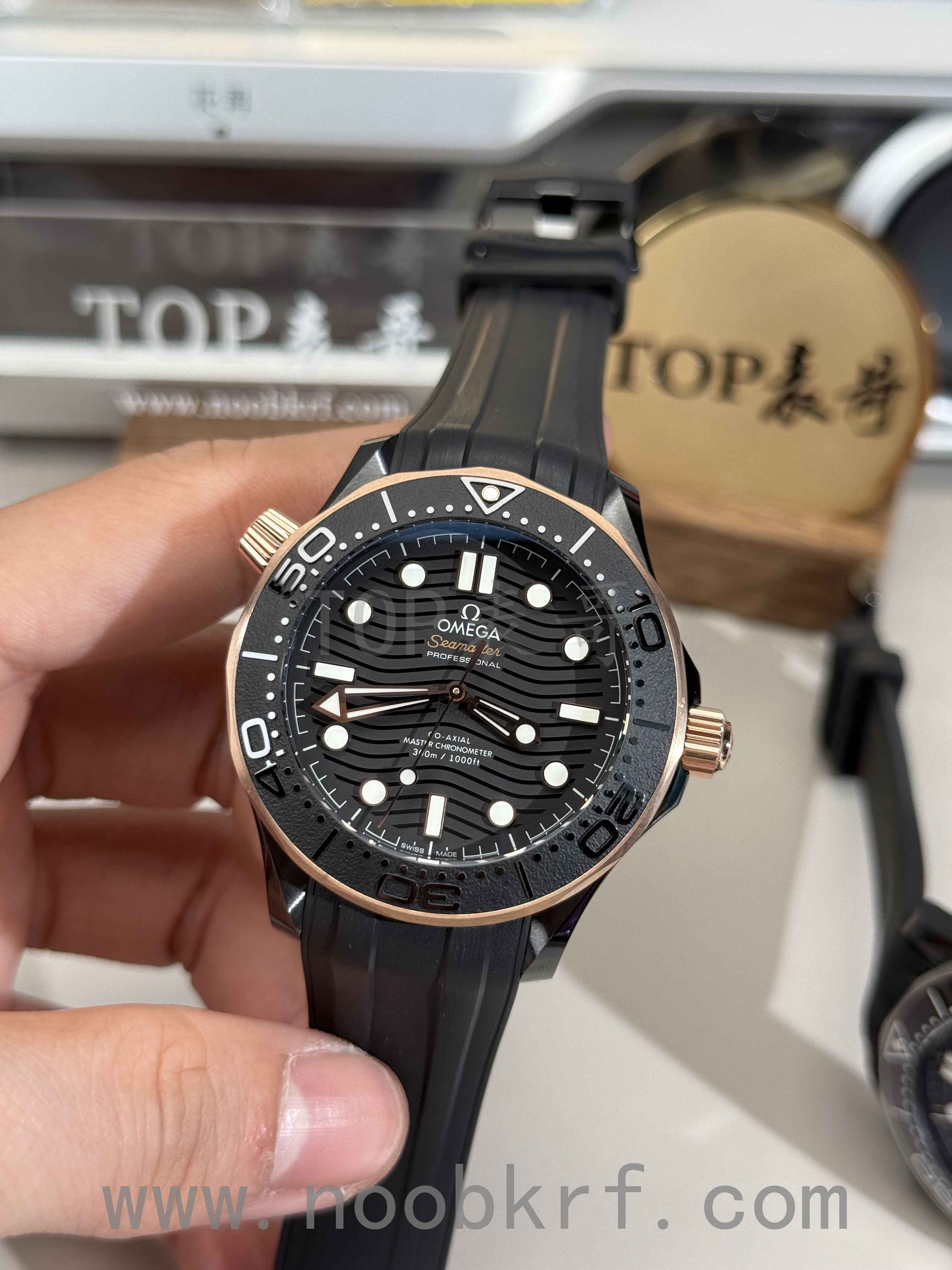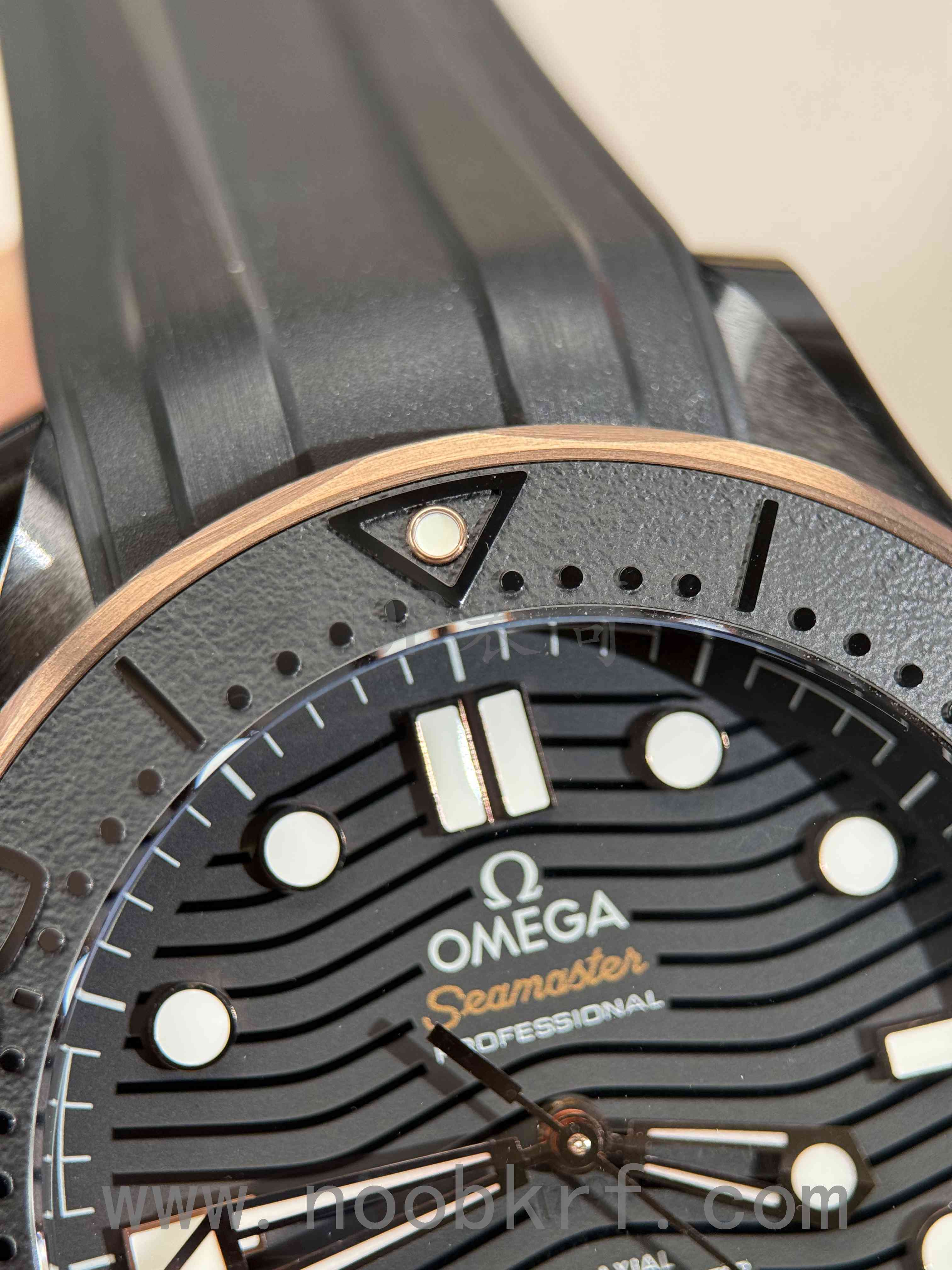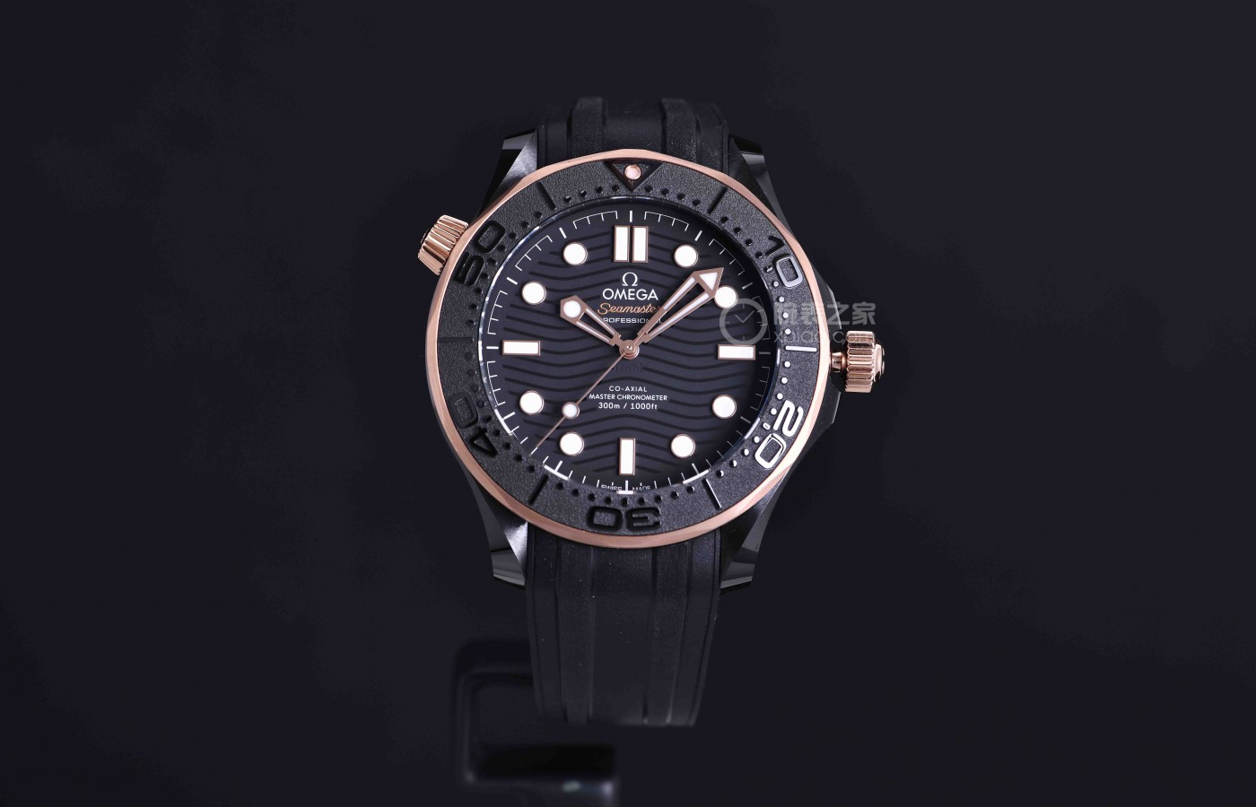 在表壳材质上,欧米茄几乎用上了品牌最前沿的技术成果。表壳为黑色氧化锆陶瓷(ZrO₂),质地坚硬、抗划耐磨、不易过敏,还具备天然的防磁属性。表圈为同材质陶瓷打造,并辅以Sedna 18K金的刻度装饰,不仅提升了细节层次,也让表圈更易读。所谓Sedna金,是欧米茄自2012年研发出的专利材质,其成分中加入了铜与钯,可以确保颜色更加持久和稳定。整体观感上,这款表融合了深沉与贵气,既有潜水表的专业属性,又兼顾了日常佩戴中的美观与耐看。