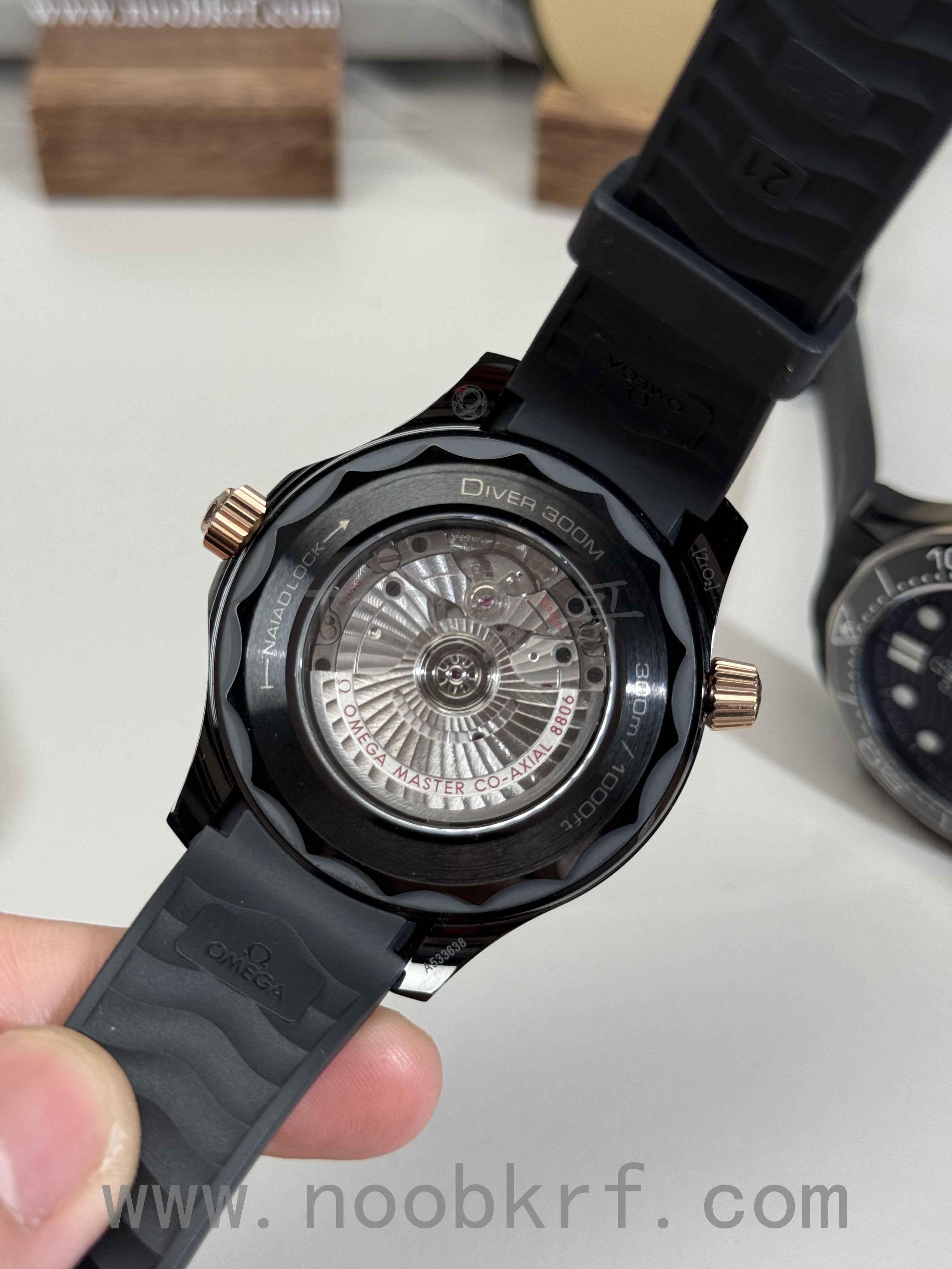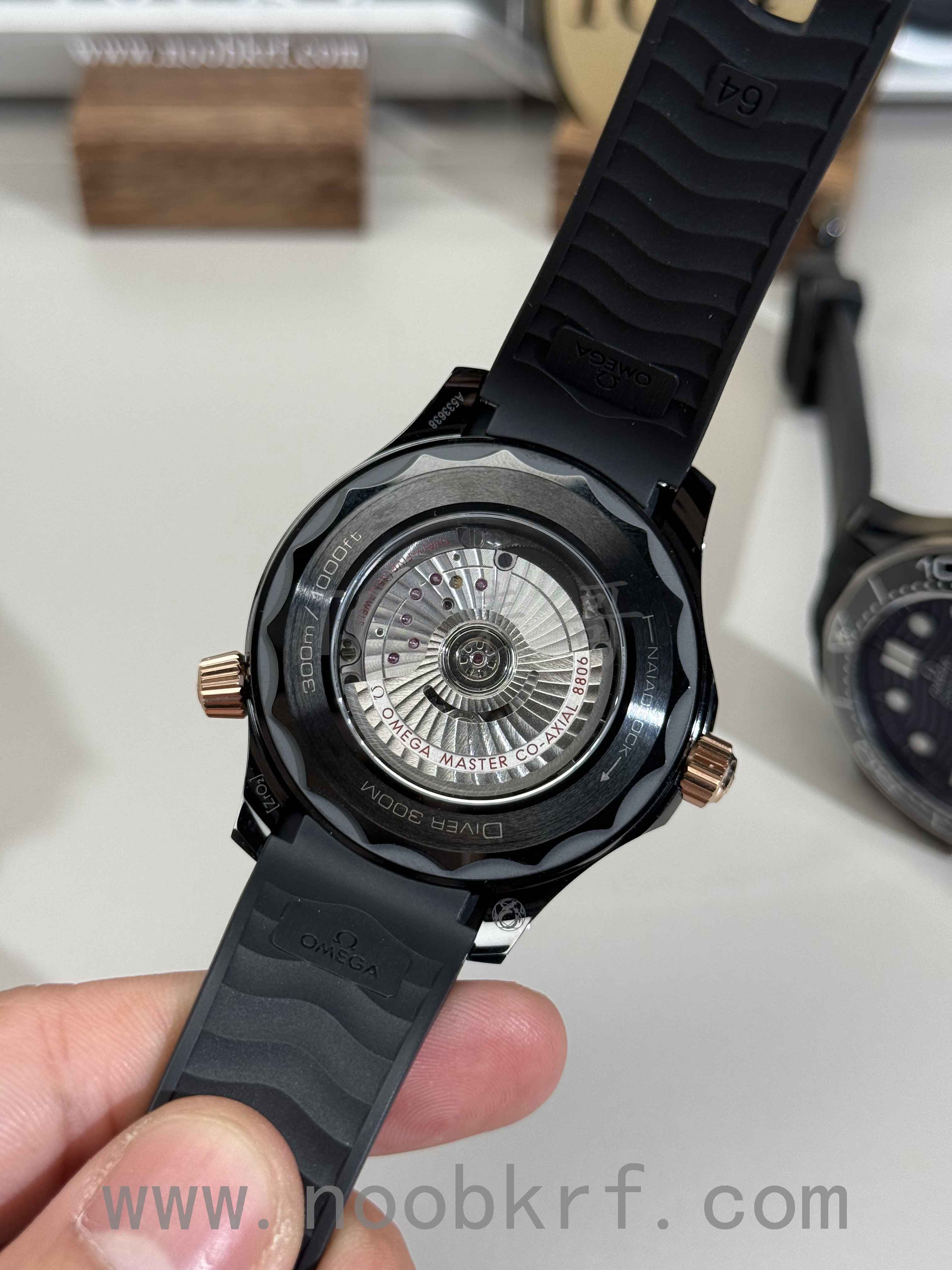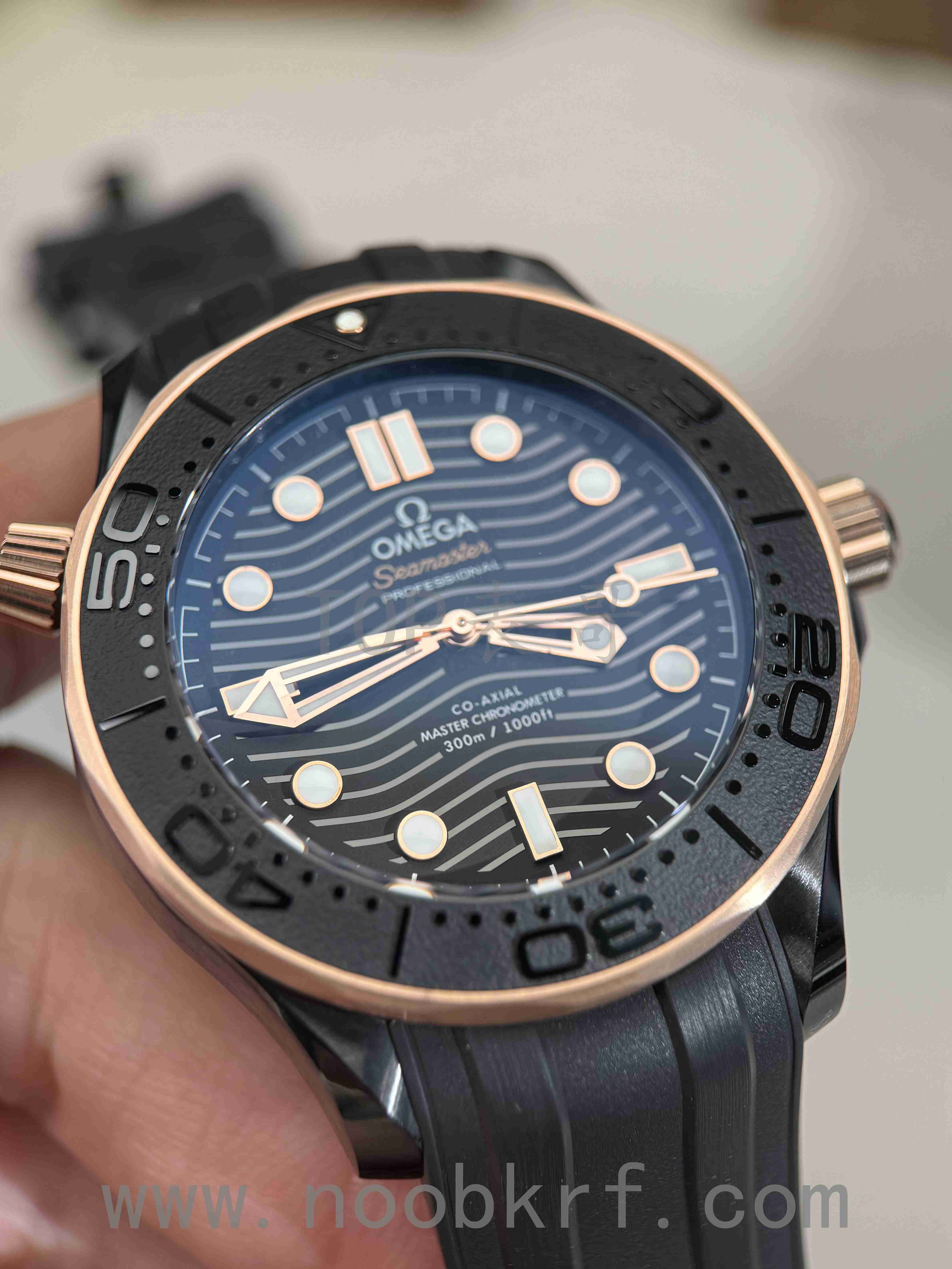 在表壳材质上,欧米茄几乎用上了品牌最前沿的技术成果。表壳为黑色氧化锆陶瓷(ZrO₂),质地坚硬、抗划耐磨、不易过敏,还具备天然的防磁属性。表圈为同材质陶瓷打造,并辅以Sedna 18K金的刻度装饰,不仅提升了细节层次,也让表圈更易读。所谓Sedna金,是欧米茄自2012年研发出的专利材质,其成分中加入了铜与钯,可以确保颜色更加持久和稳定。整体观感上,这款表融合了深沉与贵气,既有潜水表的专业属性,又兼顾了日常佩戴中的美观与耐看。