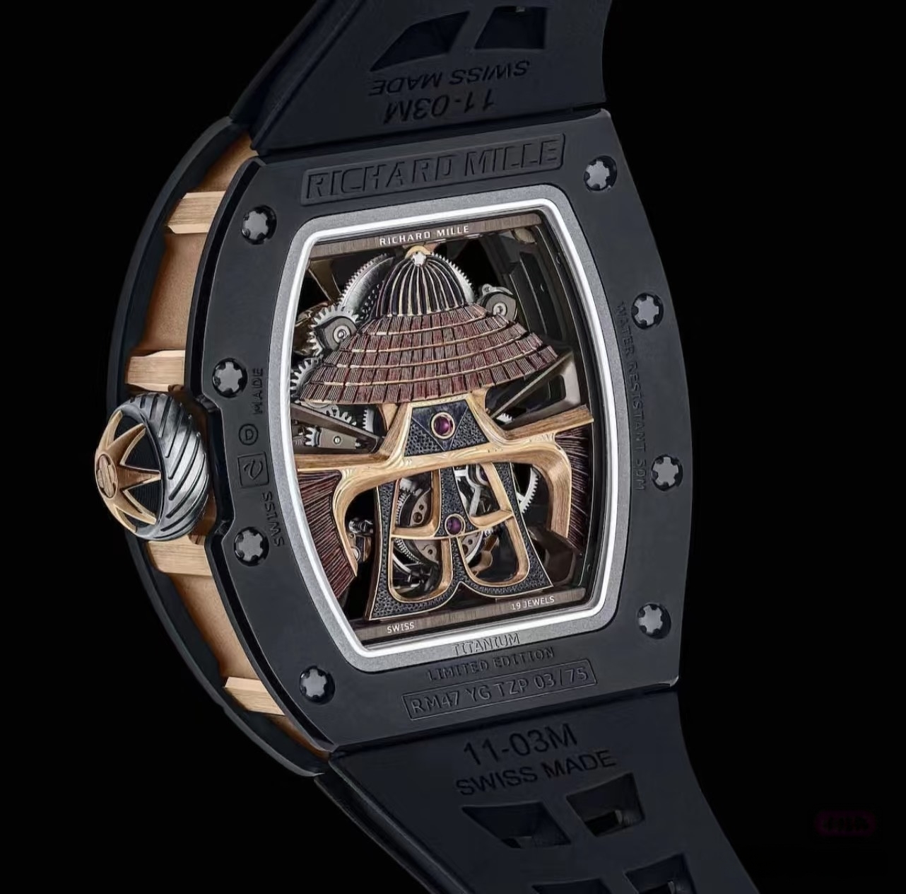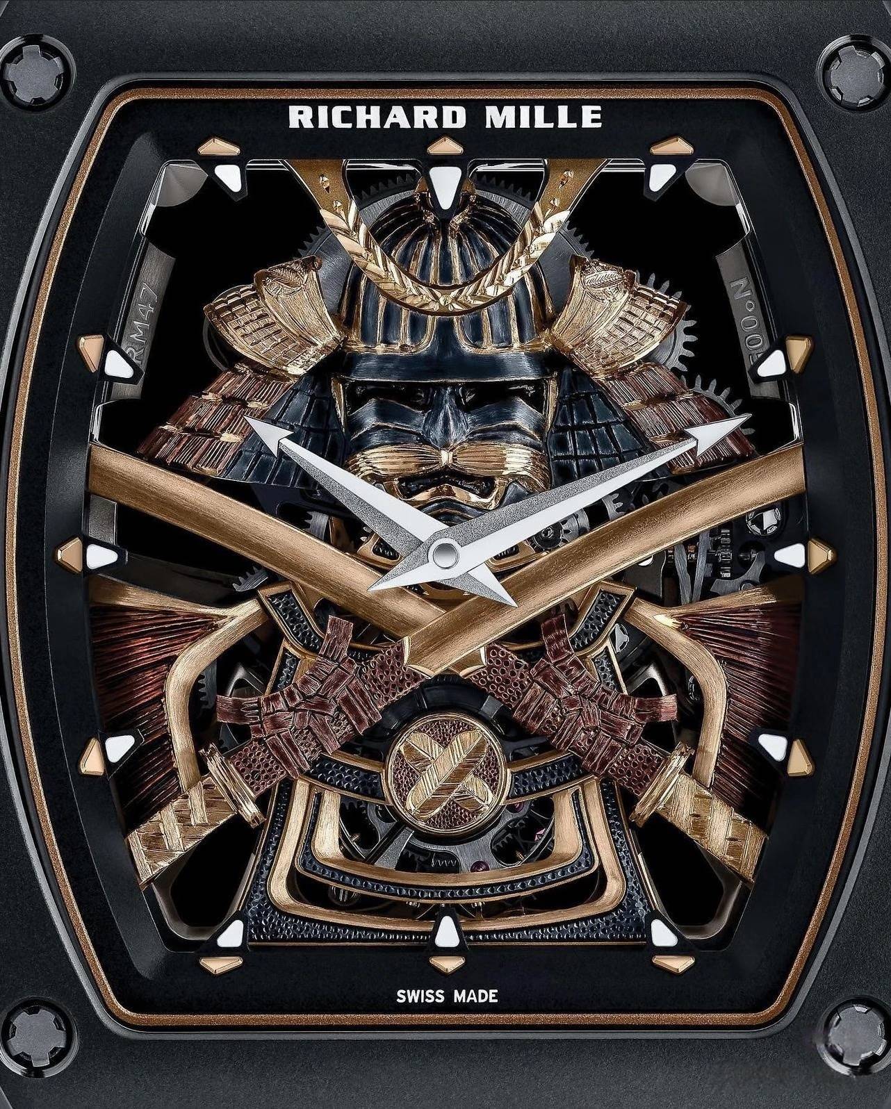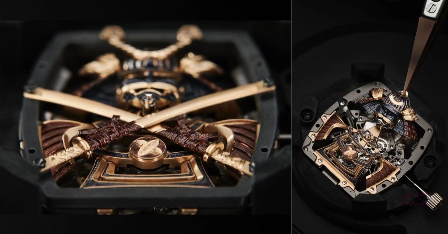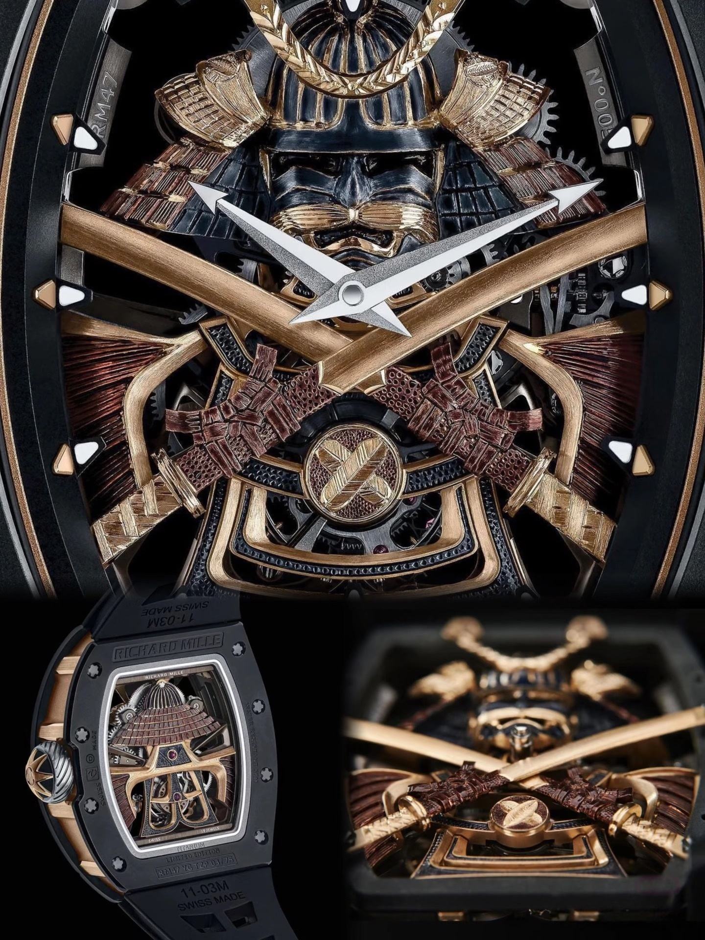 工匠雕刻师 Pierre-Alain Lozeron 说:“在剑和凿子之间,在刀刃的刀刃和雕刻师技术精确定义的切口之间,有许多相似之处可以唤起这些战士的品质和那些被要求的品质之间的相似之处通过我们的艺术工艺品。” 盔甲围绕在手动上链机芯 RM47 的两侧,从正面看最清楚的是用带鞘的武士刀保护它。小时和分钟机芯的底板和镂空桥板采用 5 级钛合金制成,这种合金通常用于航空航天业,并经过黑色 PVD 处理。