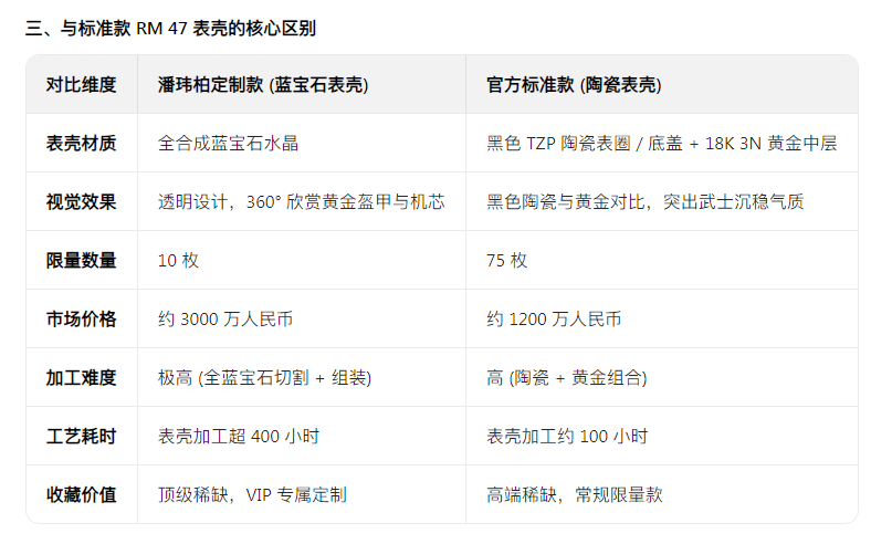价格区间:换壳费用通常为原表价格的1.5-2 倍,RM 47 蓝宝石表壳定制费用约 1800 万人民币