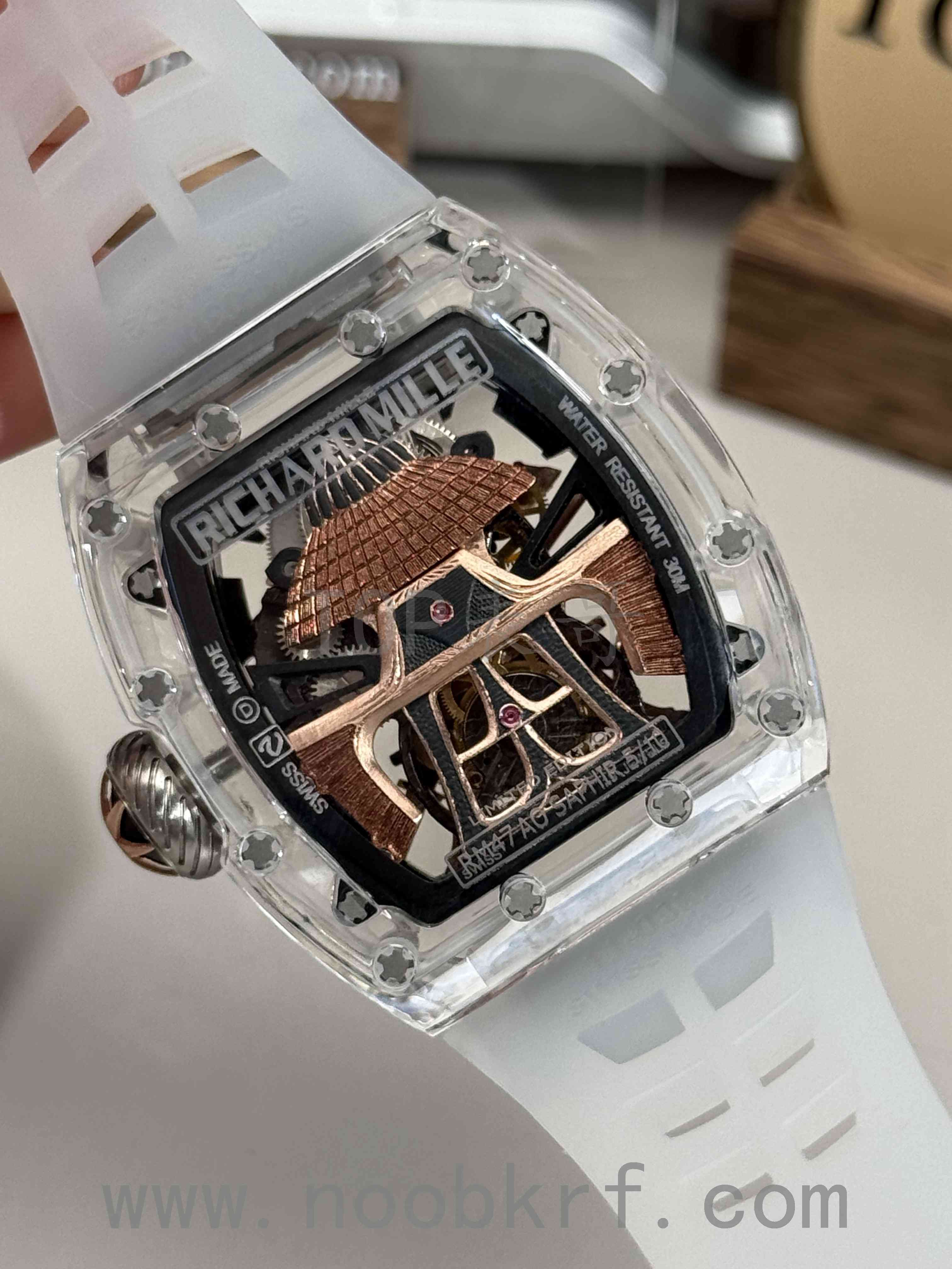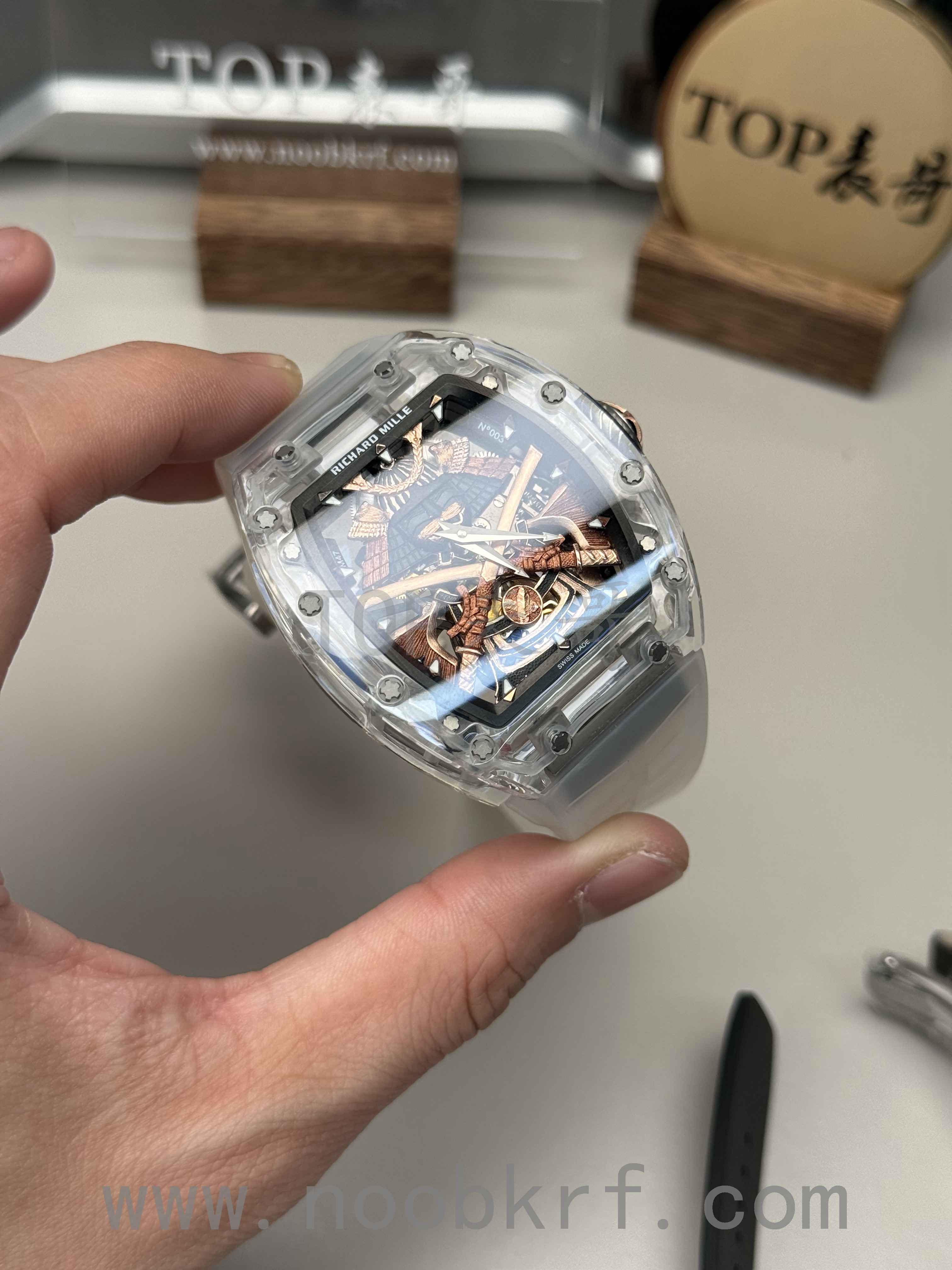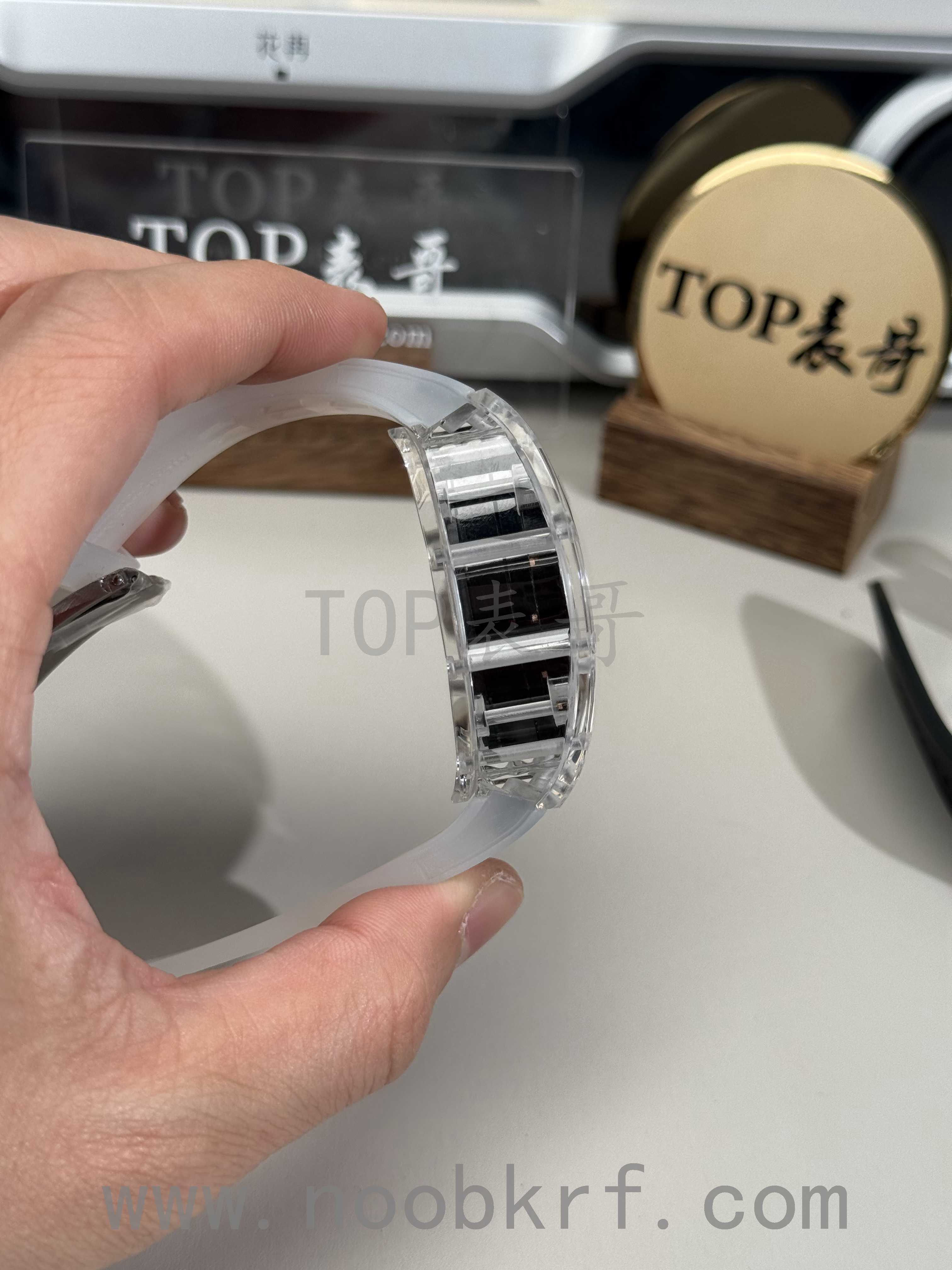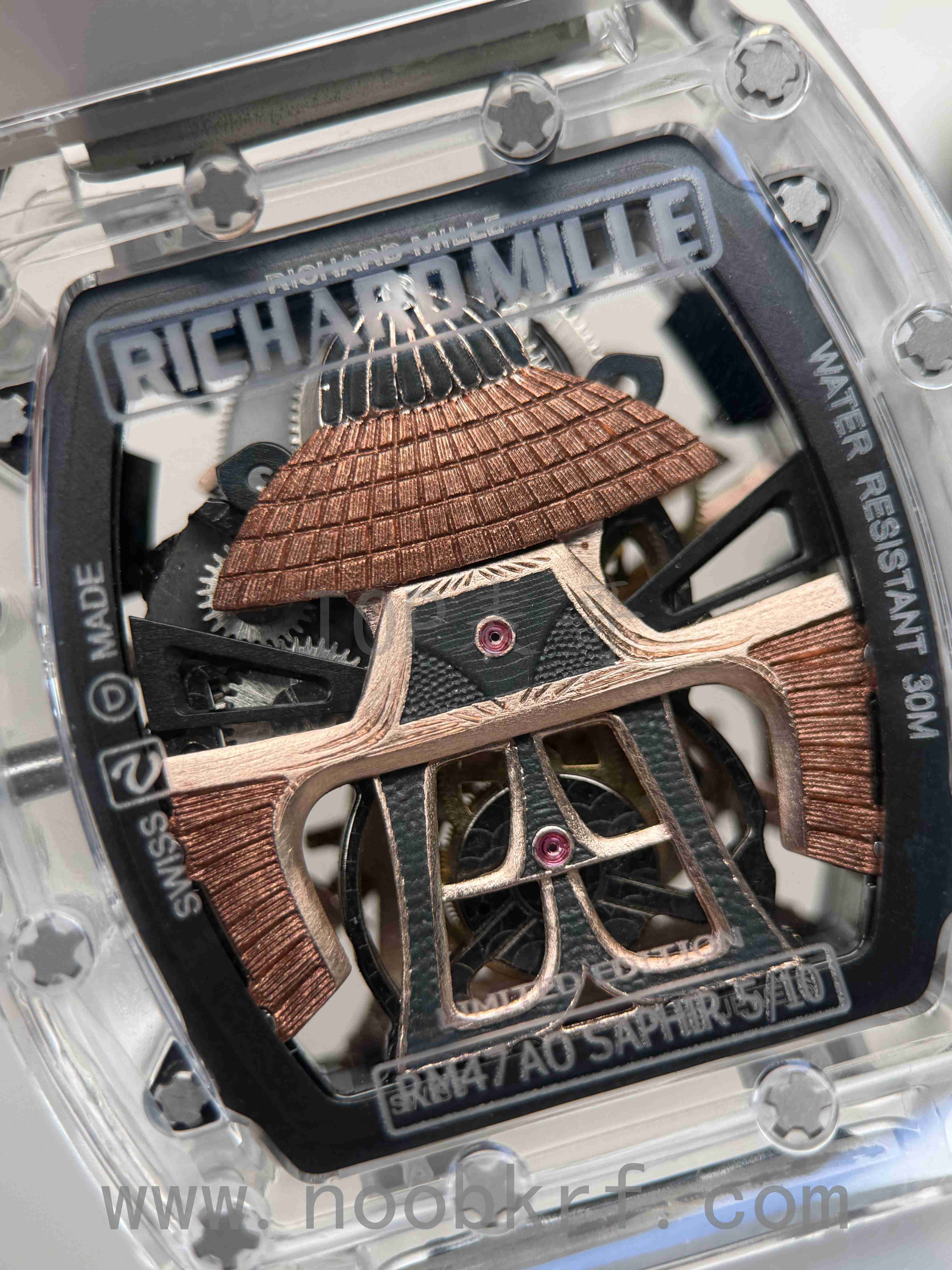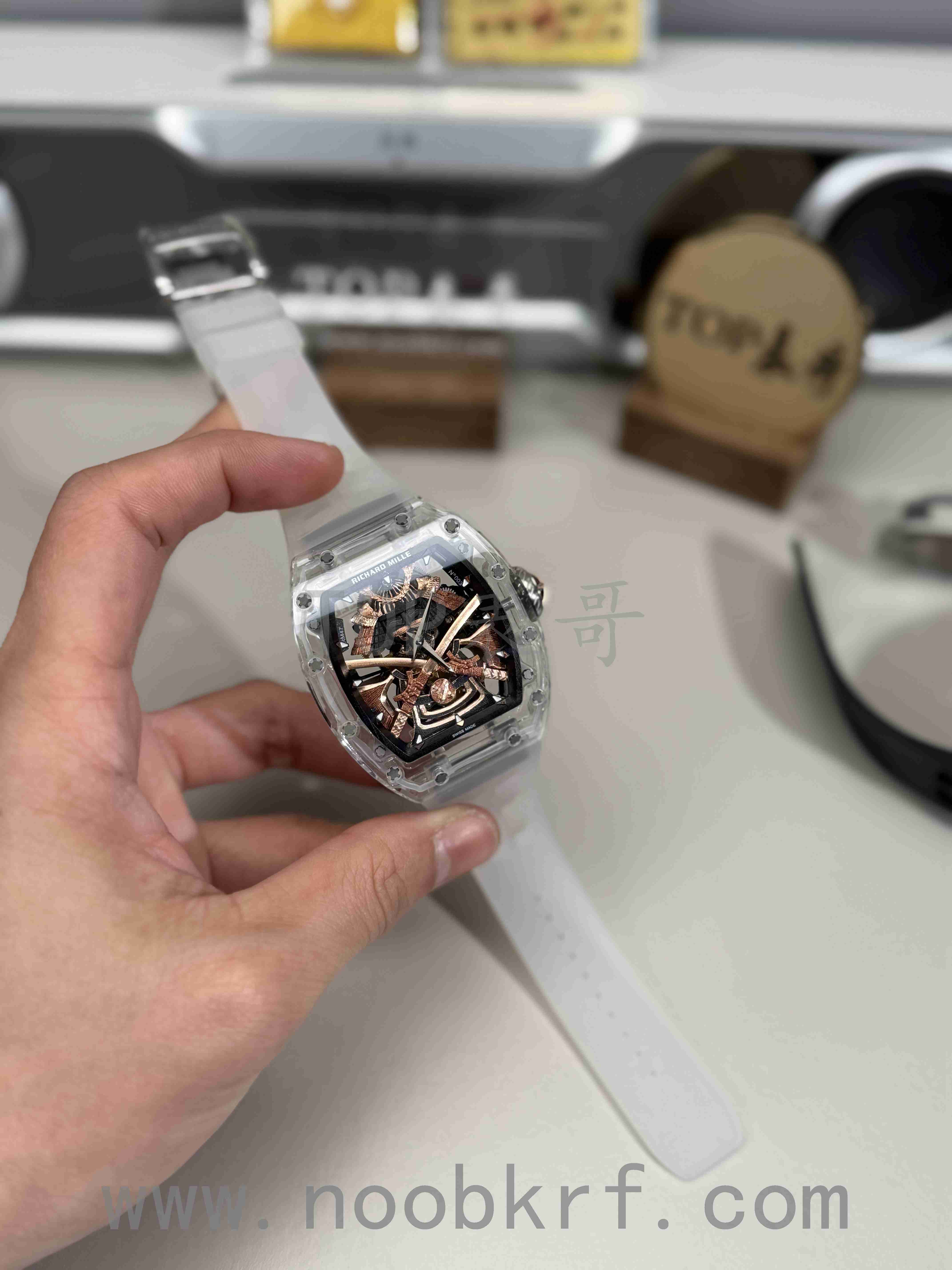 目前理查德米勒后改的蓝宝石表壳版本已经很少有人会找原厂定制改装了,毕竟钱都不是大风刮来的,现在很多表迷都会找国产的蓝宝石表壳版本,毕竟价格上的巨大优势,而且在材质上也是做到了同步。不过表哥在这里要给大家说明一点是,要区分普通工厂的亚克力玻璃表壳,或者好点工厂的真蓝宝石材质,最后就是定制改装CNC技术原装数据表壳版本,今天的这个RM047潘玮柏同款的蓝宝石表壳版本就是属于改装了定制原装数据表壳版本,虽然机芯和人偶没办法做到非常牛逼的程度,不过这个表壳呈现出来的质感与透明晶莹的效果是基本做到原厂一样的效果的,所以大家可以在理查德米勒热门一体机芯技术稳定的055、35-01、35-02、061等款式进行后改的蓝宝石材质表壳版本。