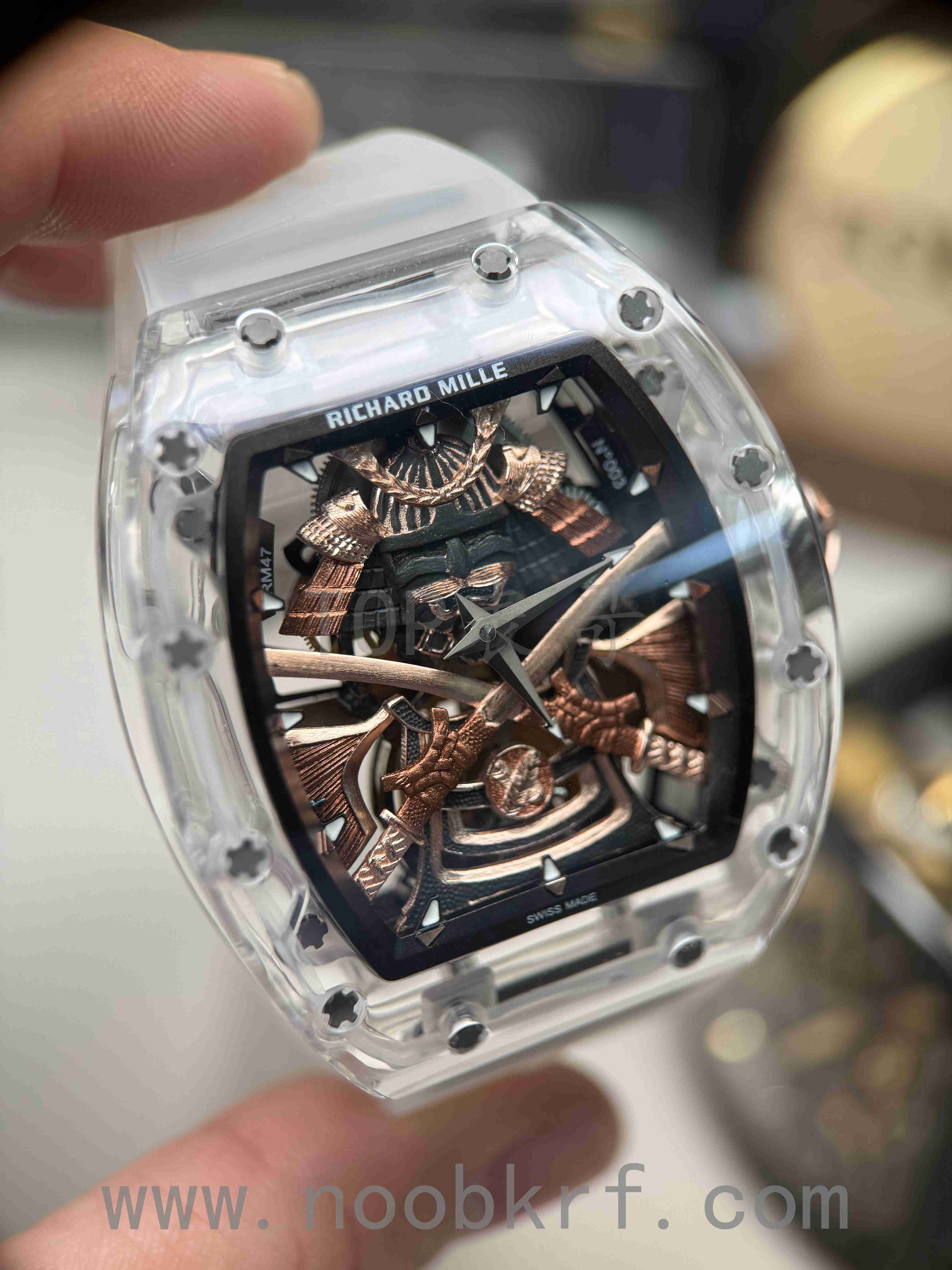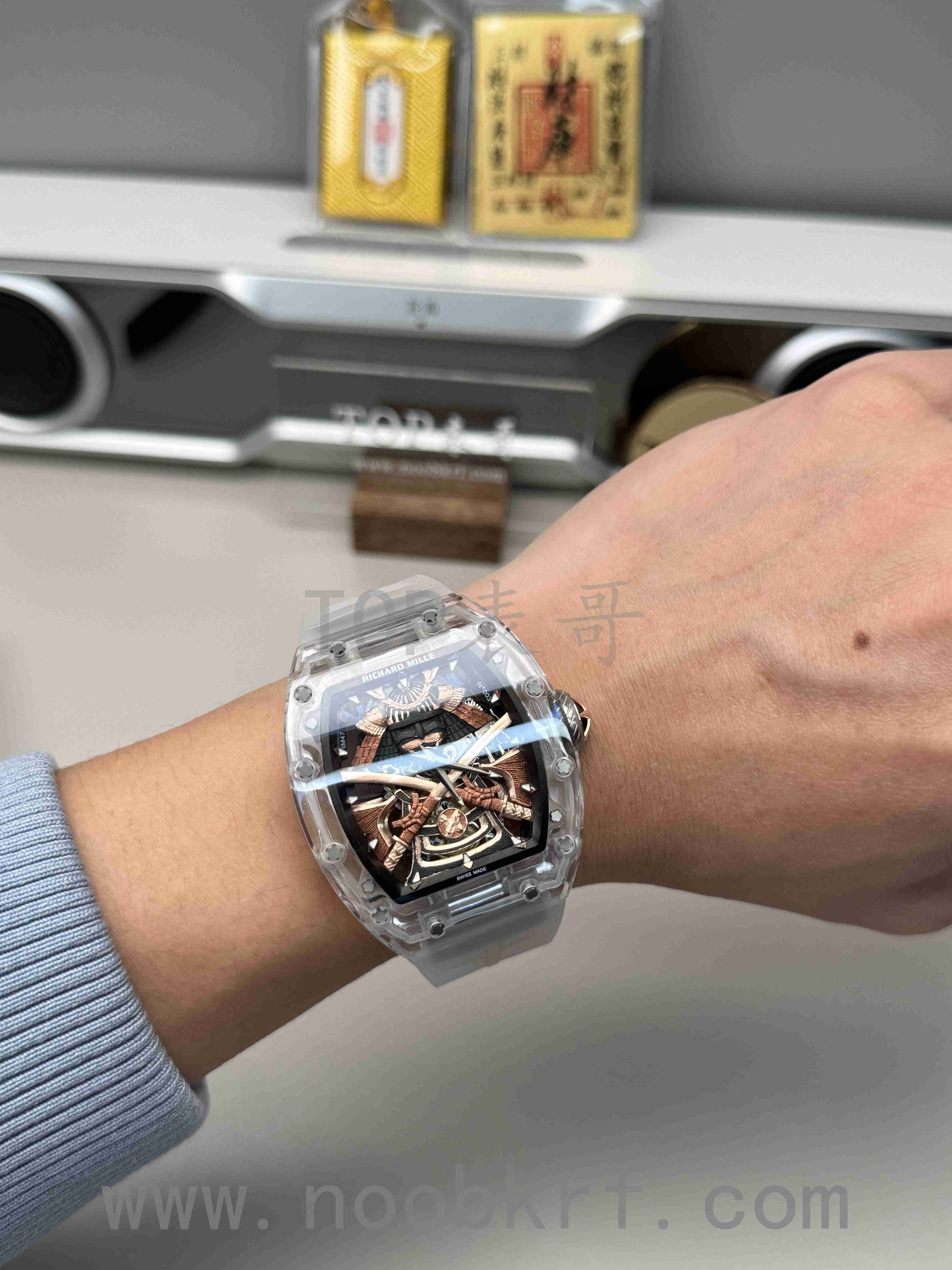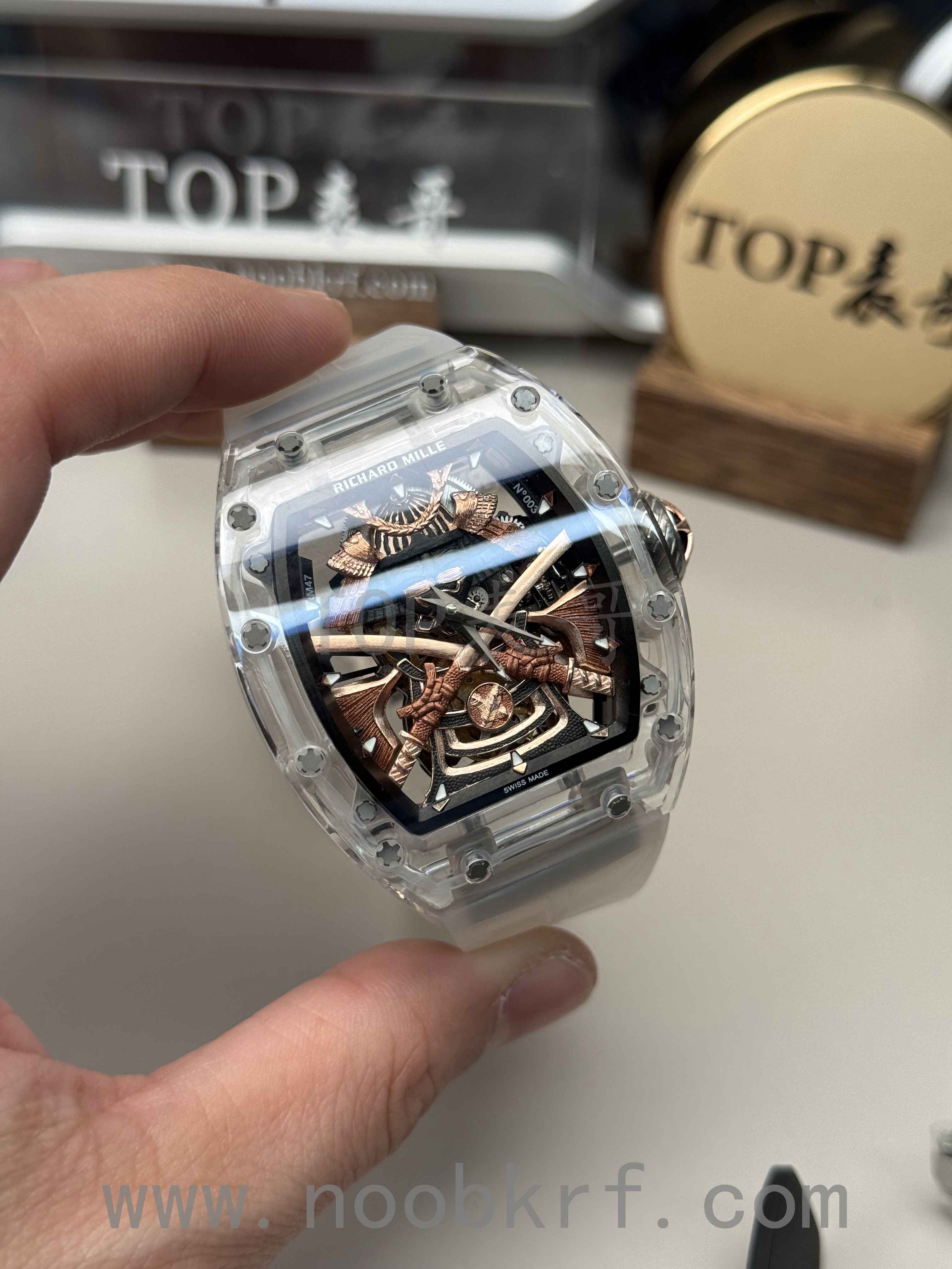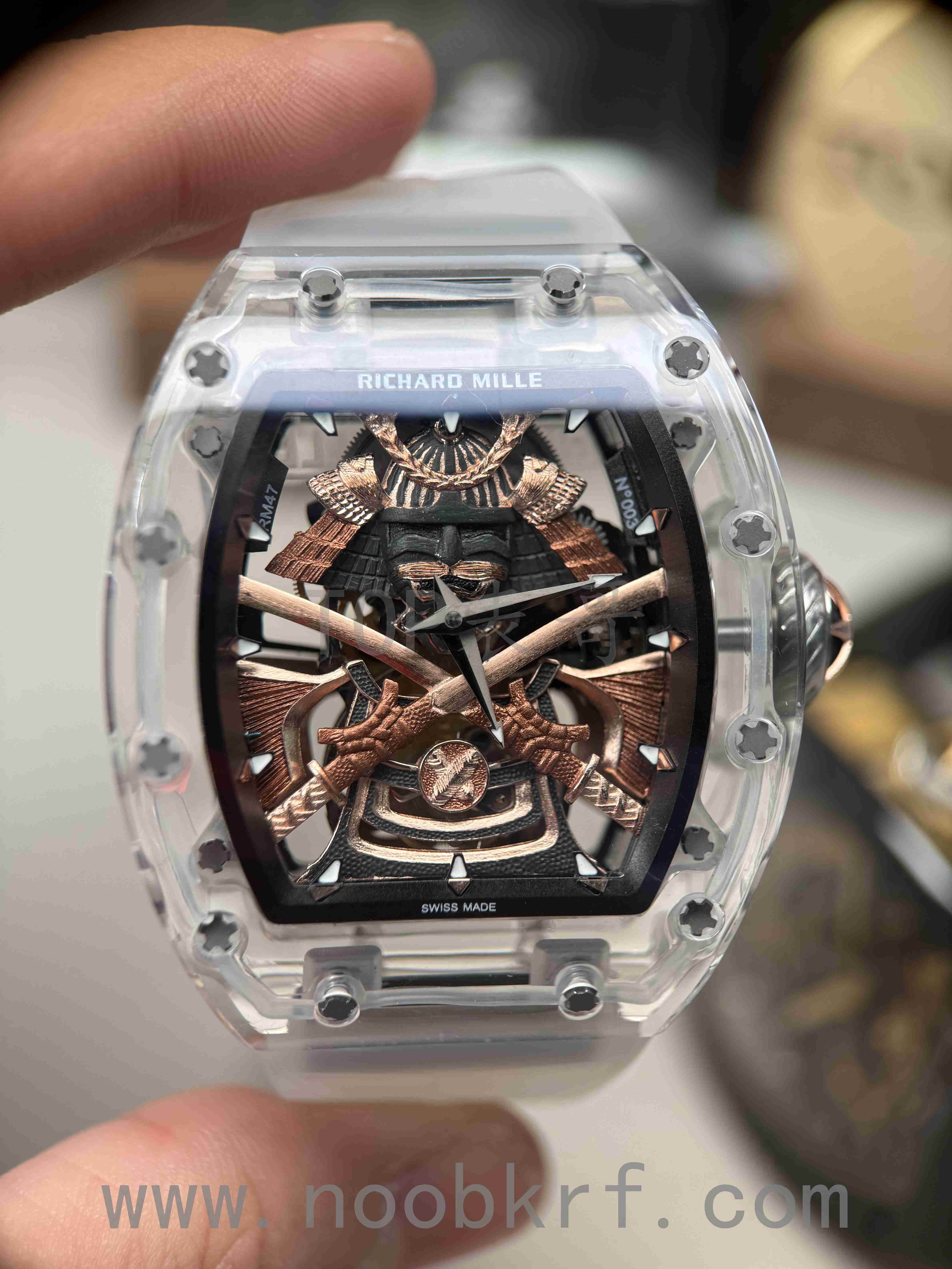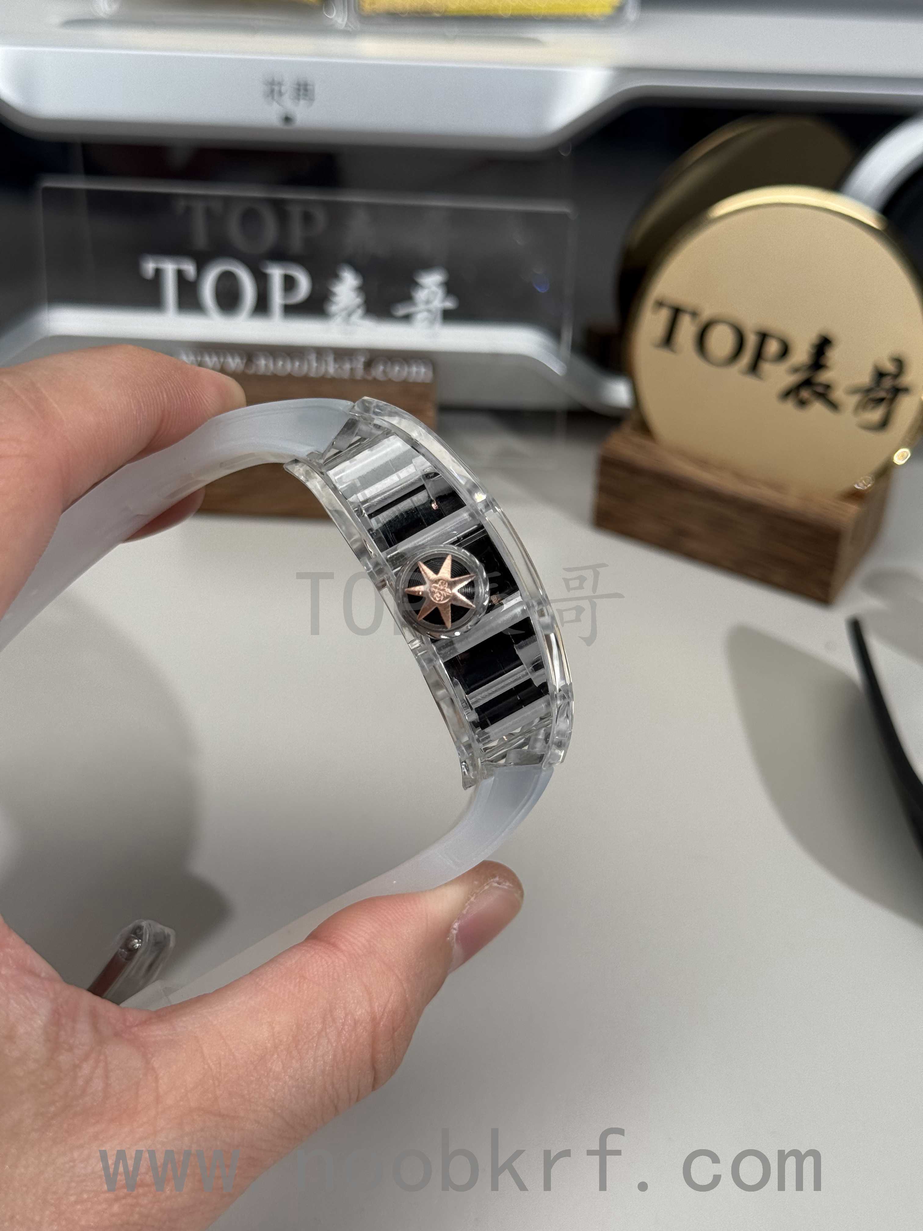 目前理查德米勒后改的蓝宝石表壳版本已经很少有人会找原厂定制改装了,毕竟钱都不是大风刮来的,现在很多表迷都会找国产的蓝宝石表壳版本,毕竟价格上的巨大优势,而且在材质上也是做到了同步。不过表哥在这里要给大家说明一点是,要区分普通工厂的亚克力玻璃表壳,或者好点工厂的真蓝宝石材质,最后就是定制改装CNC技术原装数据表壳版本,今天的这个RM047潘玮柏同款的蓝宝石表壳版本就是属于改装了定制原装数据表壳版本,虽然机芯和人偶没办法做到非常牛逼的程度,不过这个表壳呈现出来的质感与透明晶莹的效果是基本做到原厂一样的效果的,所以大家可以在理查德米勒热门一体机芯技术稳定的055、35-01、35-02、061等款式进行后改的蓝宝石材质表壳版本。