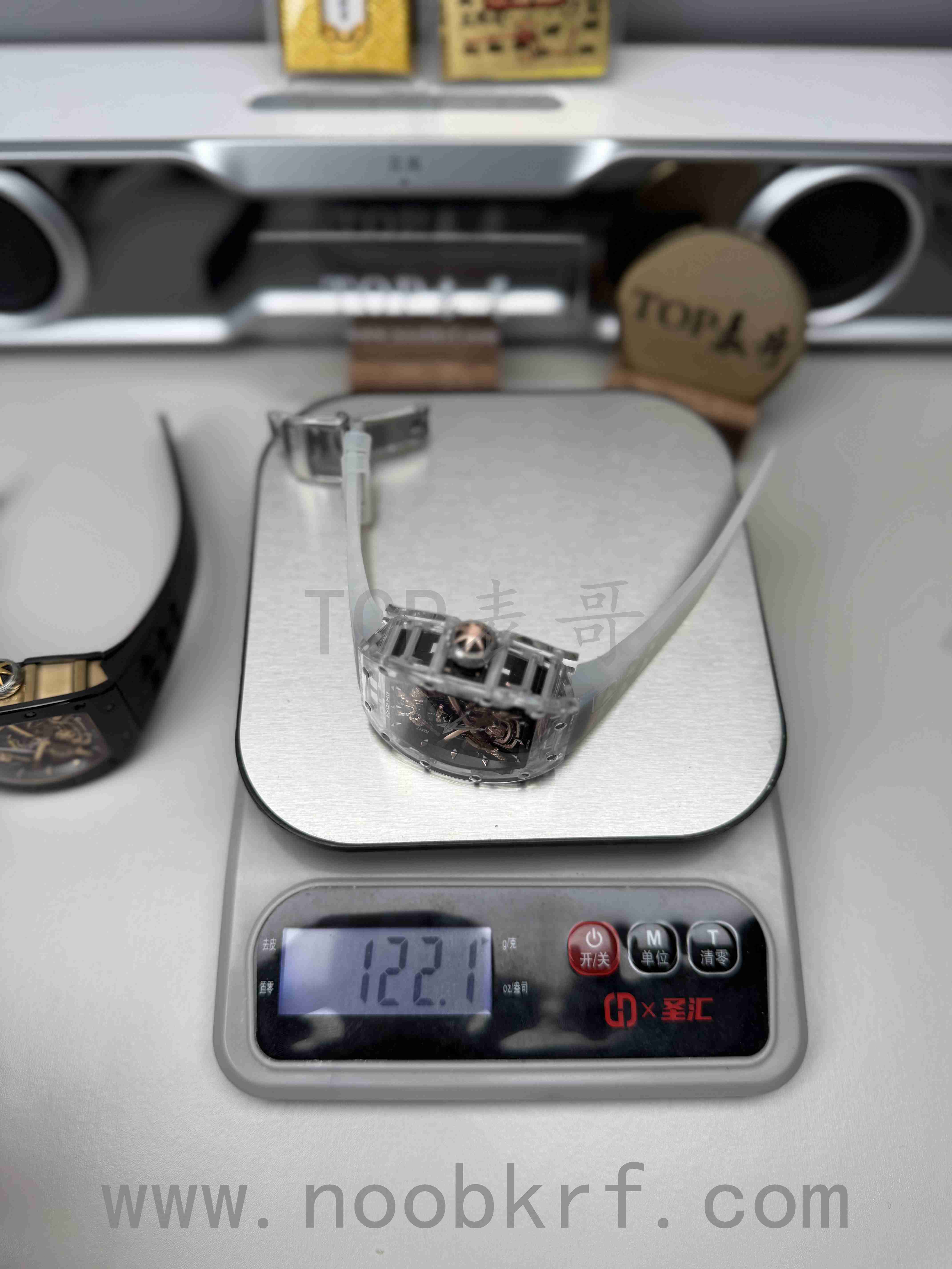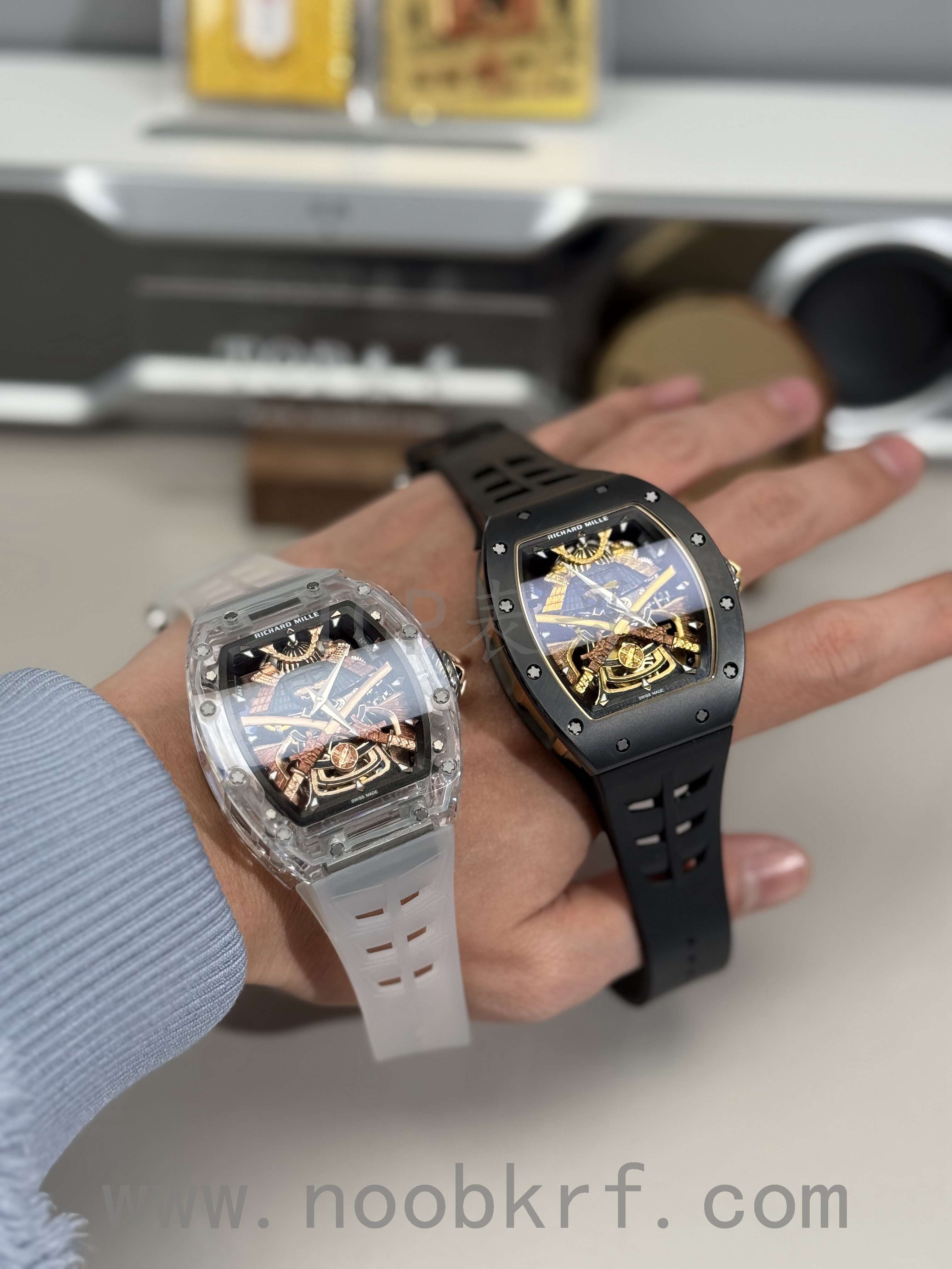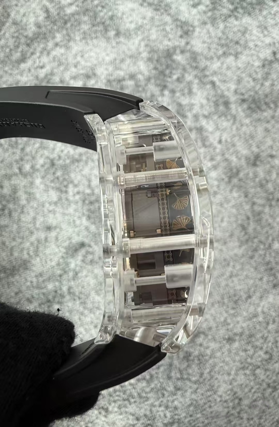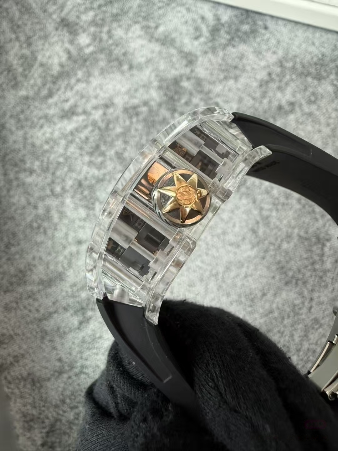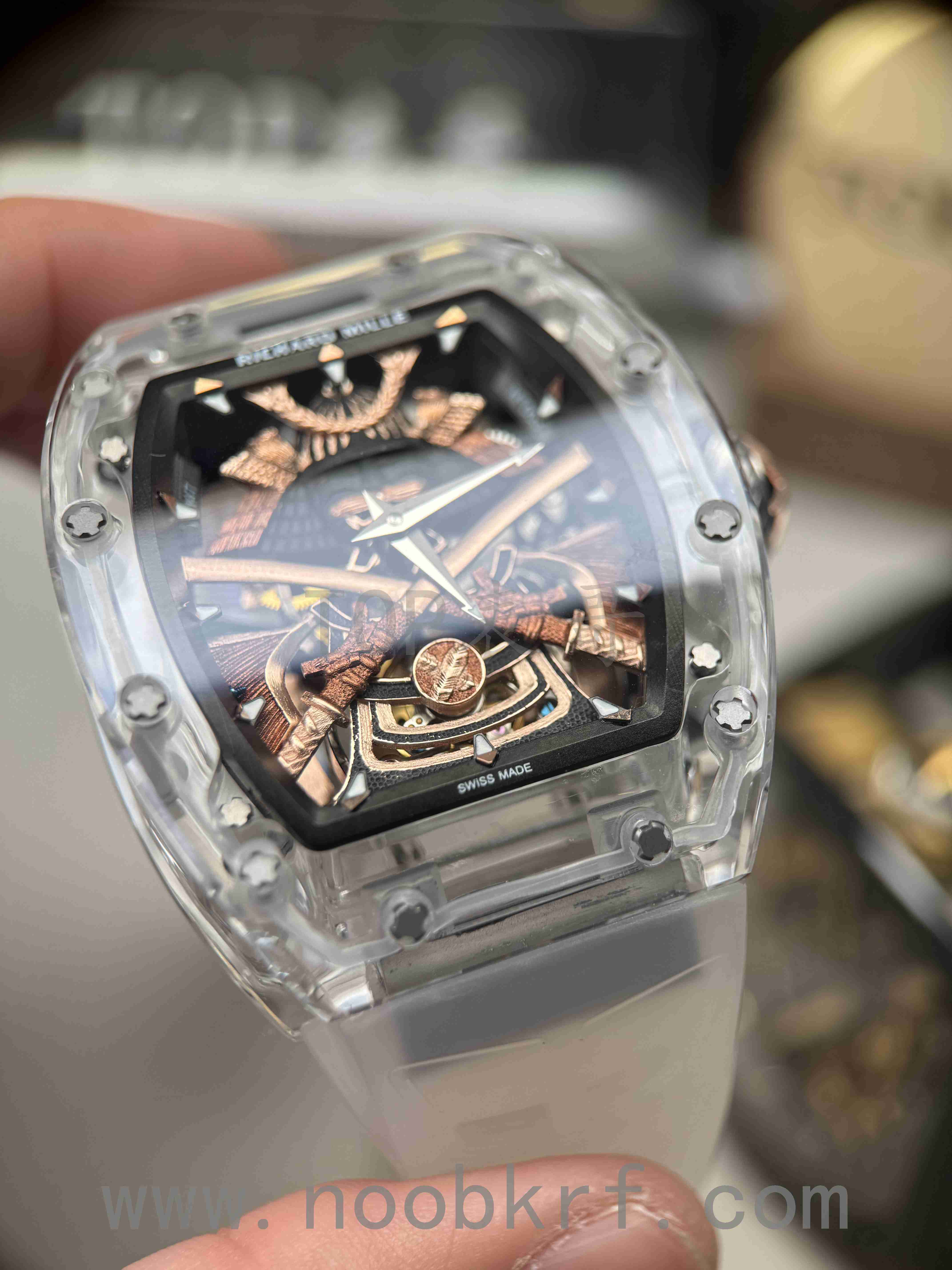 目前理查德米勒后改的蓝宝石表壳版本已经很少有人会找原厂定制改装了,毕竟钱都不是大风刮来的,现在很多表迷都会找国产的蓝宝石表壳版本,毕竟价格上的巨大优势,而且在材质上也是做到了同步。不过表哥在这里要给大家说明一点是,要区分普通工厂的亚克力玻璃表壳,或者好点工厂的真蓝宝石材质,最后就是定制改装CNC技术原装数据表壳版本,今天的这个RM047潘玮柏同款的蓝宝石表壳版本就是属于改装了定制原装数据表壳版本,虽然机芯和人偶没办法做到非常牛逼的程度,不过这个表壳呈现出来的质感与透明晶莹的效果是基本做到原厂一样的效果的,所以大家可以在理查德米勒热门一体机芯技术稳定的055、35-01、35-02、061等款式进行后改的蓝宝石材质表壳版本。