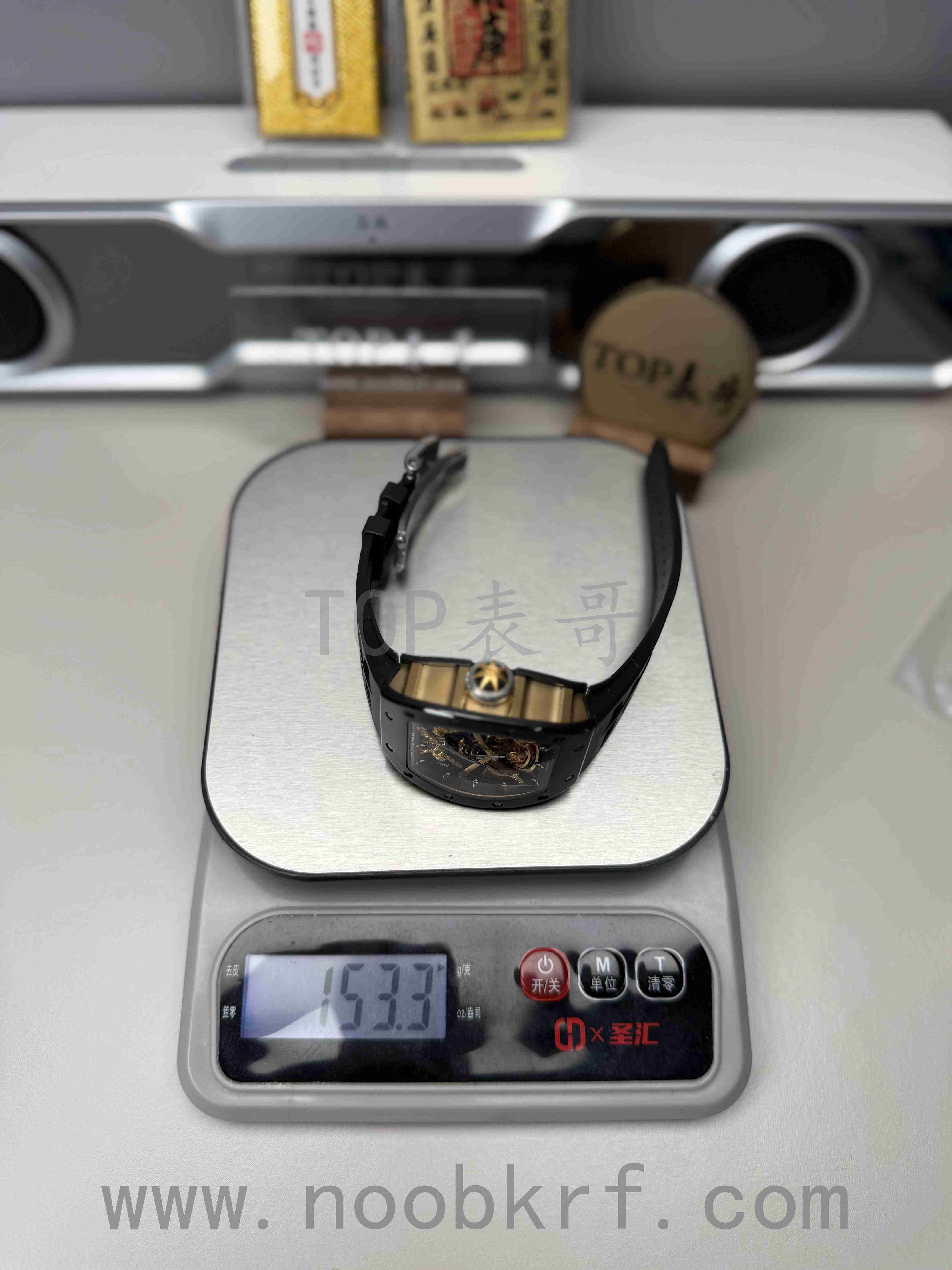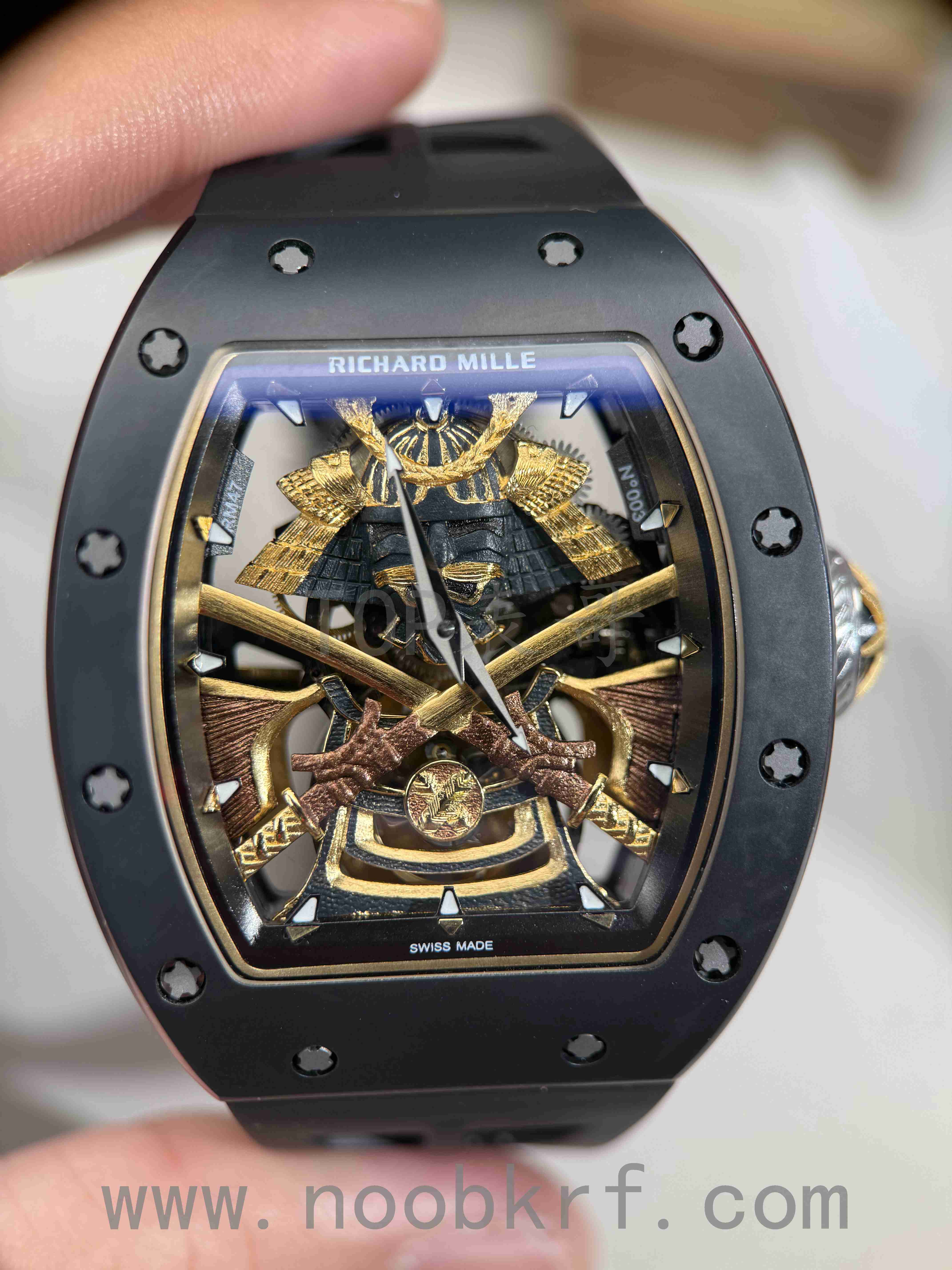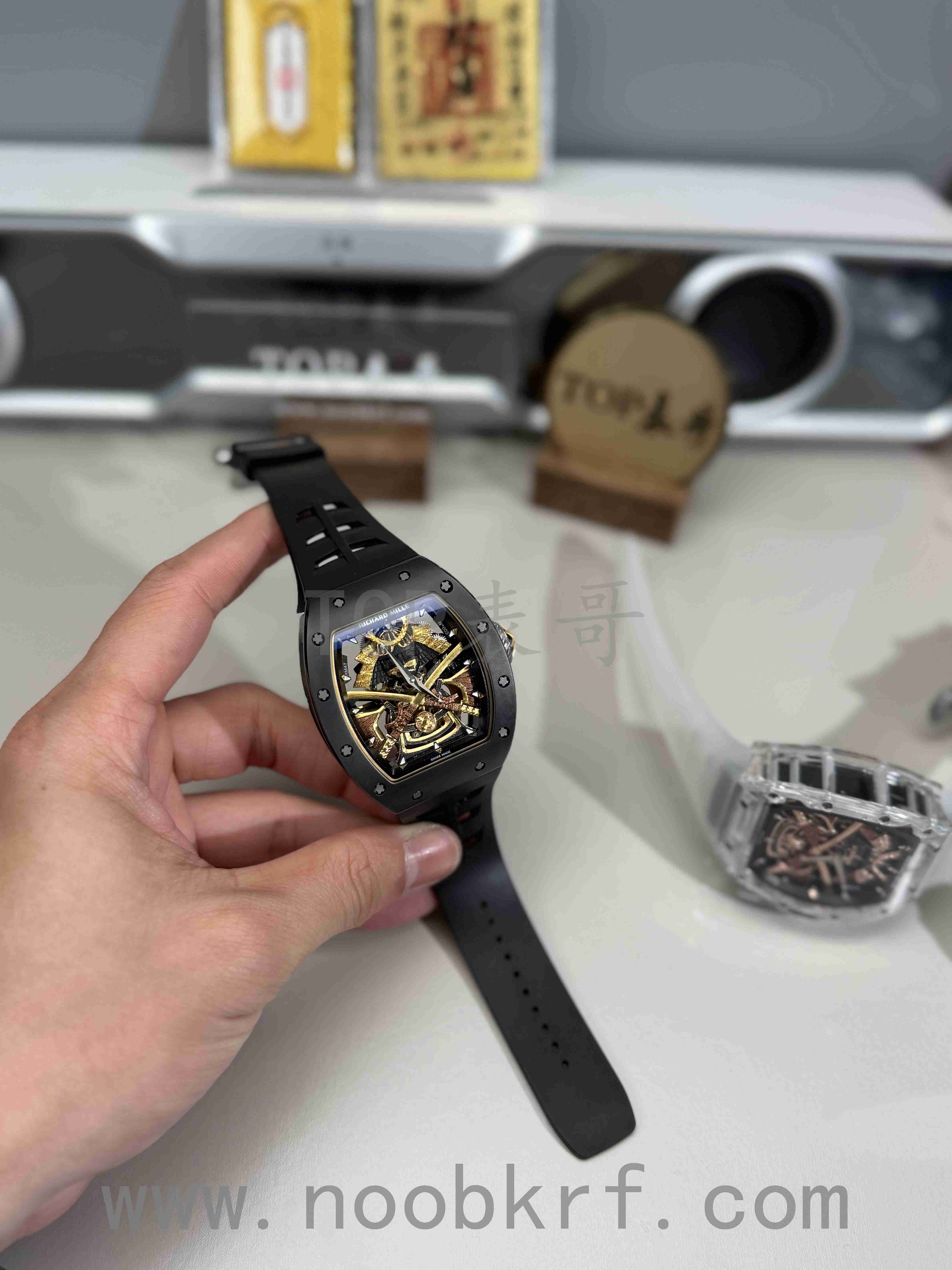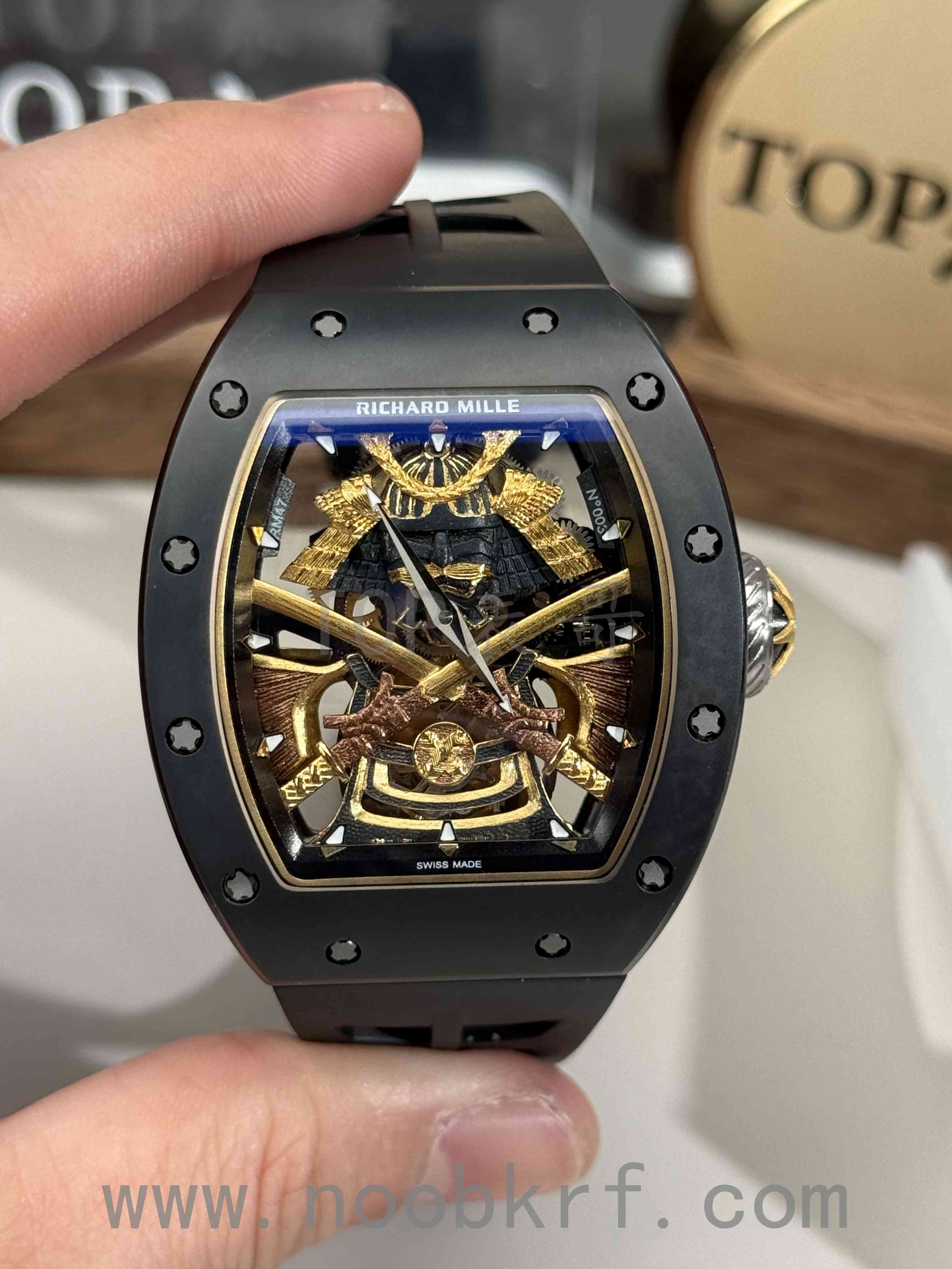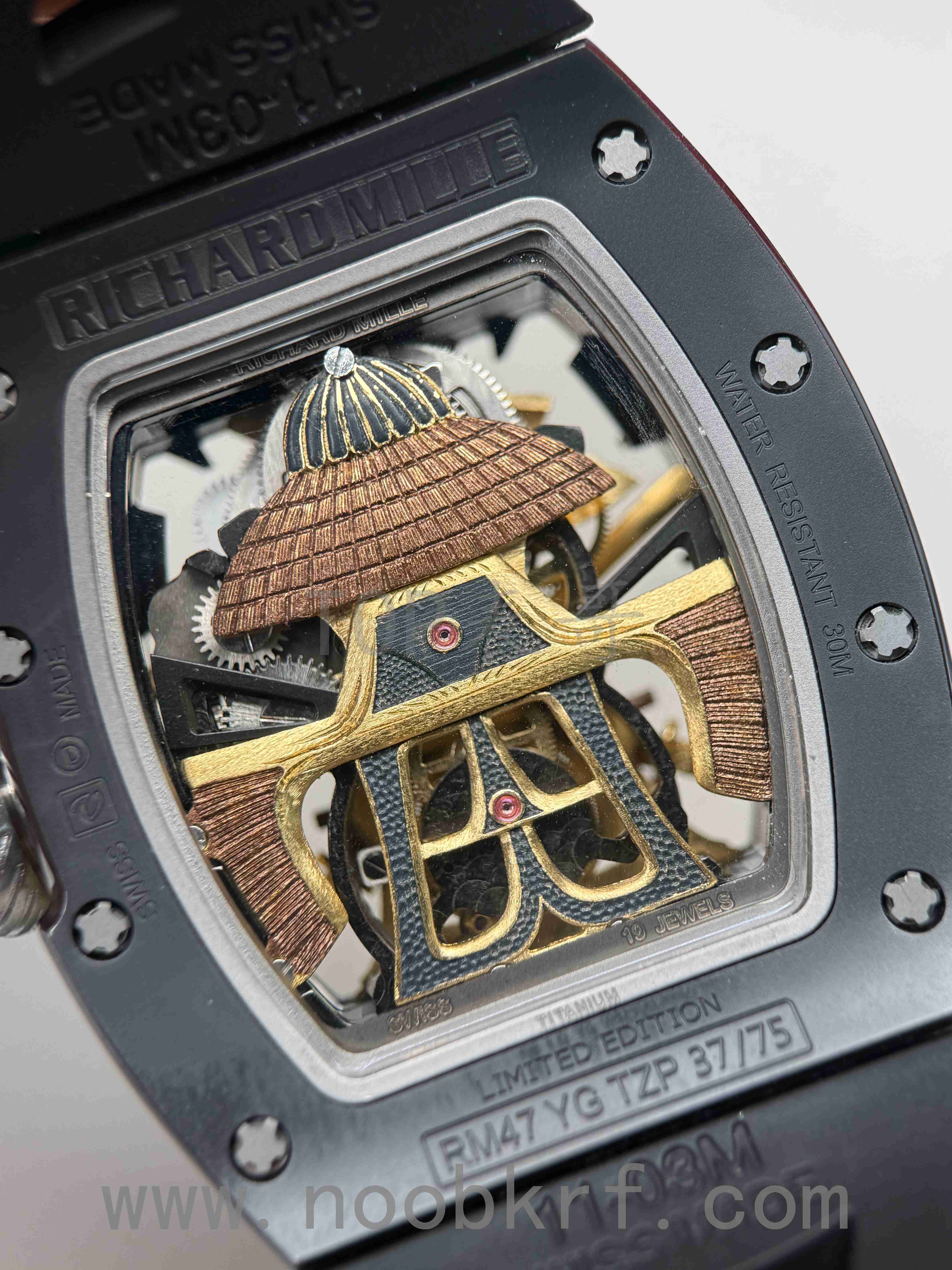 对于今天拿到的这两款改装定制款式的理查德米勒047日本武士陀飞轮腕表,表哥其实感觉是有点差强人意,第一眼看过去就感觉:“这表不对劲”,说白了就是一眼假的意思了。首先目前这一款腕表是基于YS工厂的理查德米勒047改装而来,在盘面中间标志性的日本武士人偶做工就是明显不足的感觉,哪怕了加工了厚包金工艺处理,不过拉近一看显得非常粗糙,只能说是做个样子。