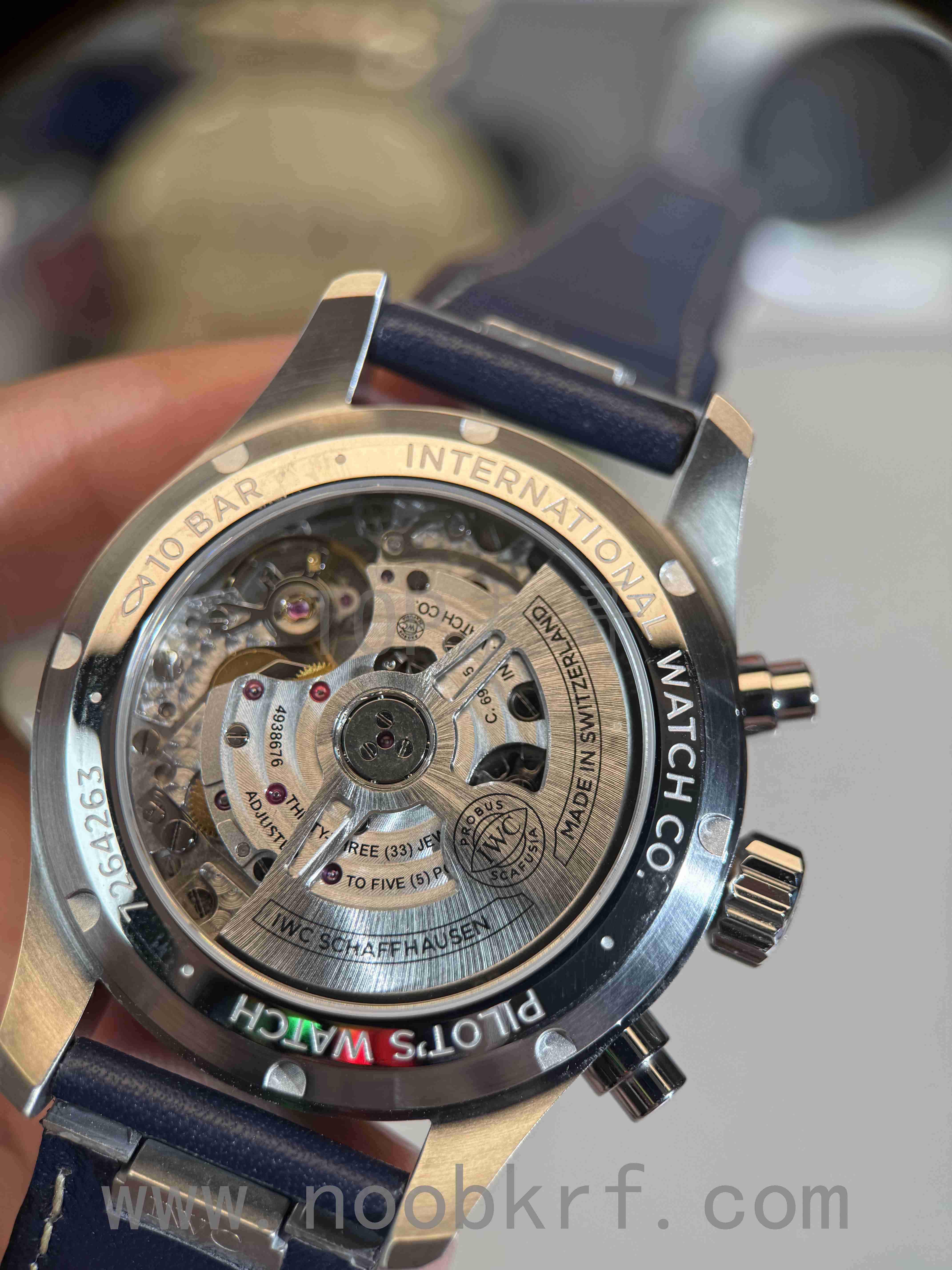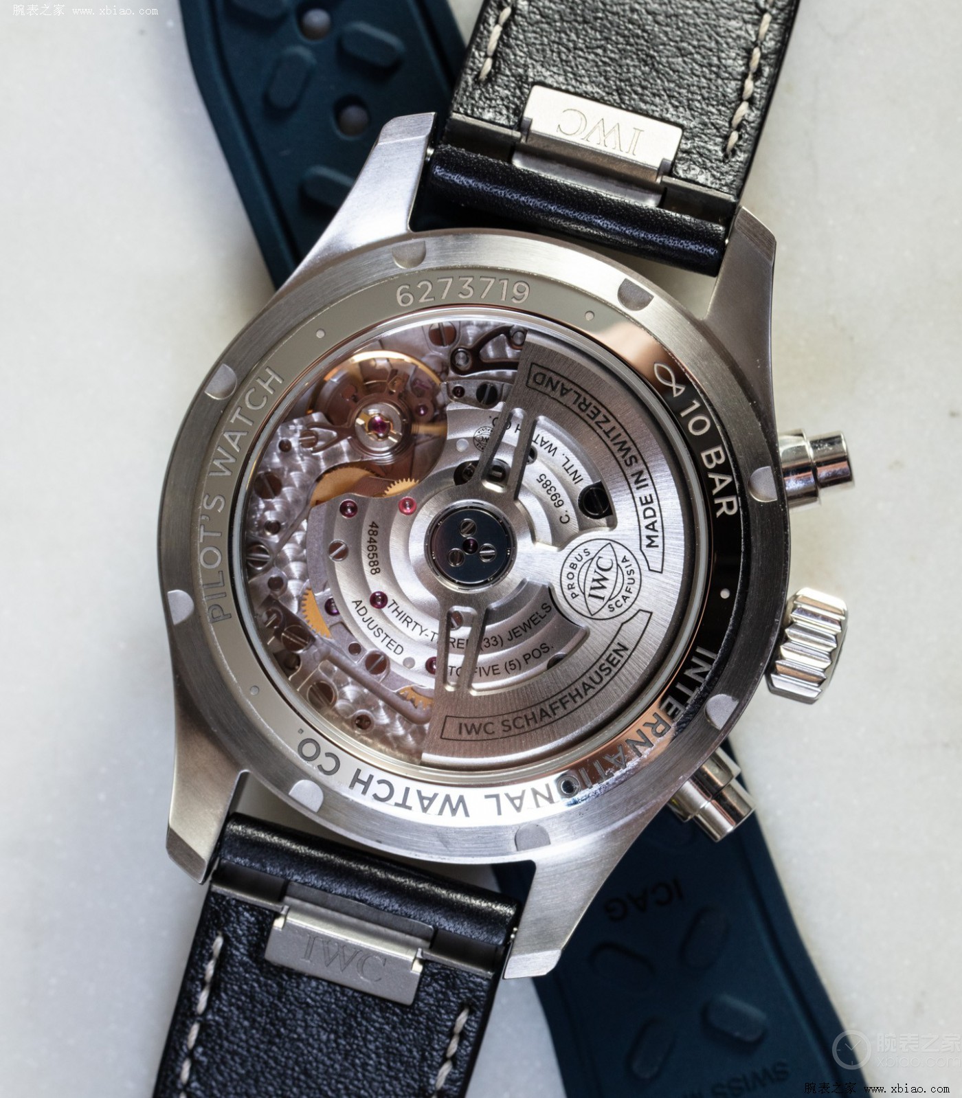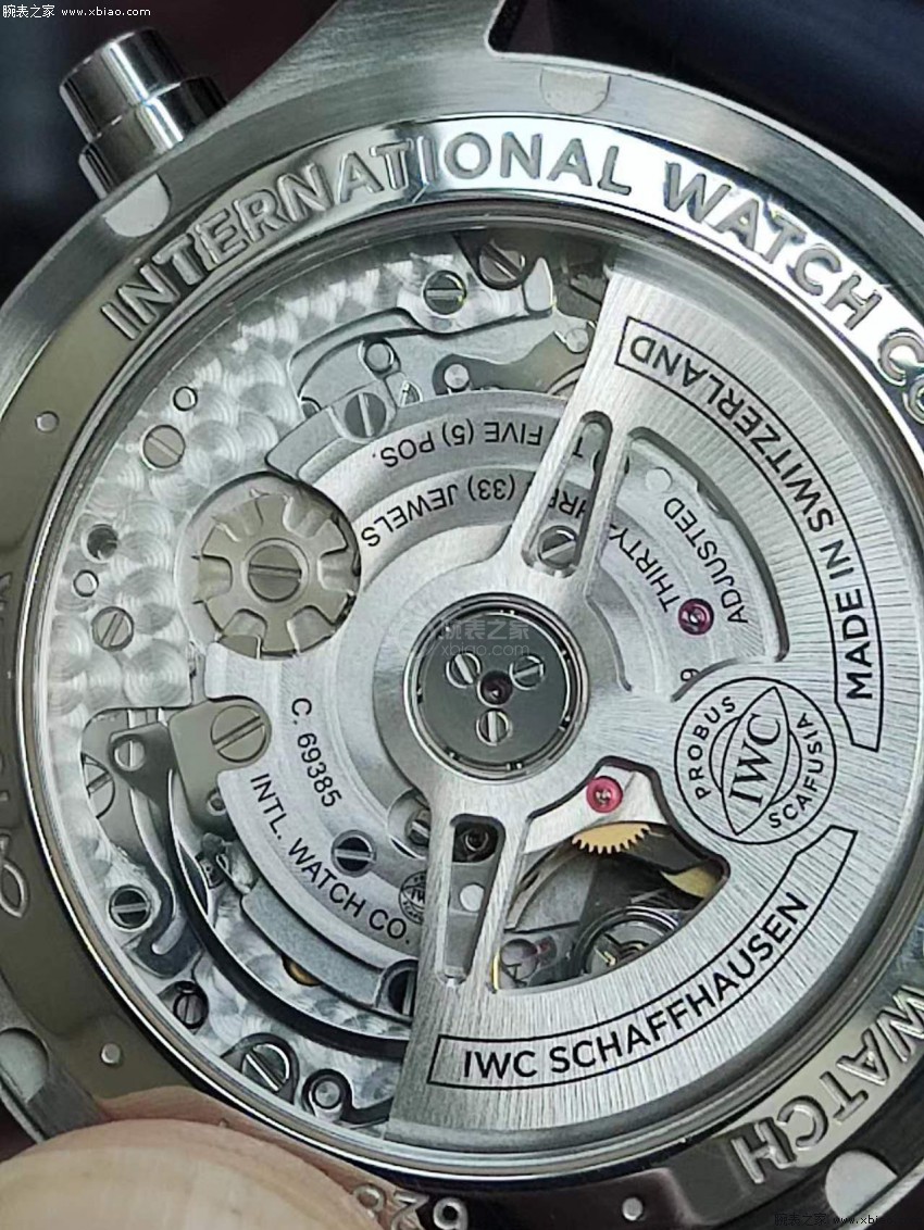在2020年,万国的葡萄牙系列就已换装自产机芯替换基于ETA7750的机芯型号。本次全新飞行员系列41毫米计时腕表也相应地对机芯进行了升级,Cal.69385机芯的计时功能由导柱轮控制,拥有46小时的动力储存。相较于7750机芯的自动陀的单向上弦,Cal.69385机芯可实现双向上弦,大大提高了机芯的上弦效率。这枚新机芯无疑是新款41毫米飞计的一大卖点,为此飞行员系列一改实心底盖设计,首次将背透玻璃底盖引入飞行员系列,足以说明万国对这枚机芯的自豪,同时这也有利于增强防伪特性。此外还有一个容易被忽视的细节,在查阅官网参数后我们发现新款41毫米飞计的防水等级由60米防水升级成了100米防水,背透底盖不仅没有使防水等级下降,反而还进行了小幅度提升,可谓兼具了美观和实用性,足以见证万国对于新款飞计的诚意。