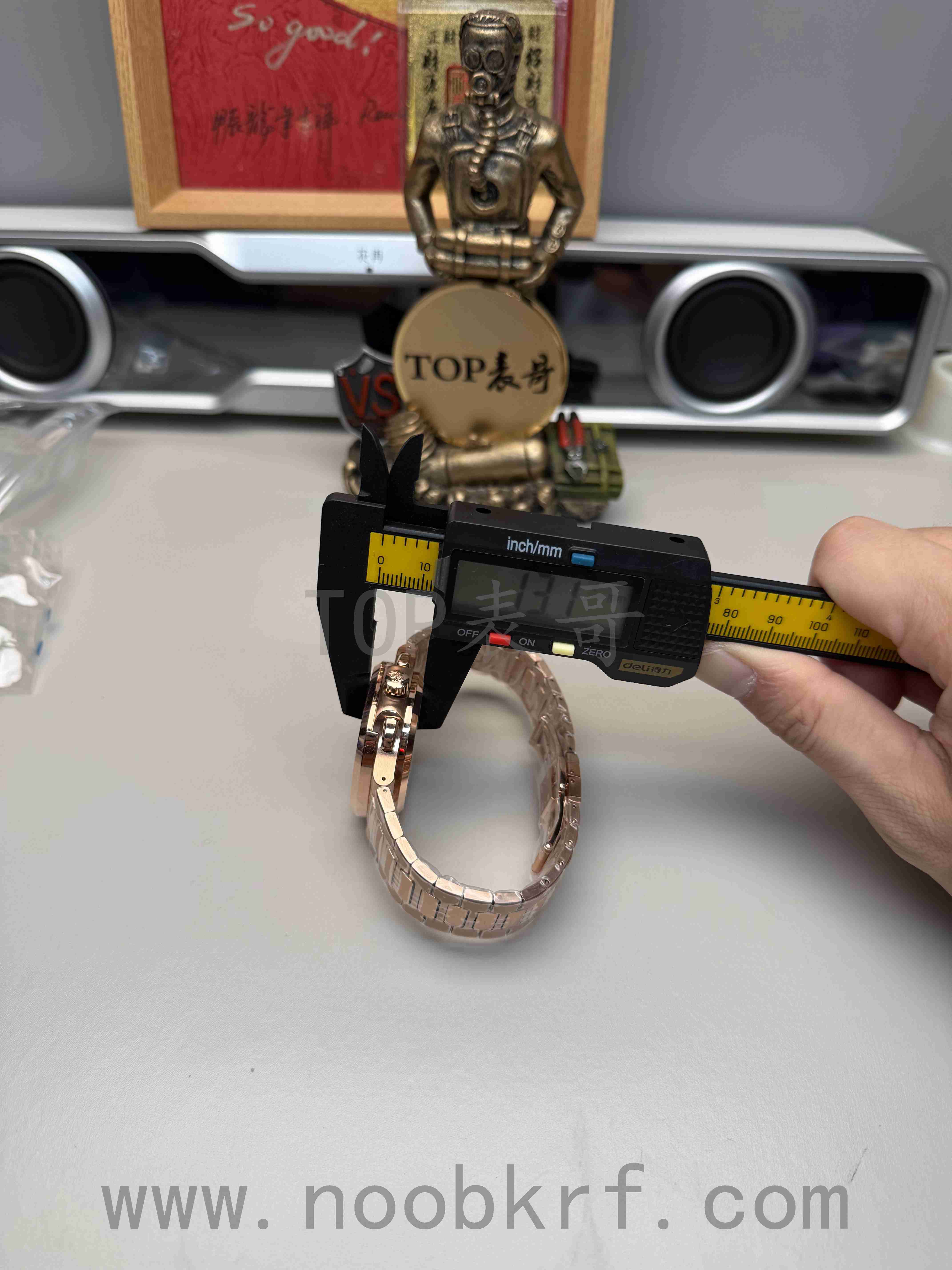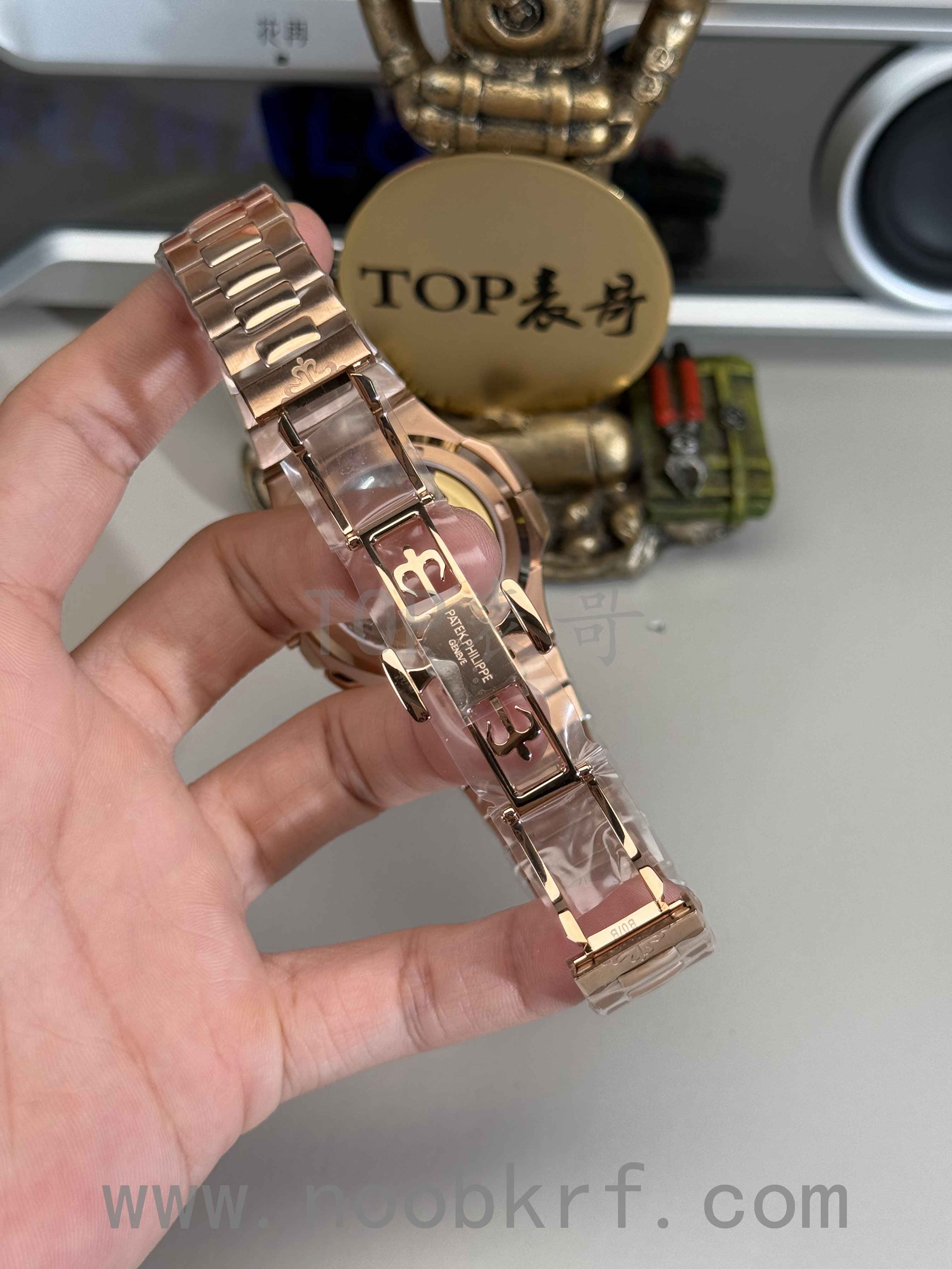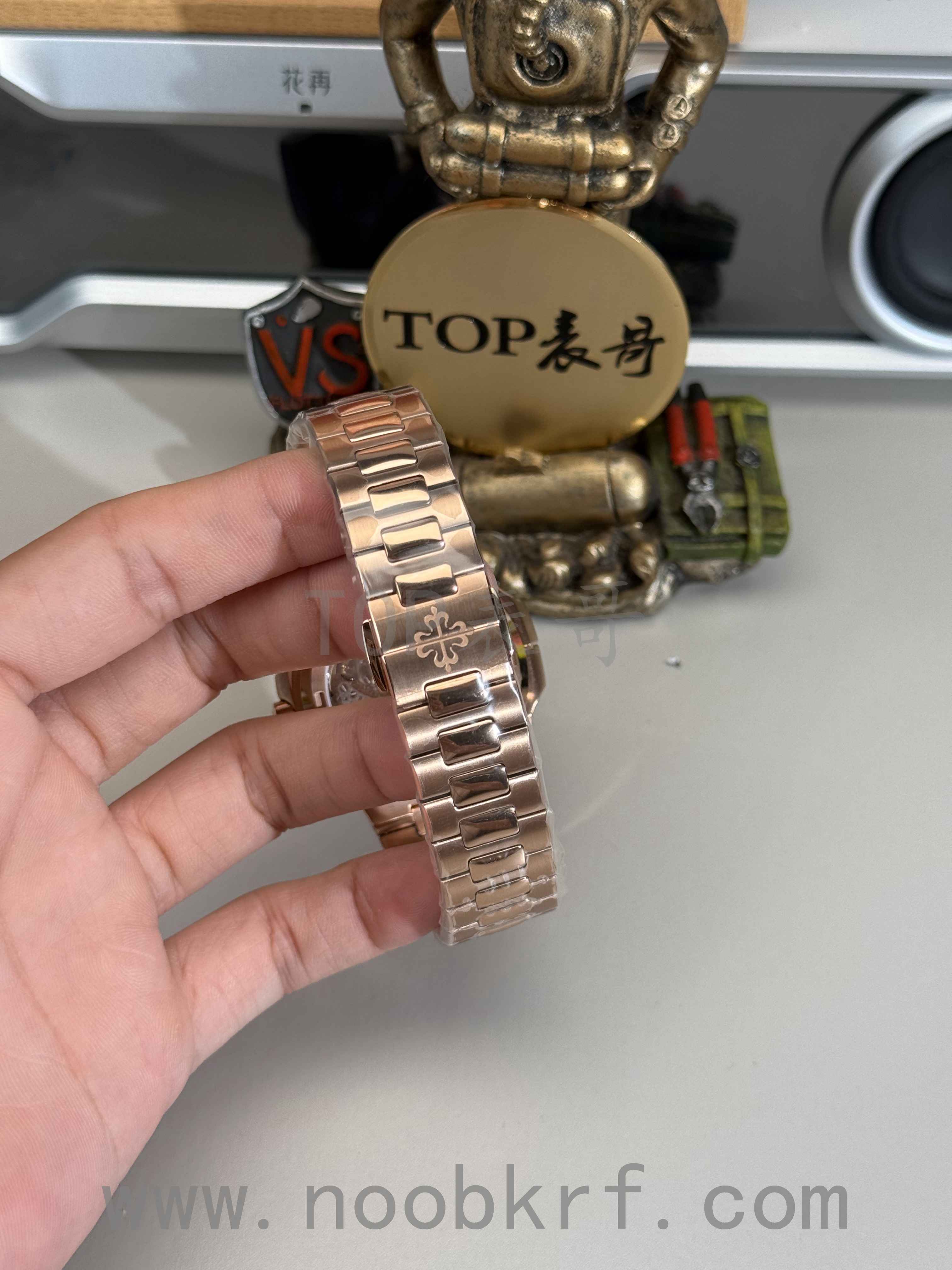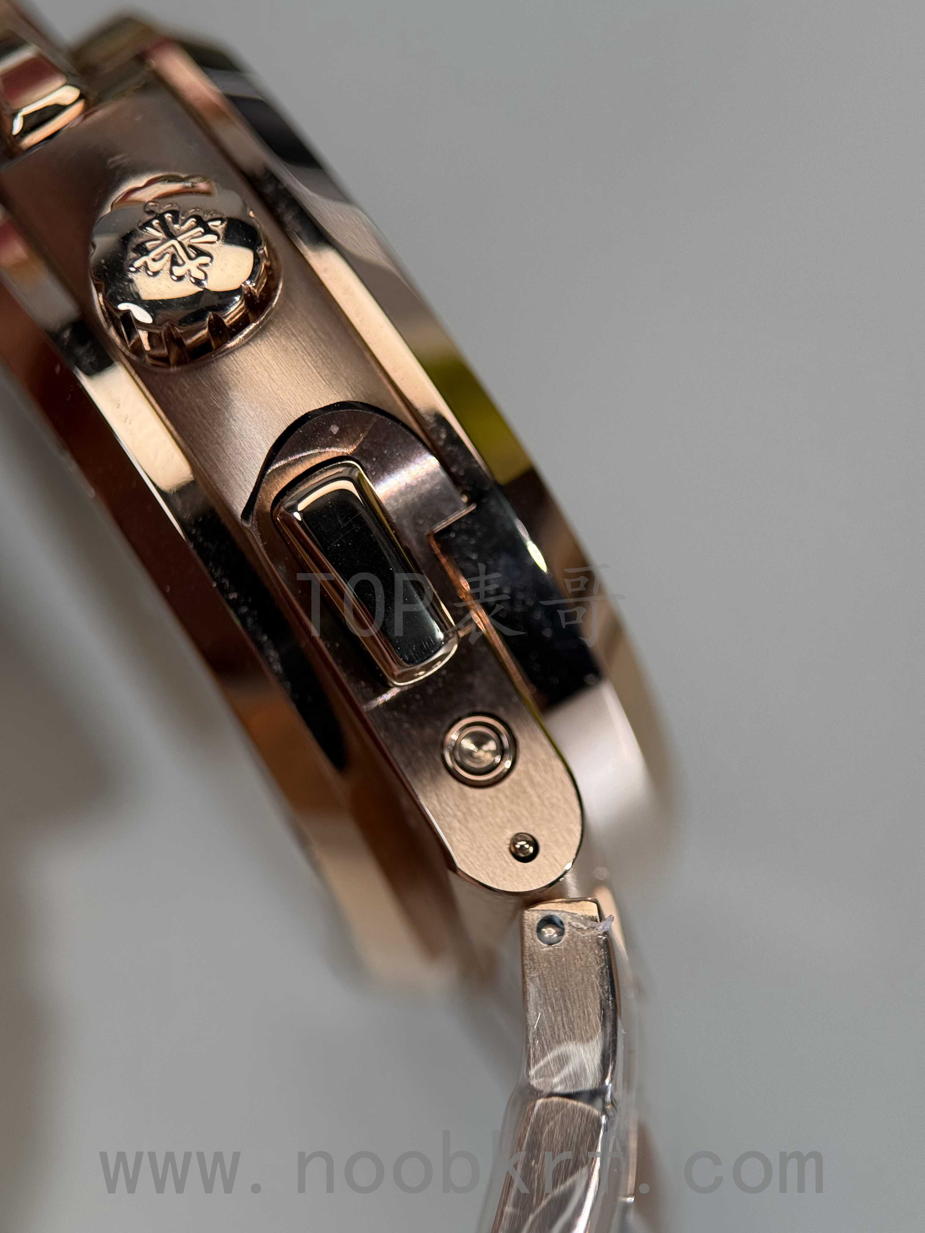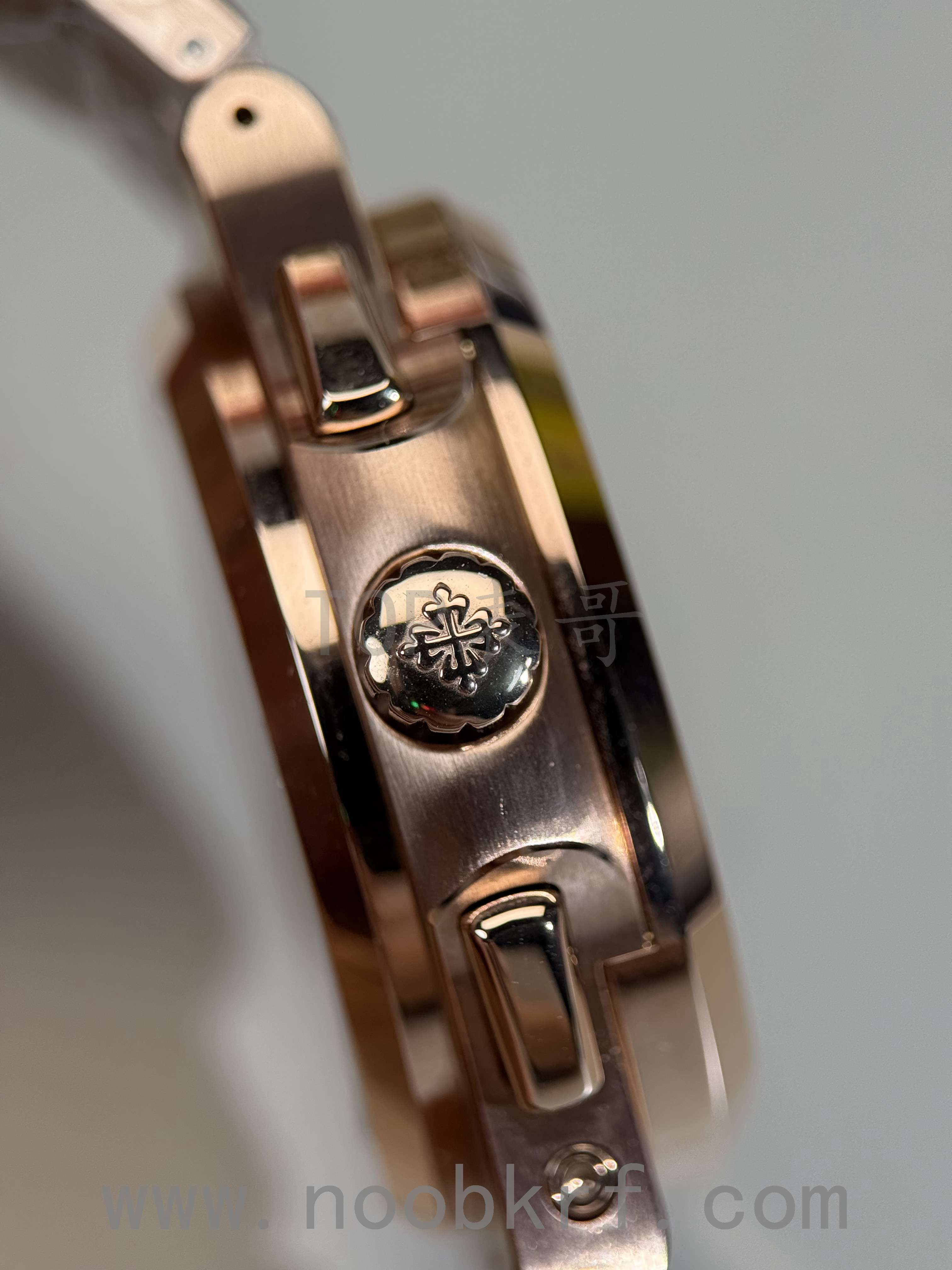 一、设计美学:经典基因的当代演绎5990R 延续了鹦鹉螺系列最具辨识度的 “圆角八边形” 表圈设计,灵感源自船舶舷窗,兼顾力量感与优雅气质。40.5mm 的表径(10 点至 4 点方向测量)堪称 “黄金尺寸”,16.5cm 的细腕与 19cm 的宽腕均能轻松驾驭,打破了大尺寸运动表的佩戴限制。表壳、表链及折叠扣均采用 18K 玫瑰金打造,经过细腻抛光处理,光线折射下呈现出暖调金属光泽,既彰显尊贵,又避免了钢款的冷硬感。