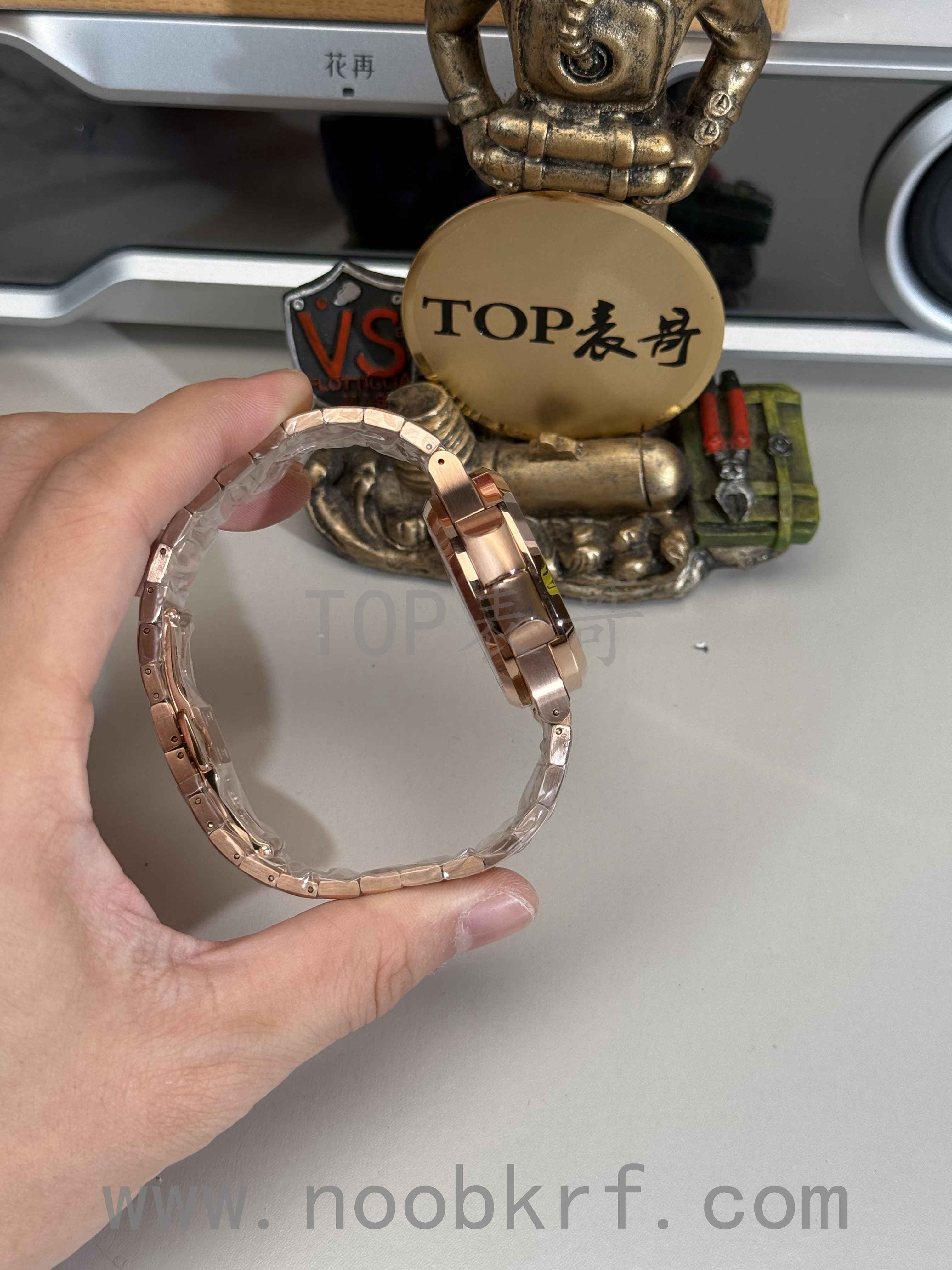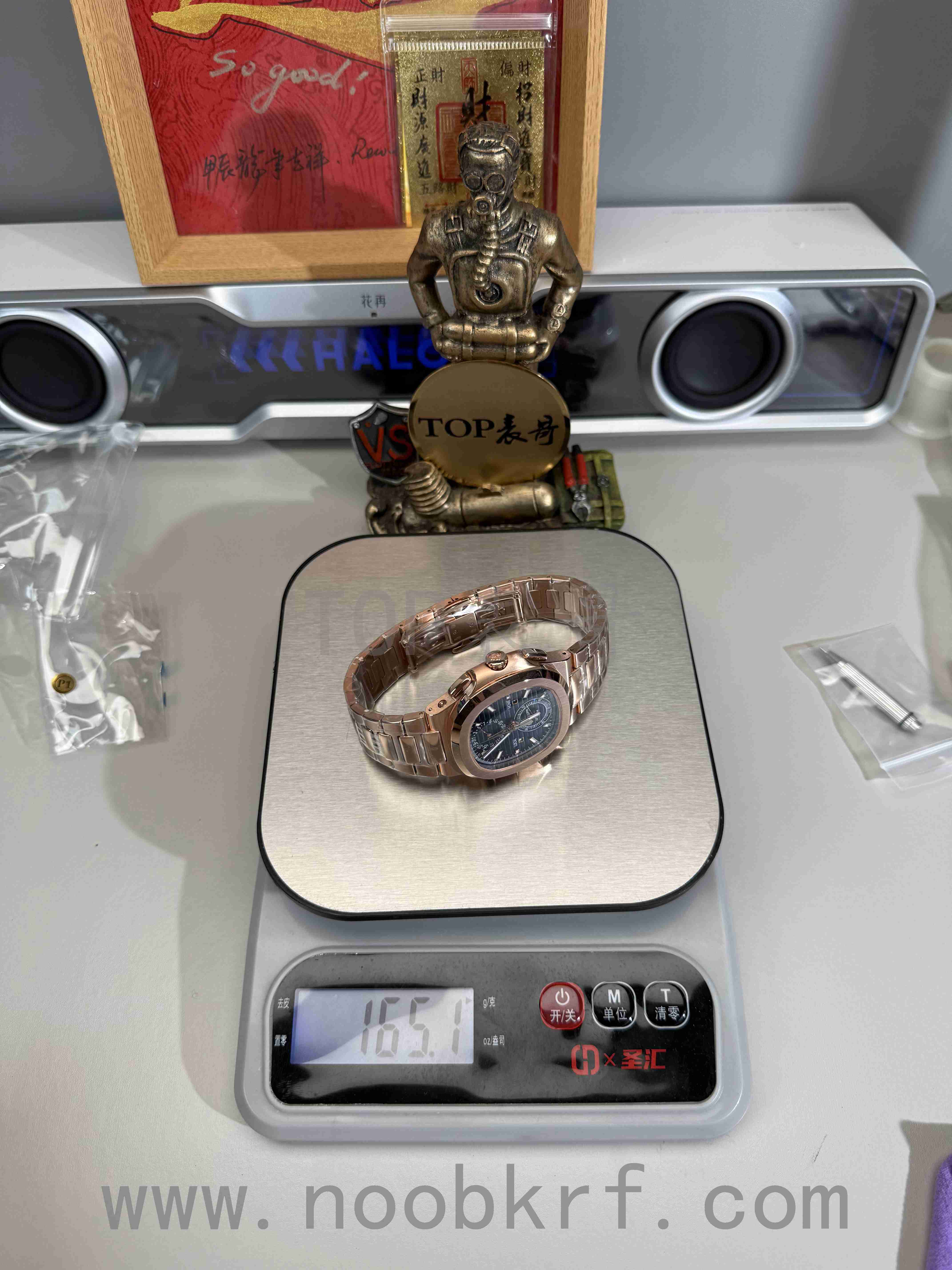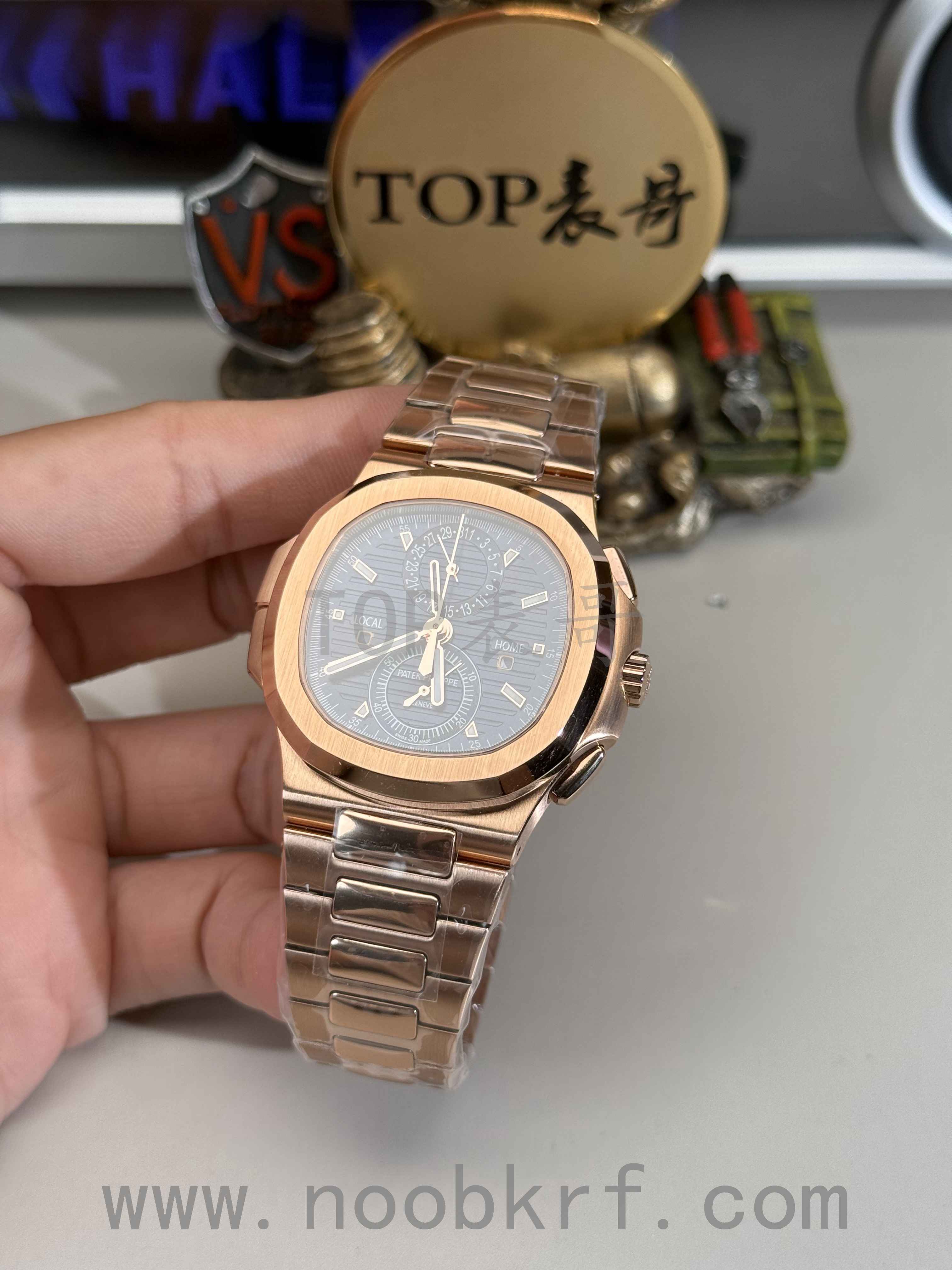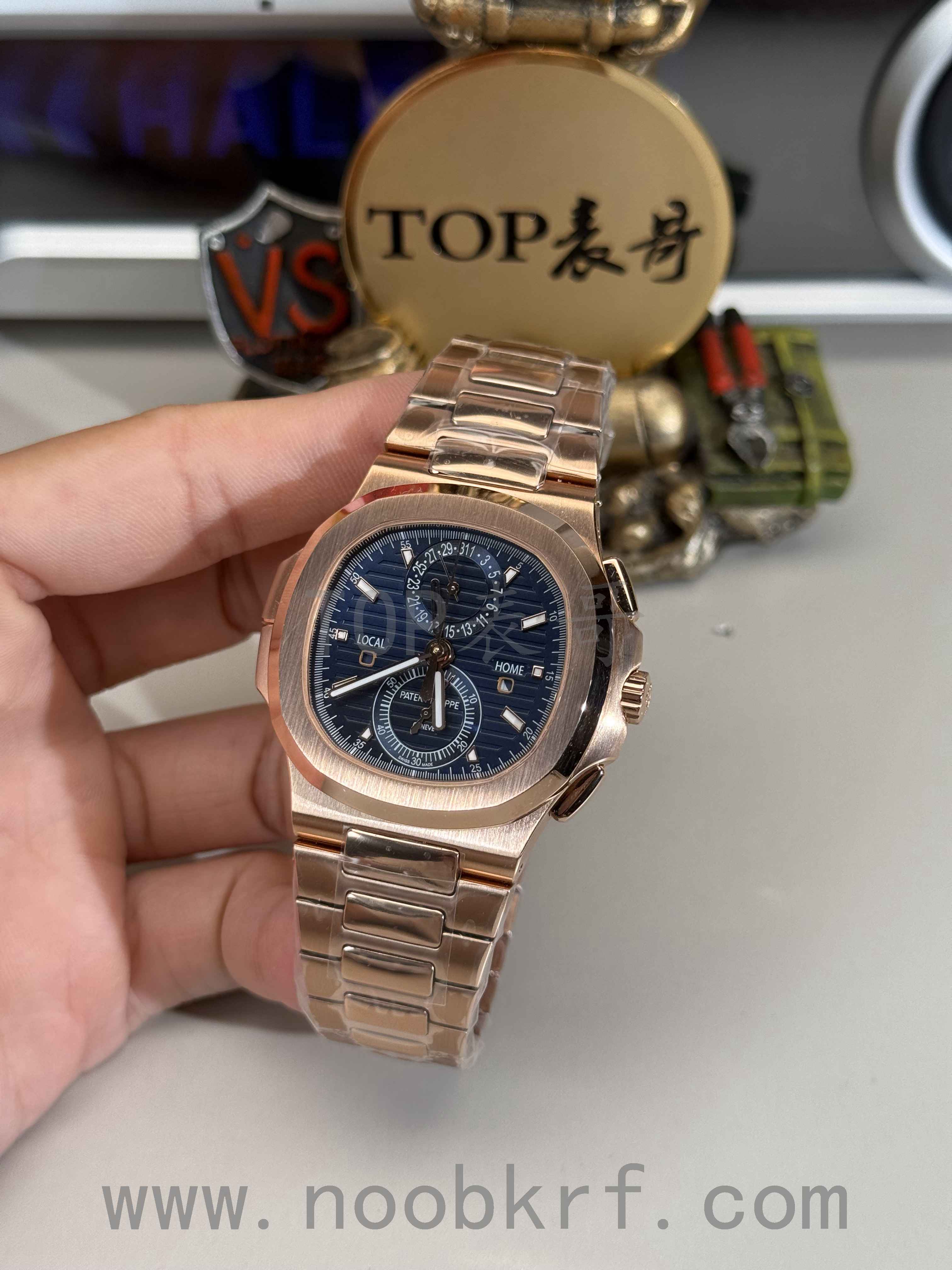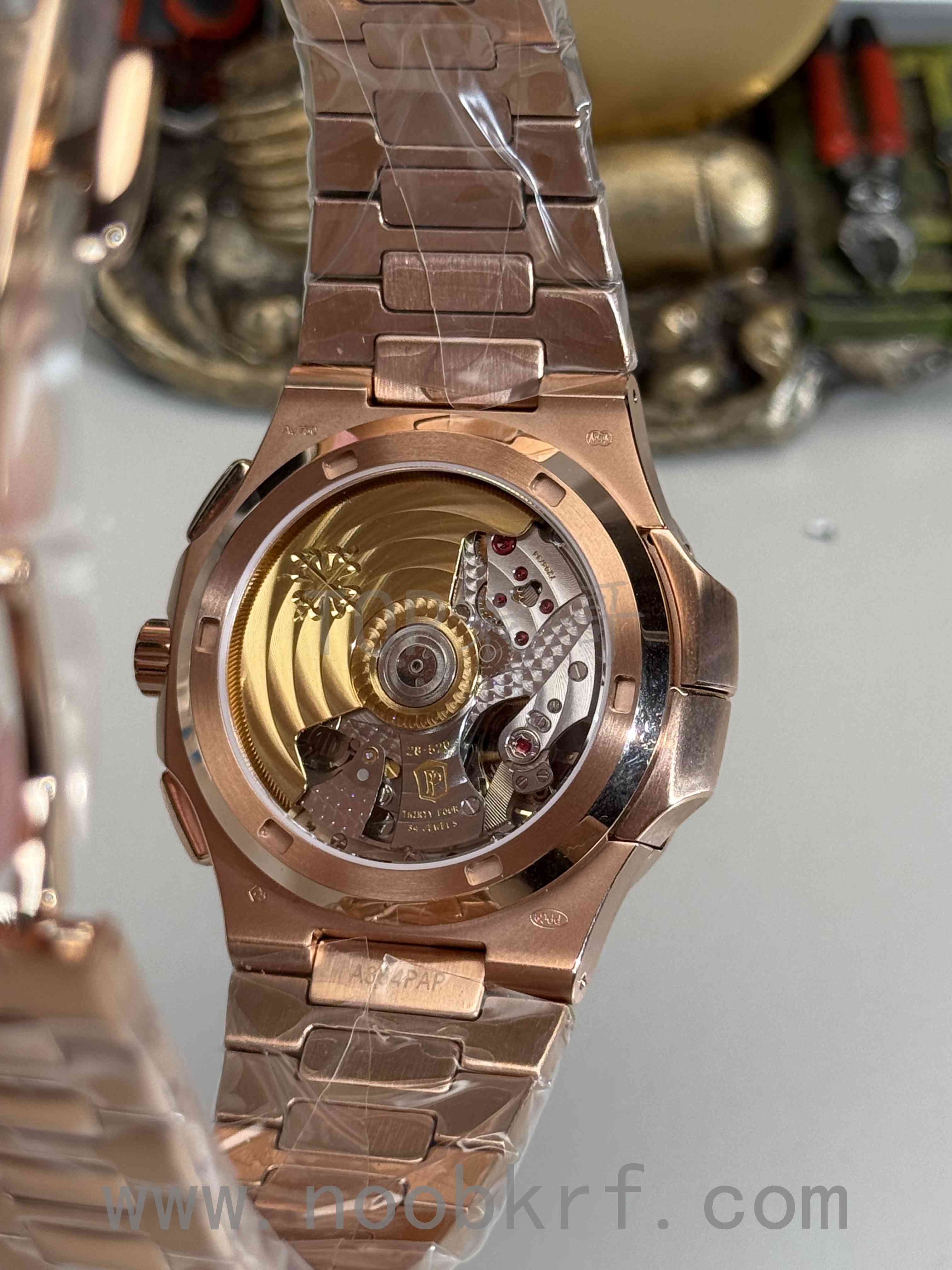 一、设计美学:经典基因的当代演绎5990R 延续了鹦鹉螺系列最具辨识度的 “圆角八边形” 表圈设计,灵感源自船舶舷窗,兼顾力量感与优雅气质。40.5mm 的表径(10 点至 4 点方向测量)堪称 “黄金尺寸”,16.5cm 的细腕与 19cm 的宽腕均能轻松驾驭,打破了大尺寸运动表的佩戴限制。表壳、表链及折叠扣均采用 18K 玫瑰金打造,经过细腻抛光处理,光线折射下呈现出暖调金属光泽,既彰显尊贵,又避免了钢款的冷硬感。