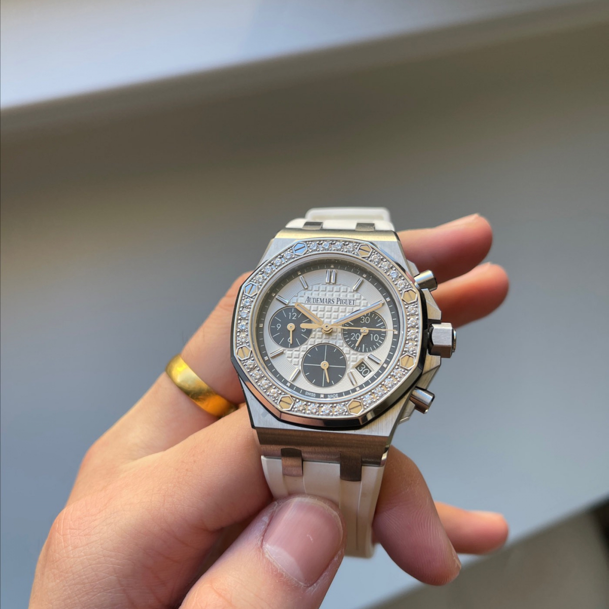 比起皇家橡树的硬朗,离岸系列更懂女生!37mm表径贴合手腕,精钢镶钻表壳搭配白色橡胶表带,柔中带飒,日常通勤还是派对都能hold住!