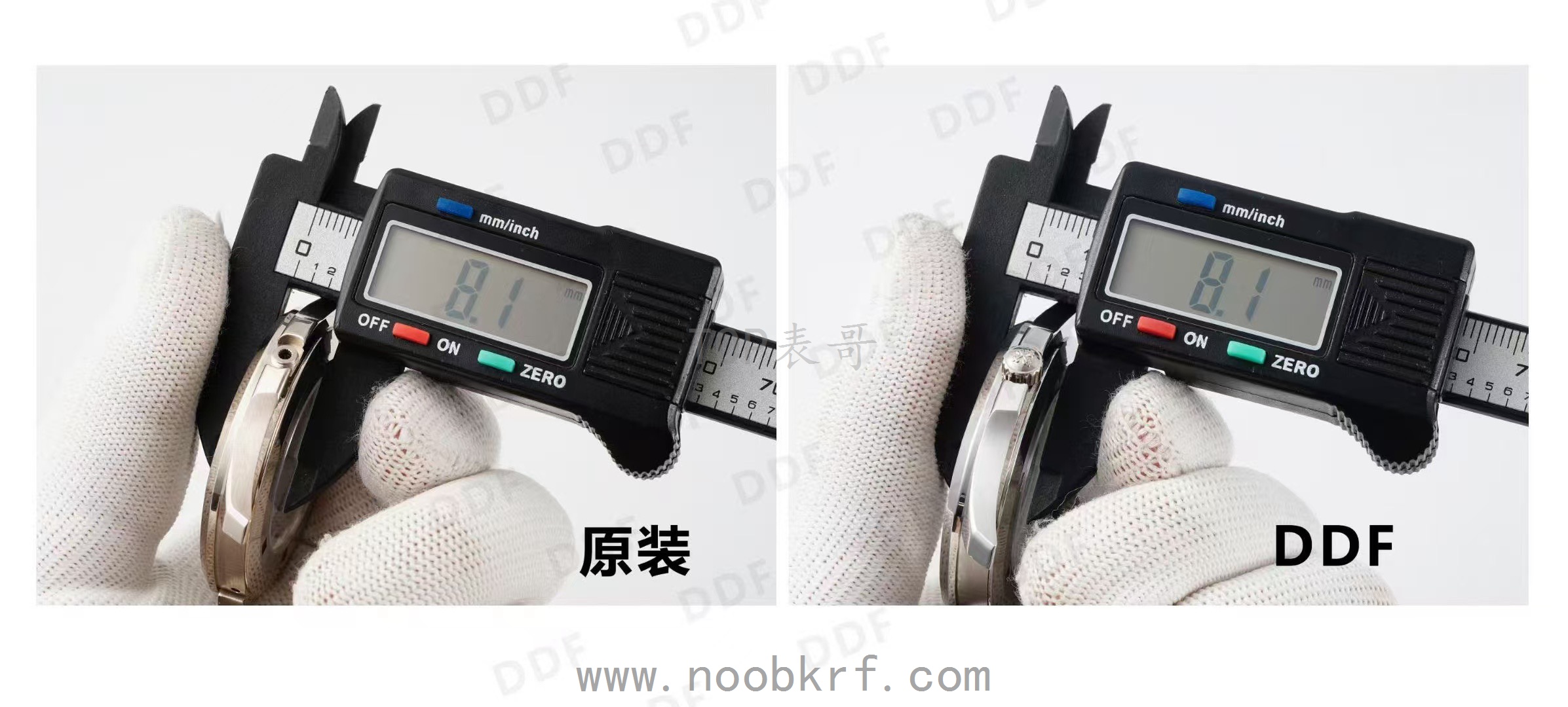 3、表壳方面,正品采用的是18K白金材质,而DDF工厂采用的是内胆配重材料,外层精钢包裹,这样就可以适配加工包金工艺处理。图片拍照出来的色差主要是因为正品表壳多多少少存在点氧化的情况出现,呈现出泛黄的感觉,这个也是白金的一个特点,而这一点精钢是没办法做到同步的,不过加工厚包金后可以实现这一点颜色变化的同步。