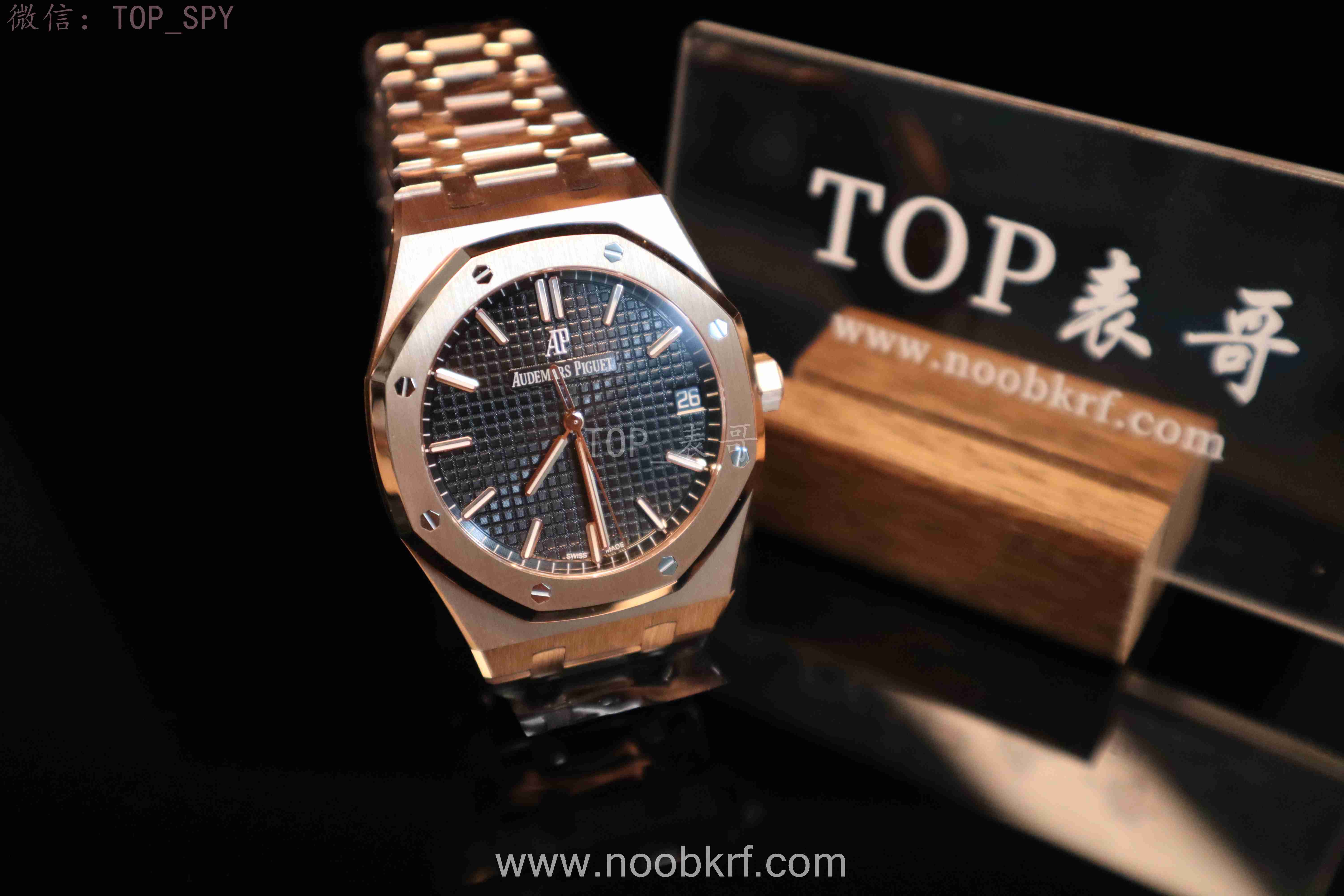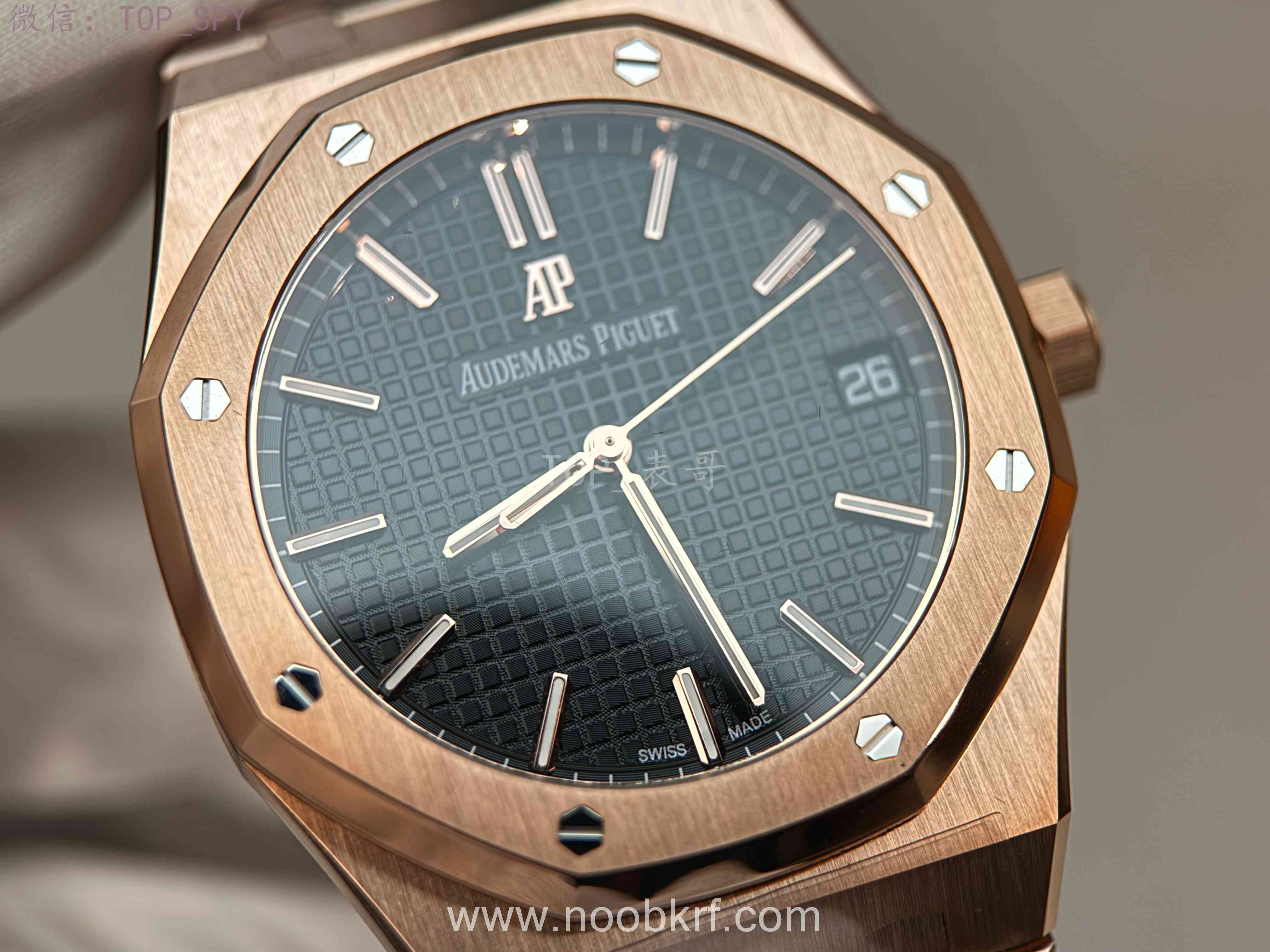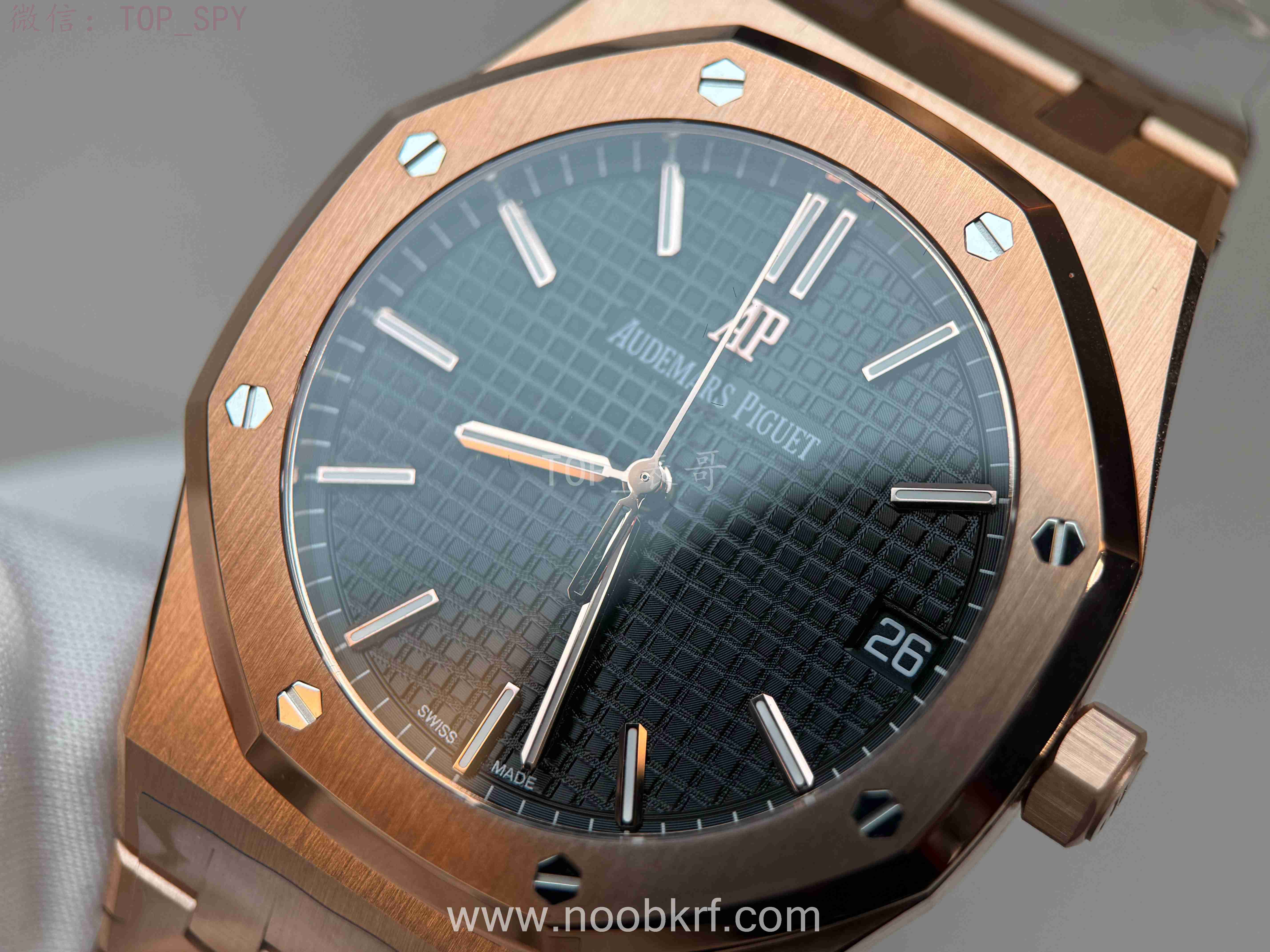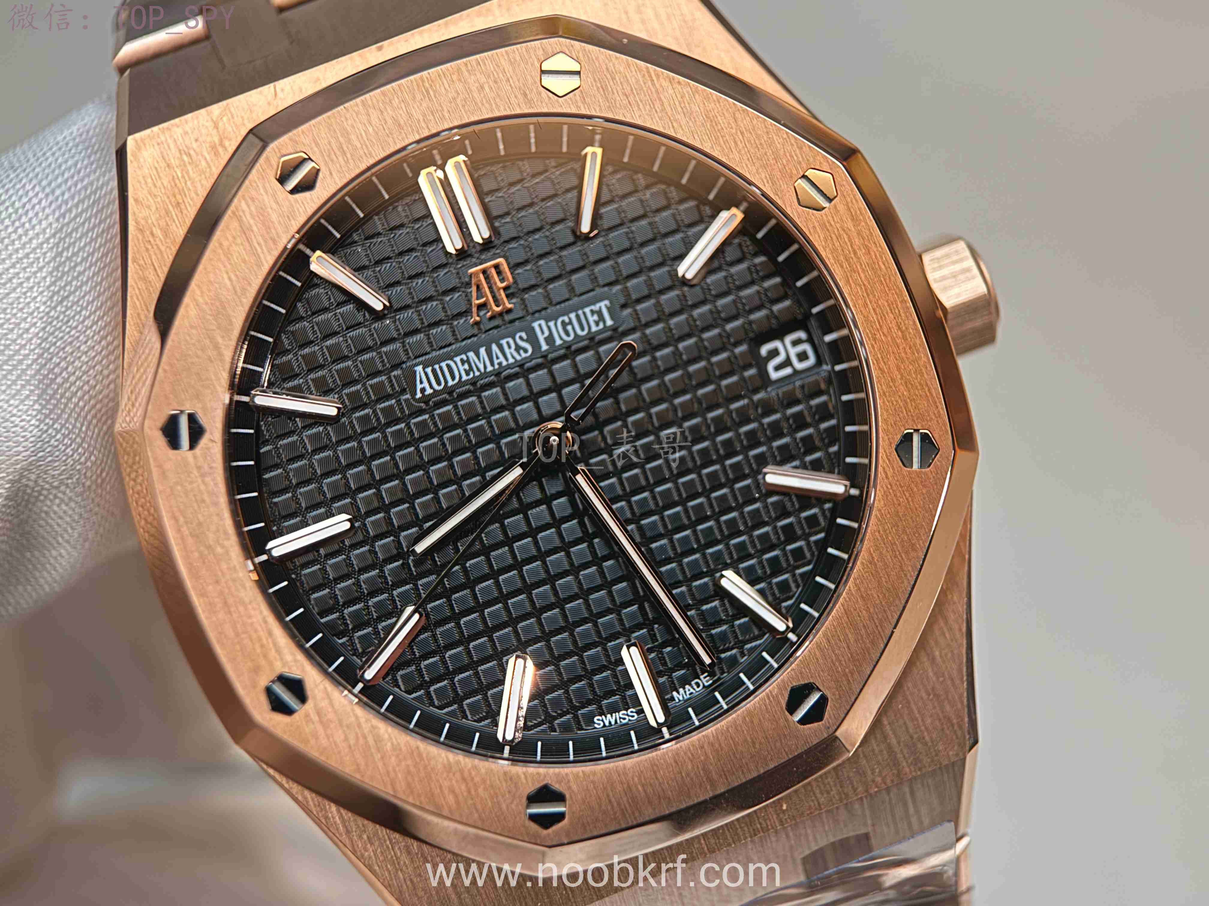 表盘核心设计为皇家橡树标志性的“Grande Tapisserie”大格纹装饰,多以黑色为主,搭配18K玫瑰金荧光立体时标与皇家橡树专属指针,3点位设有日期显示视窗,位置远离表盘中心,设计更具层次感,夜光涂层加持,确保昏暗环境下也能清晰读时。表带分为两种主流款式,一种是全18K玫瑰金链带,另一种是手工缝制“方形大格纹”黑色鳄鱼皮表带,均搭配18K玫瑰金折叠扣,兼顾牢固性与奢华感。