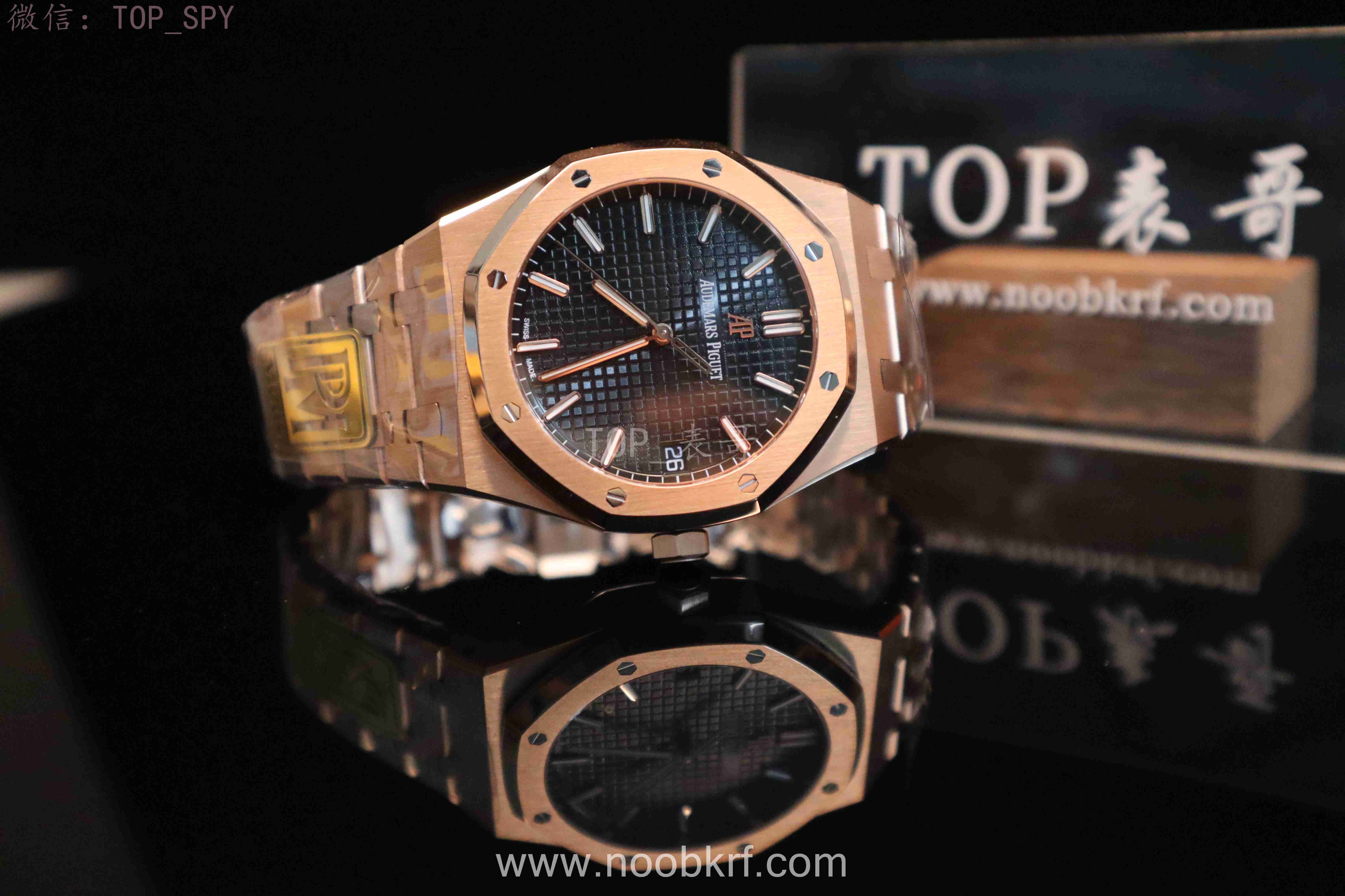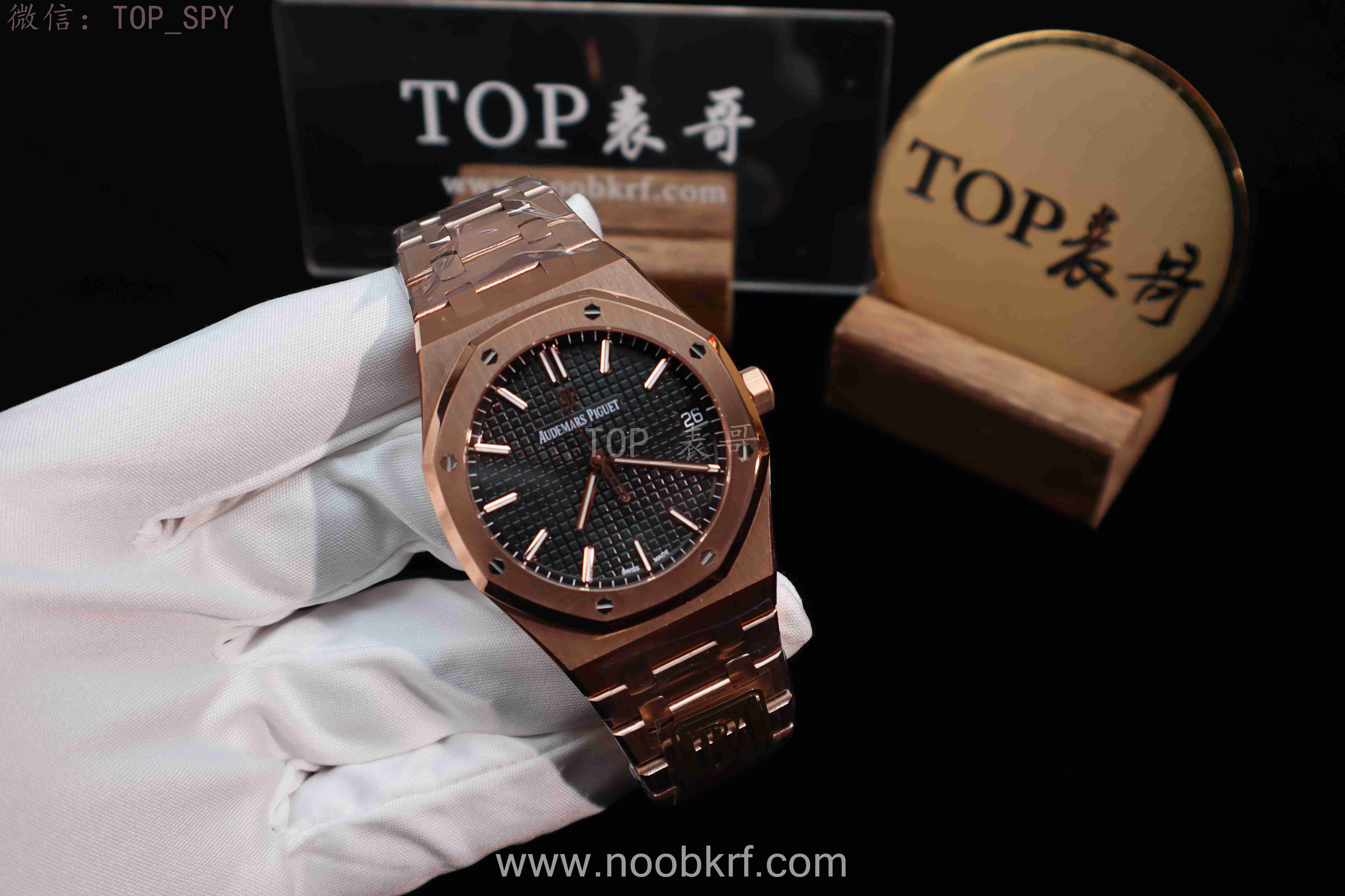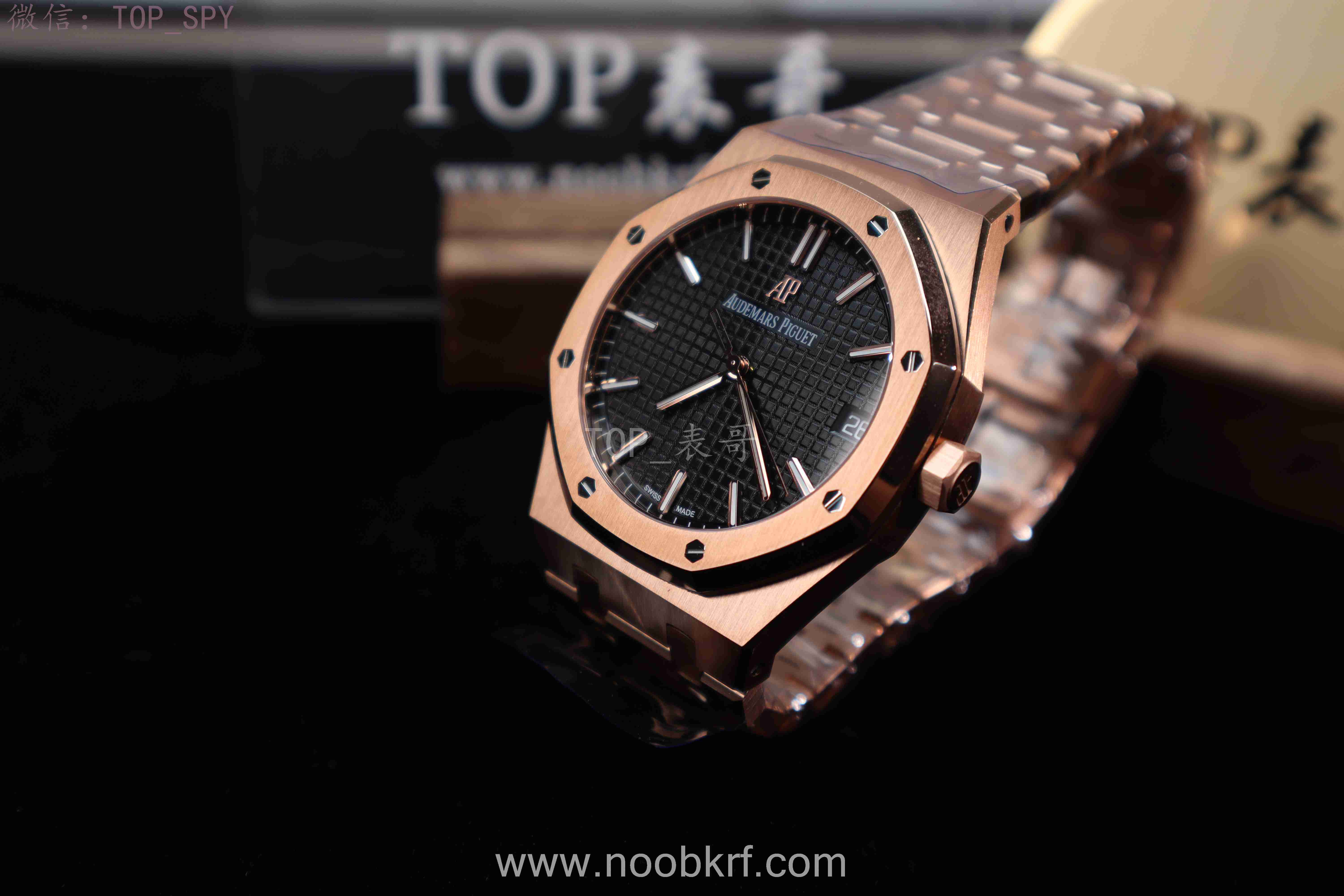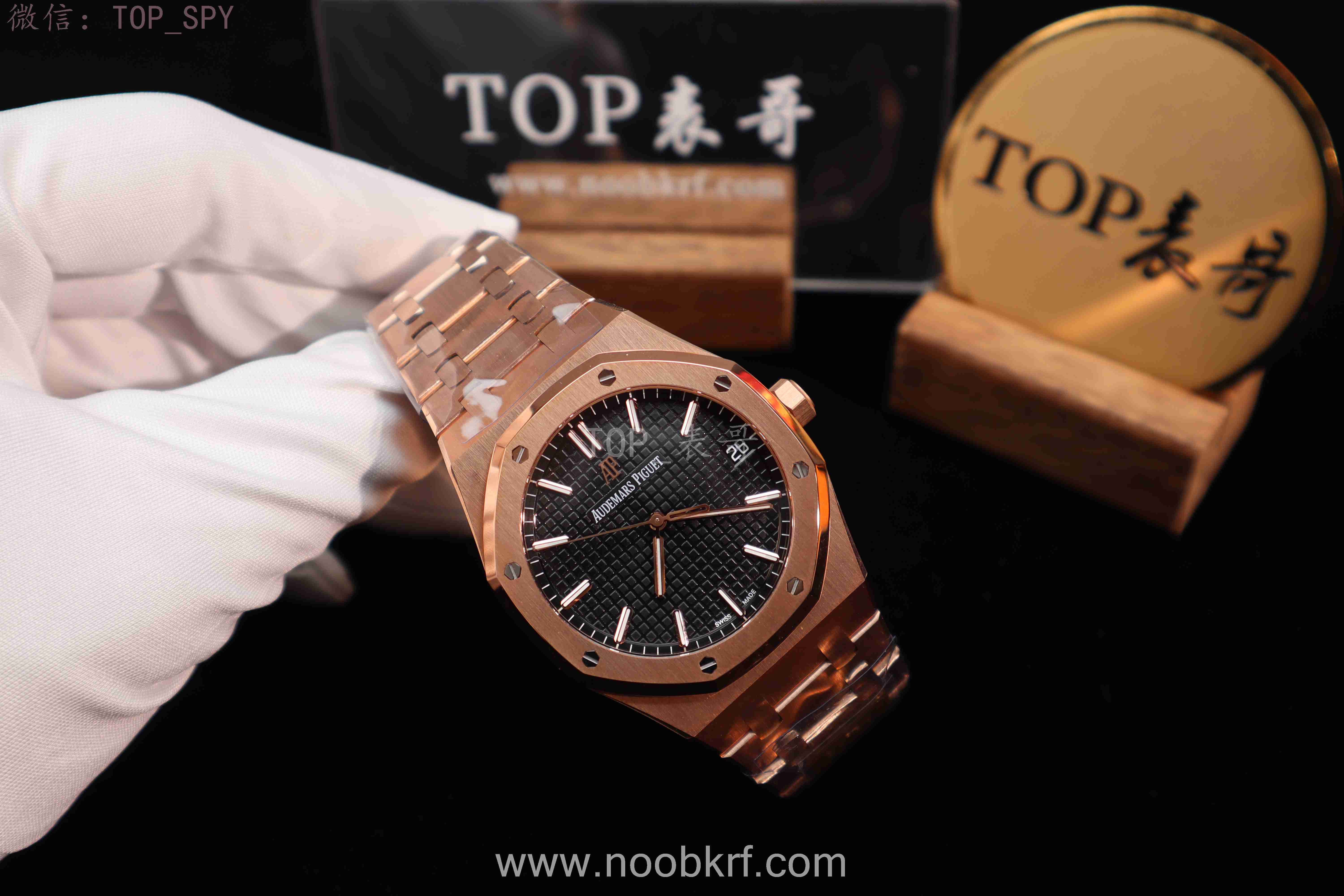 表盘核心设计为皇家橡树标志性的“Grande Tapisserie”大格纹装饰,多以黑色为主,搭配18K玫瑰金荧光立体时标与皇家橡树专属指针,3点位设有日期显示视窗,位置远离表盘中心,设计更具层次感,夜光涂层加持,确保昏暗环境下也能清晰读时。表带分为两种主流款式,一种是全18K玫瑰金链带,另一种是手工缝制“方形大格纹”黑色鳄鱼皮表带,均搭配18K玫瑰金折叠扣,兼顾牢固性与奢华感。