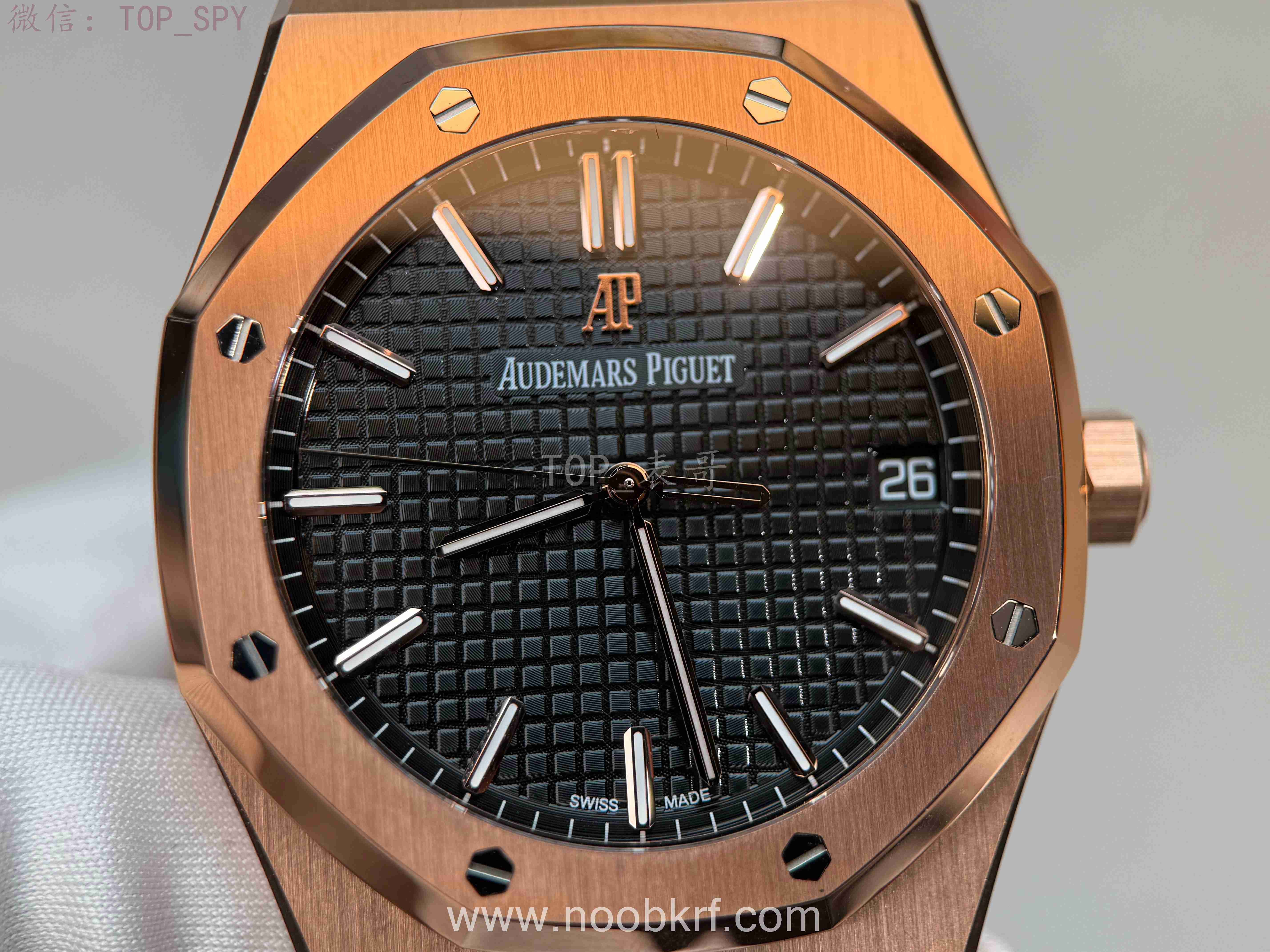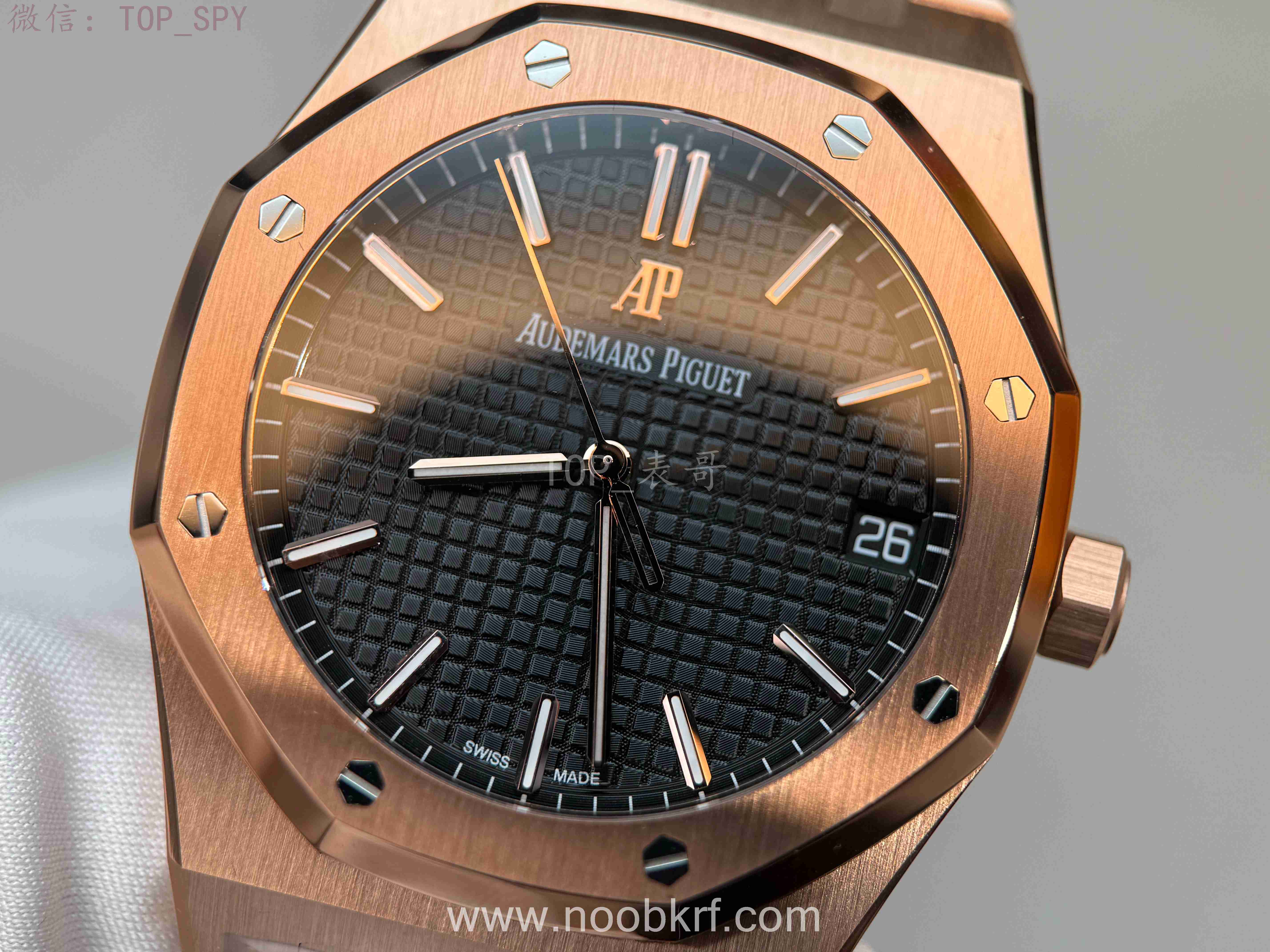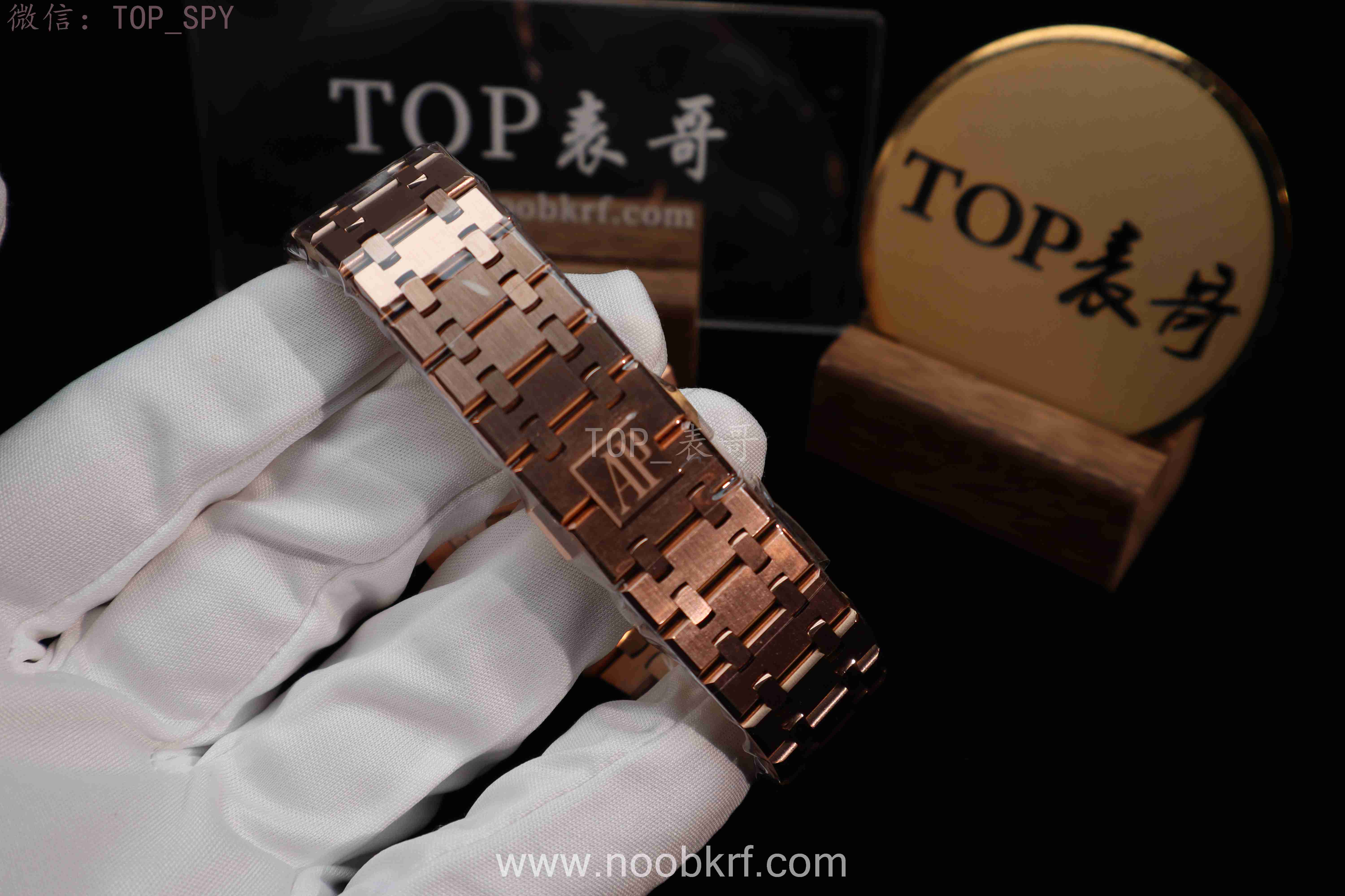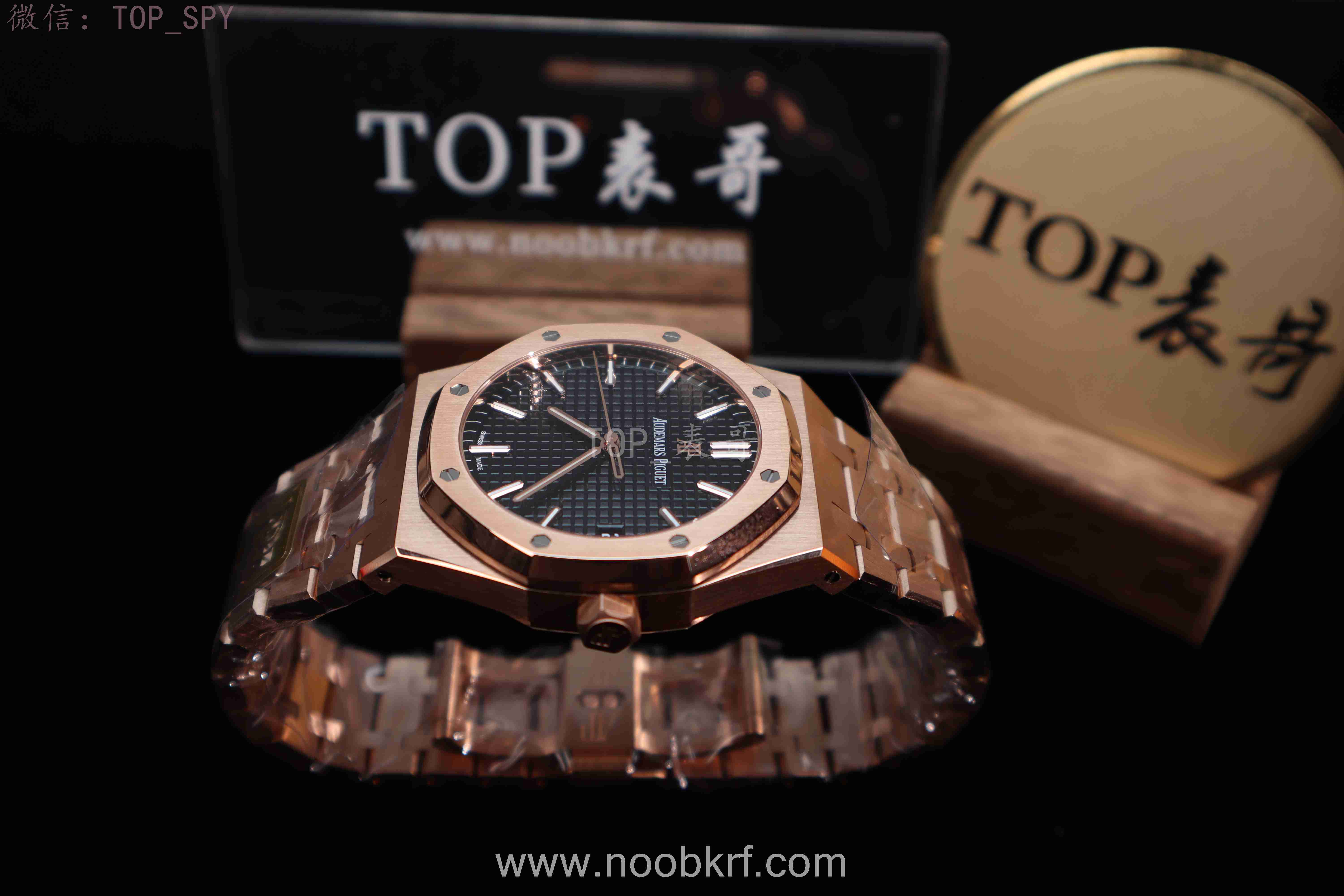 表盘核心设计为皇家橡树标志性的“Grande Tapisserie”大格纹装饰,多以黑色为主,搭配18K玫瑰金荧光立体时标与皇家橡树专属指针,3点位设有日期显示视窗,位置远离表盘中心,设计更具层次感,夜光涂层加持,确保昏暗环境下也能清晰读时。表带分为两种主流款式,一种是全18K玫瑰金链带,另一种是手工缝制“方形大格纹”黑色鳄鱼皮表带,均搭配18K玫瑰金折叠扣,兼顾牢固性与奢华感。