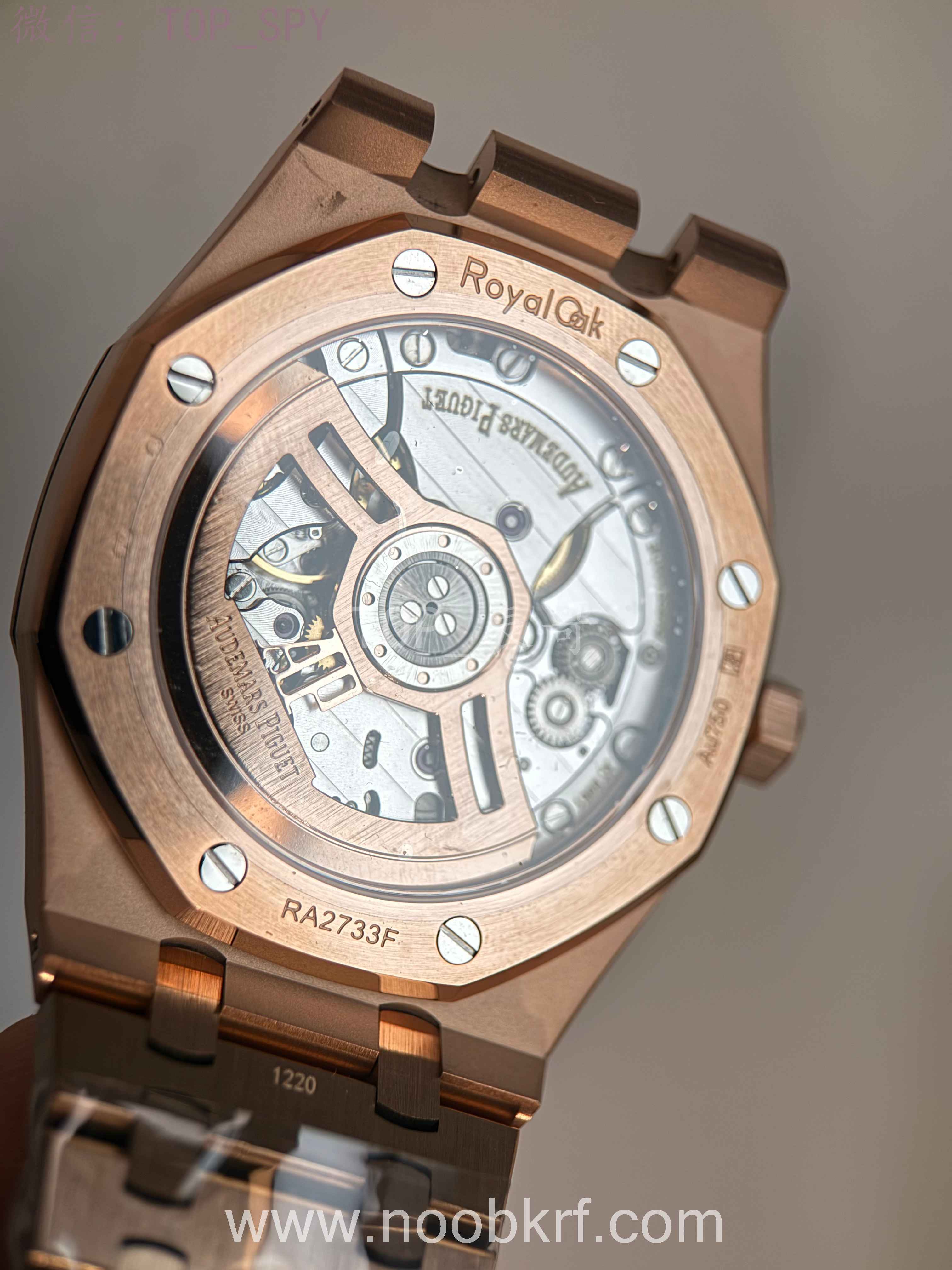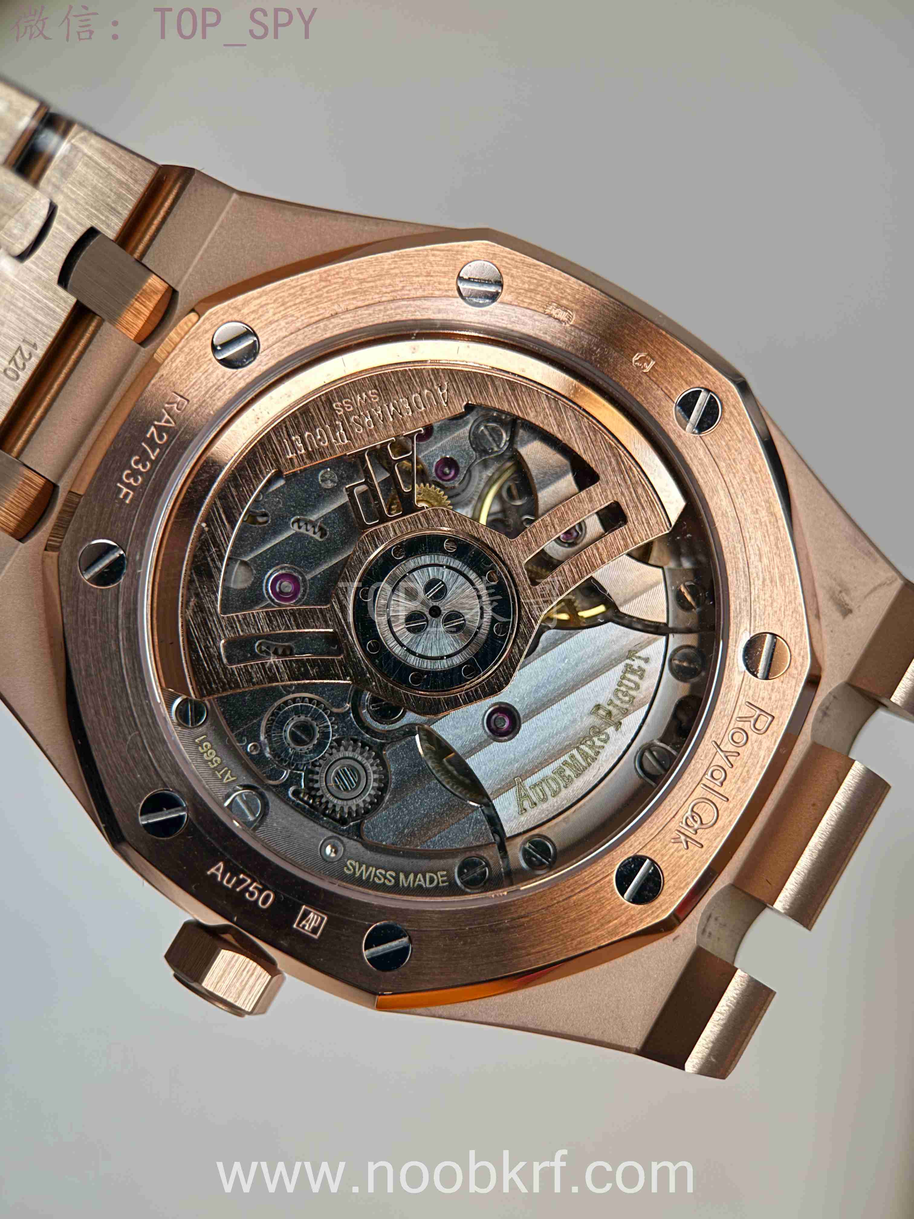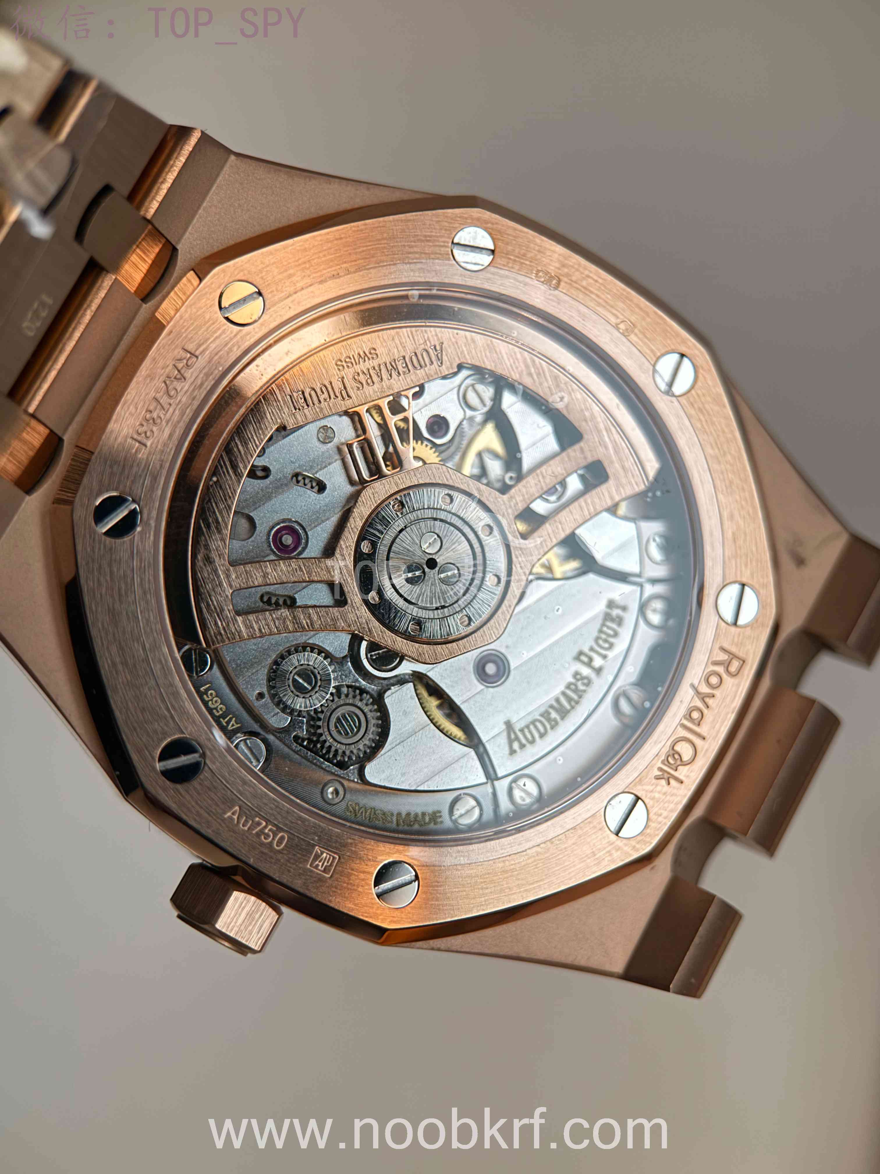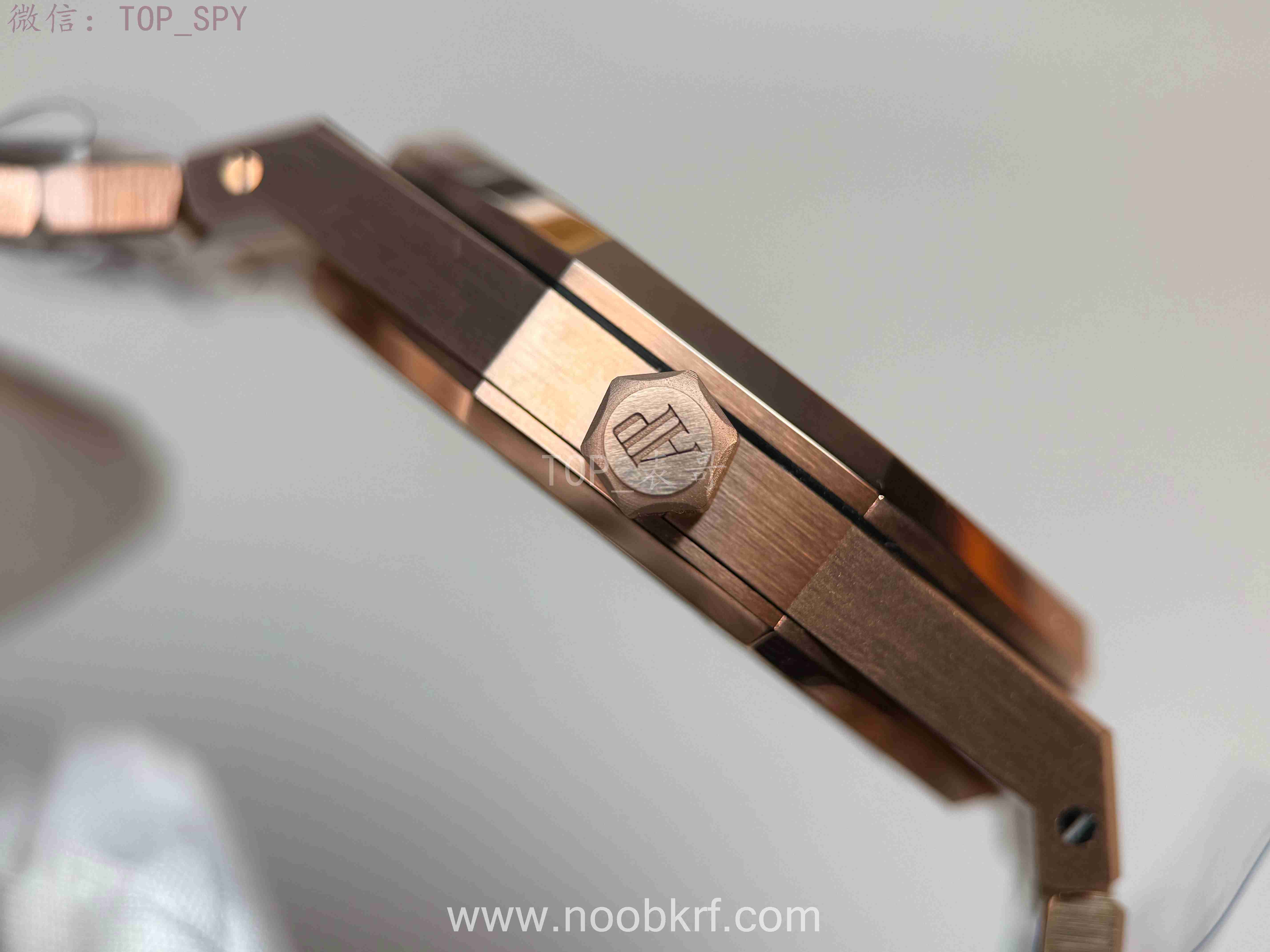 表壳采用41mm 18K玫瑰金打造,厚度约10.5毫米,尺寸适中,适配多数手腕,兼顾气场与佩戴舒适度。标志性的八角形表圈同样为18K玫瑰金材质,镶嵌8颗外露白金螺丝,延续皇家橡树系列的经典基因,表镜与表底均采用防眩光处理蓝宝石水晶,既保证读数清晰,又可透过背透设计欣赏机芯细节,表冠为旋入式,防水深度达50米,满足日常防水需求。