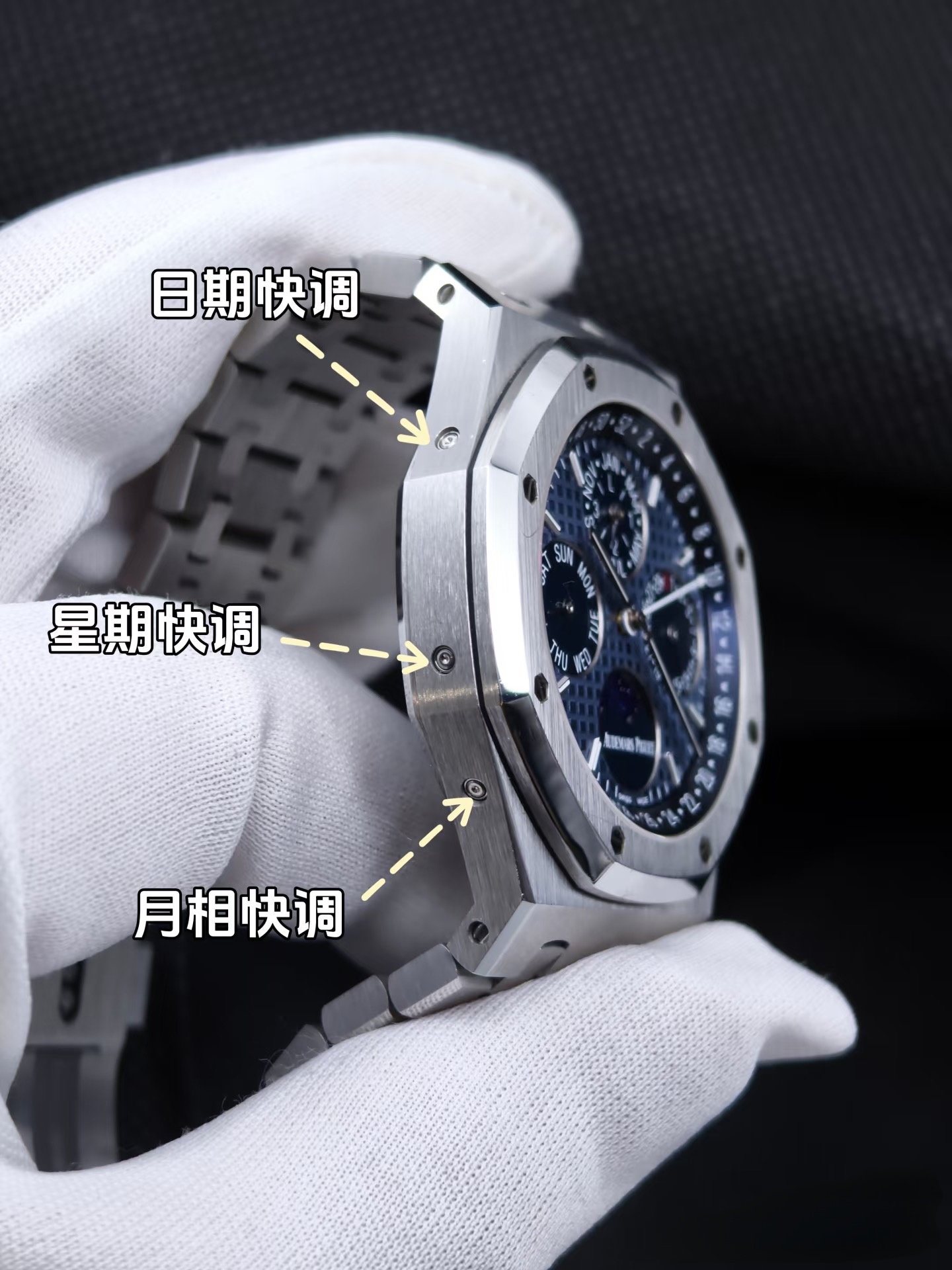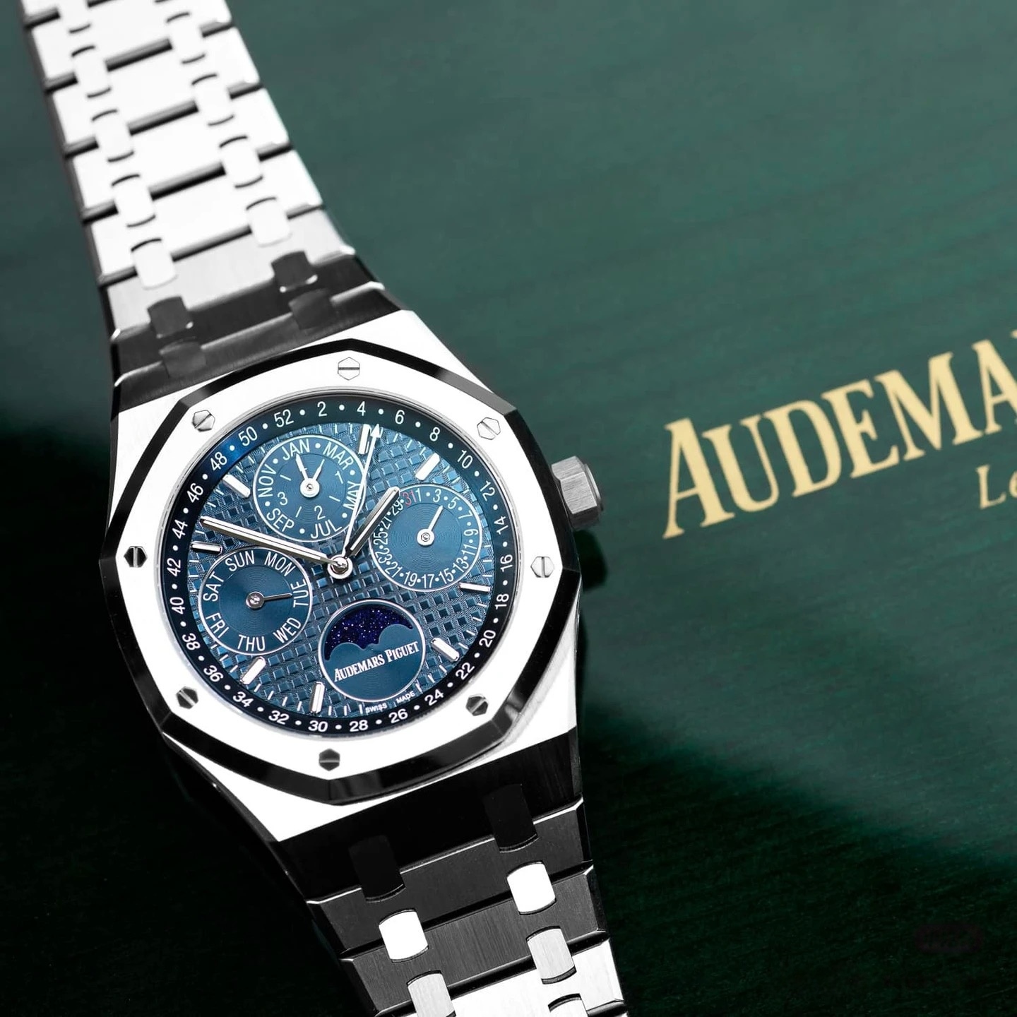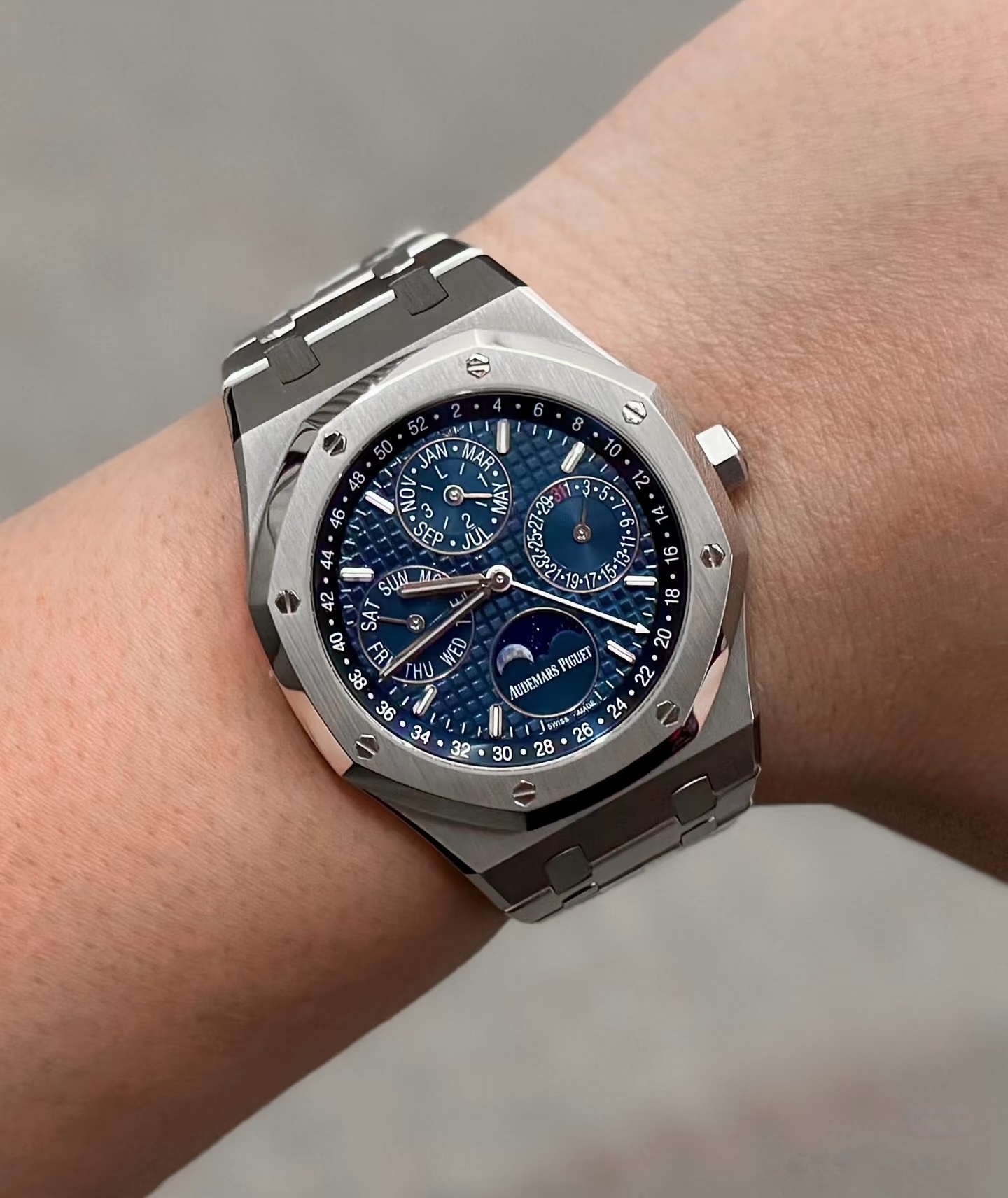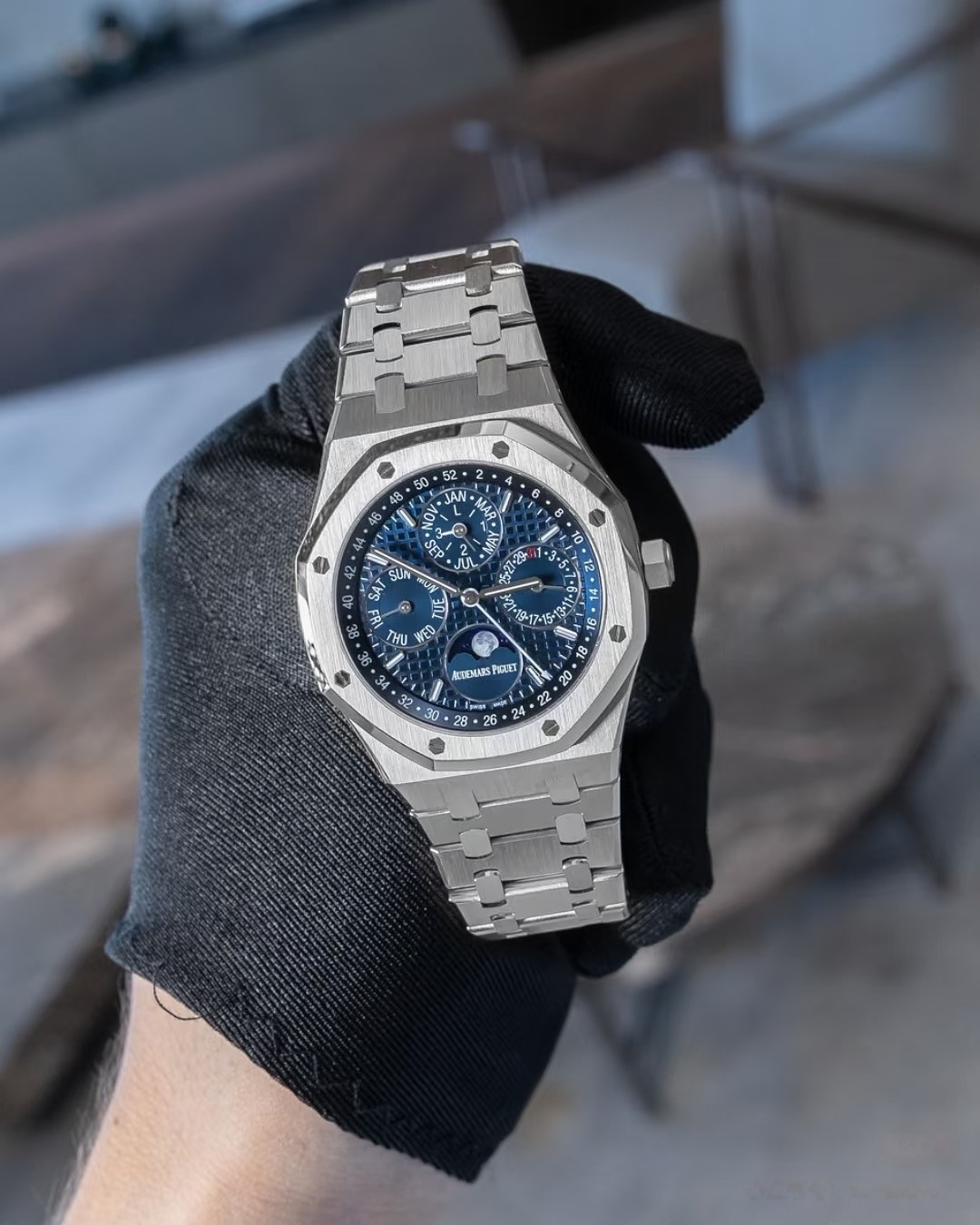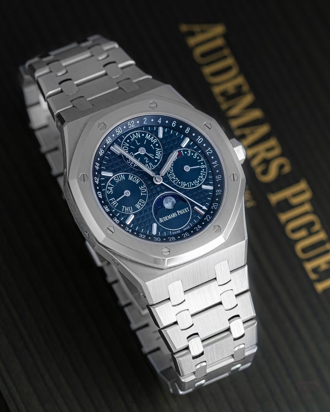 表盘采用专属云夜蓝盘面,色调深邃温润且带光泽渐变,光线变化下呈现丰富质感。表面布满皇家橡树标志性大格纹,手工压印打造,触感细腻且防反光,提升读时清晰度与表盘质感。
