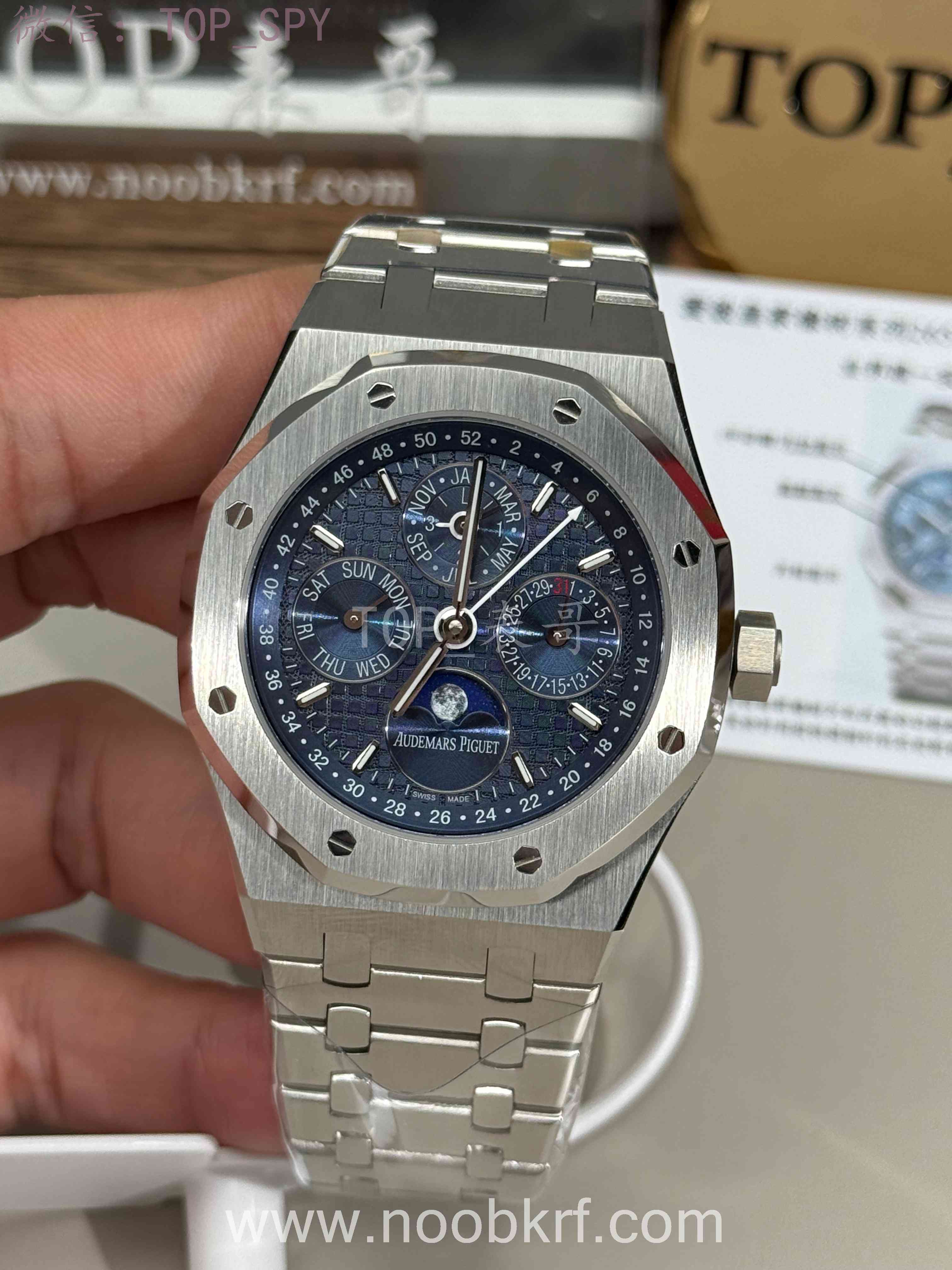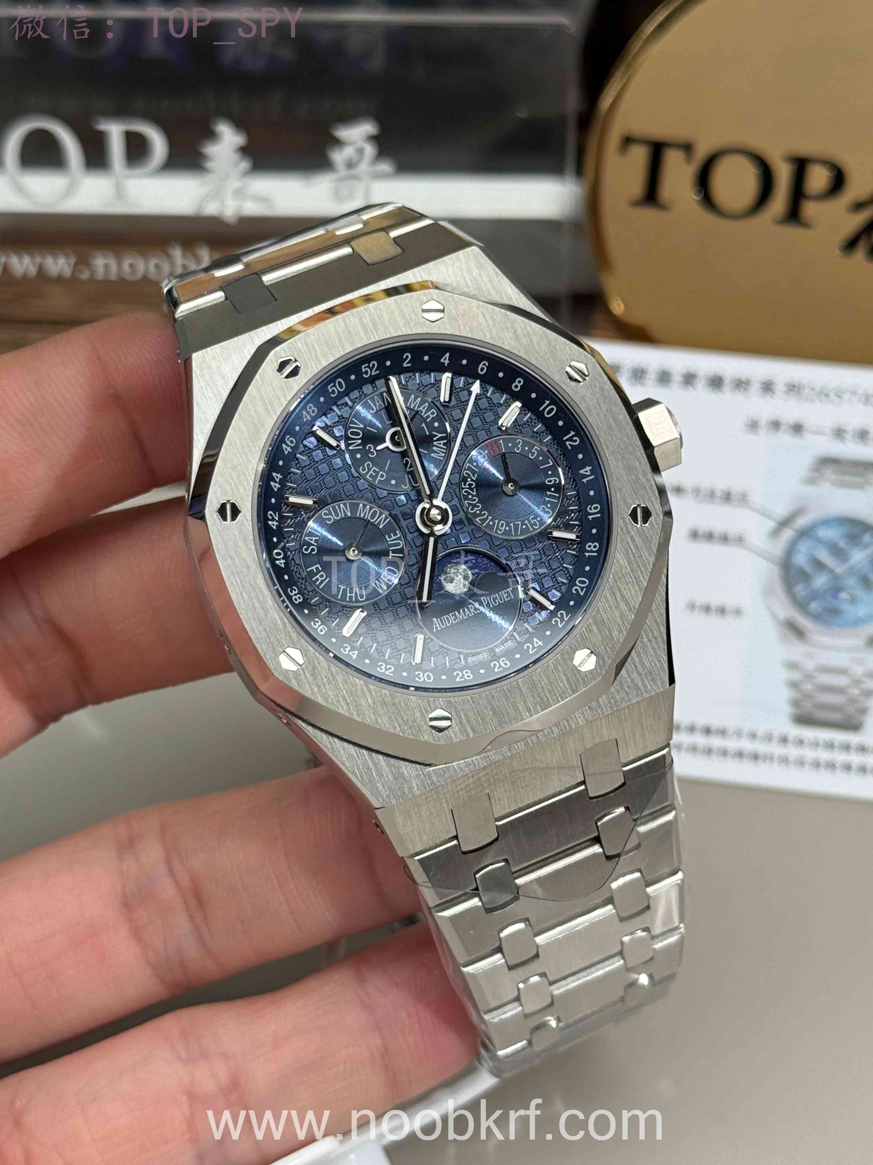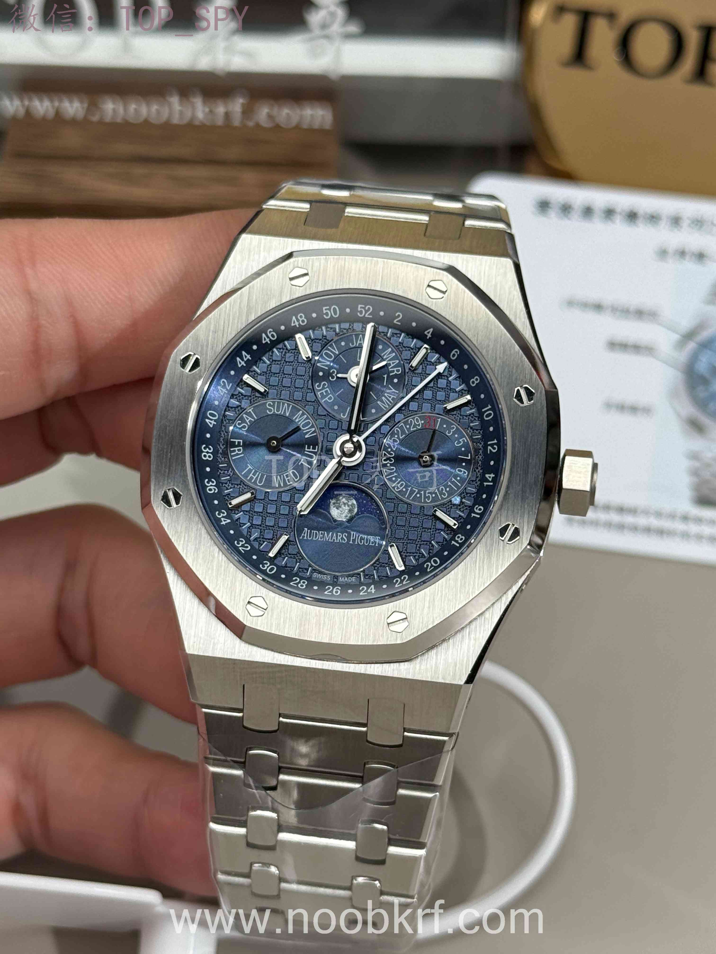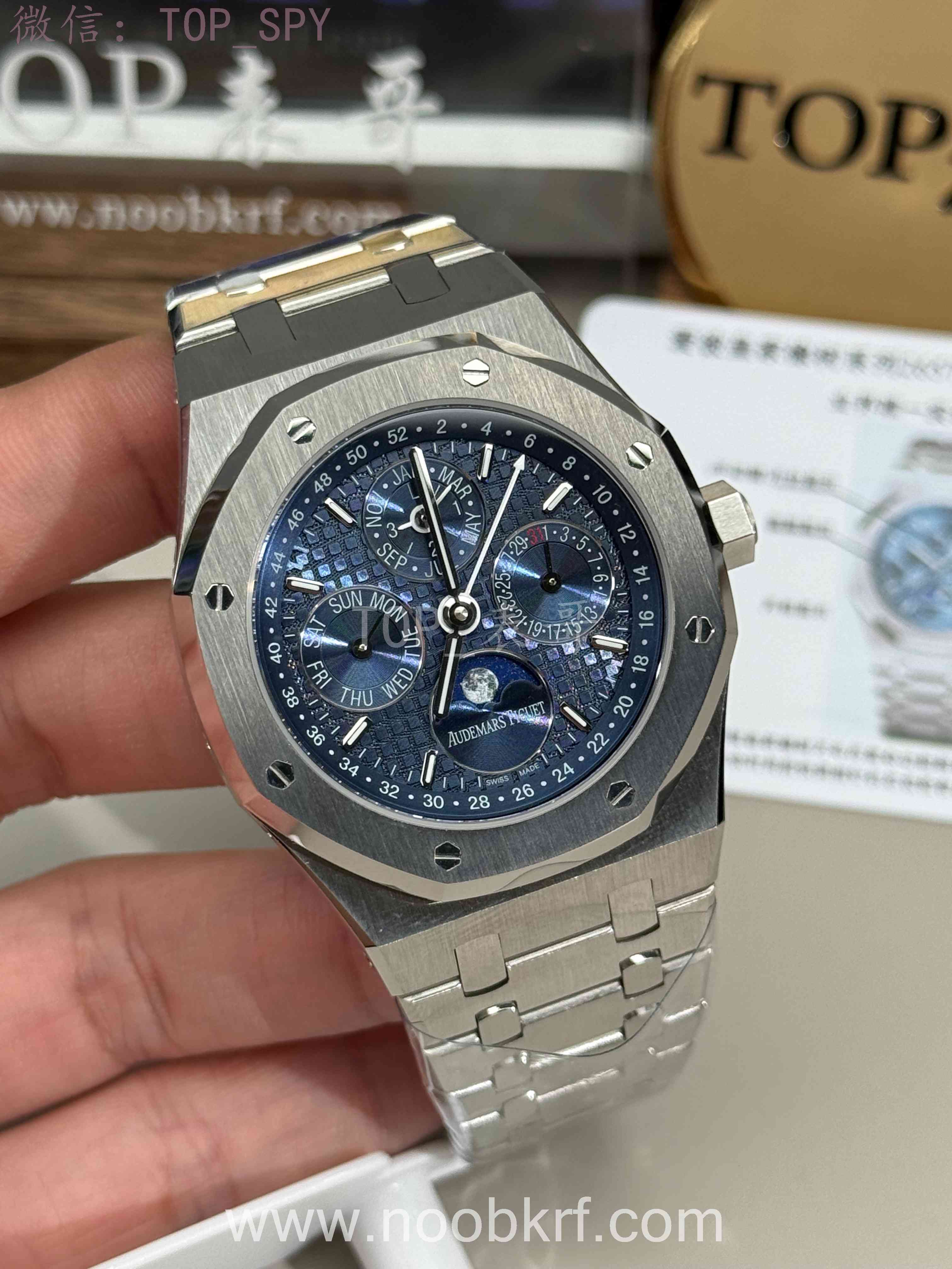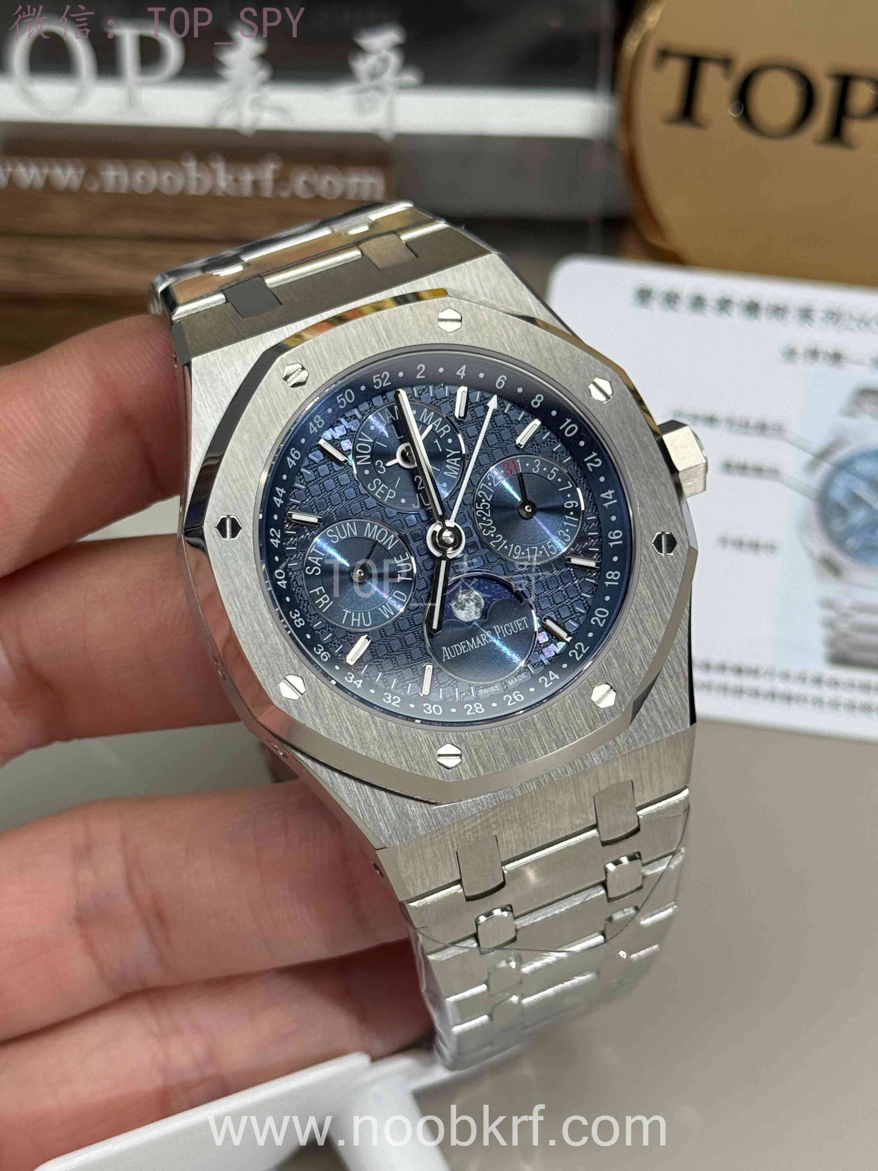 表盘采用专属云夜蓝盘面,色调深邃温润且带光泽渐变,光线变化下呈现丰富质感。表面布满皇家橡树标志性大格纹,手工压印打造,触感细腻且防反光,提升读时清晰度与表盘质感。