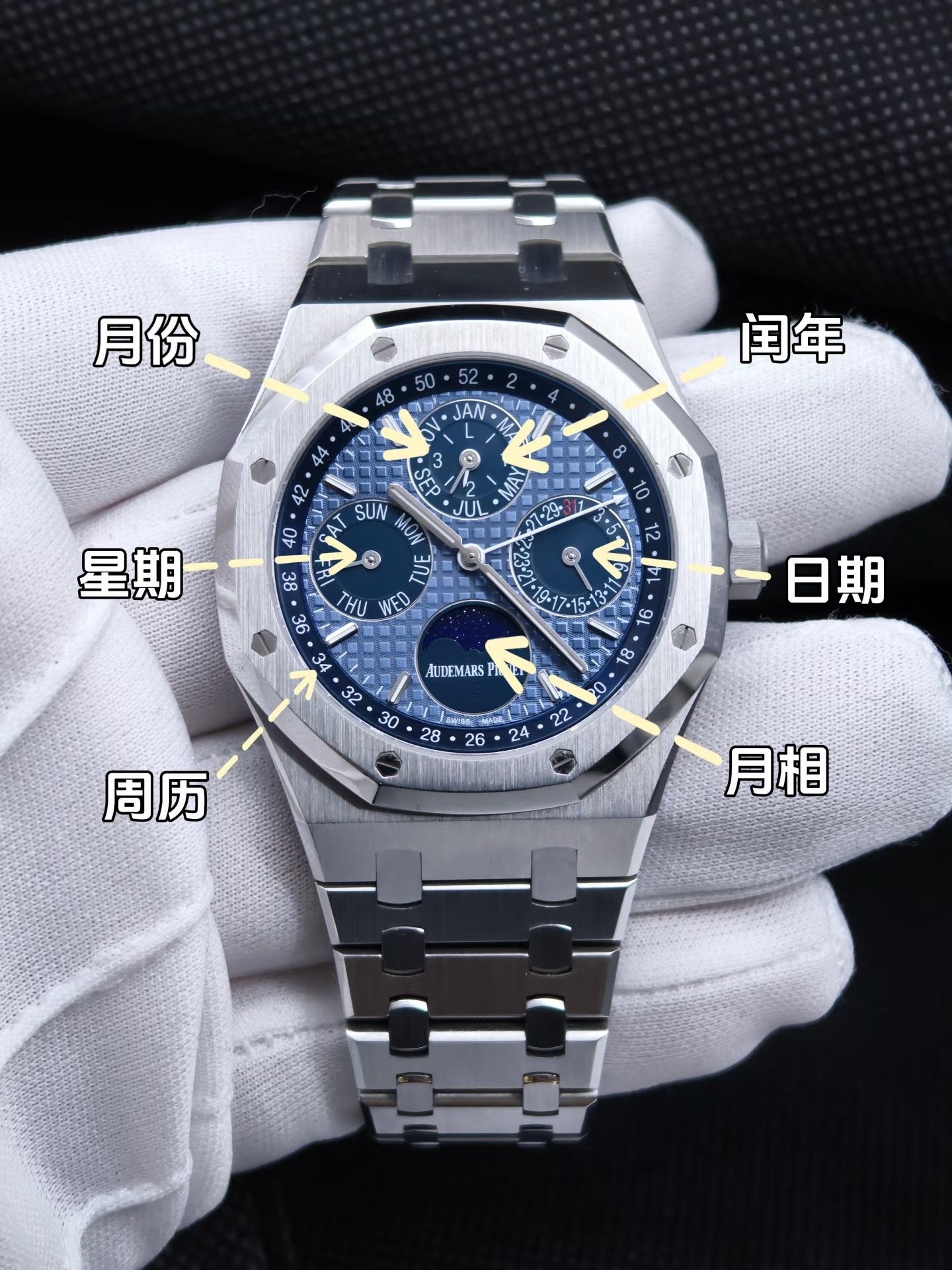 立体条形精钢时标经抛光处理,部分镶嵌Super-LumiNova夜光涂层,刻面精钢指针尖端也覆夜光涂层,暗光环境下读时清晰。表盘采用对称“四分盘”布局,分别对应星期(9点)、日期(3点)、月份+闰年(12点)、月相(6点)功能,副盘刻度精细,与主盘格纹形成对比,兼顾功能性与优雅感。