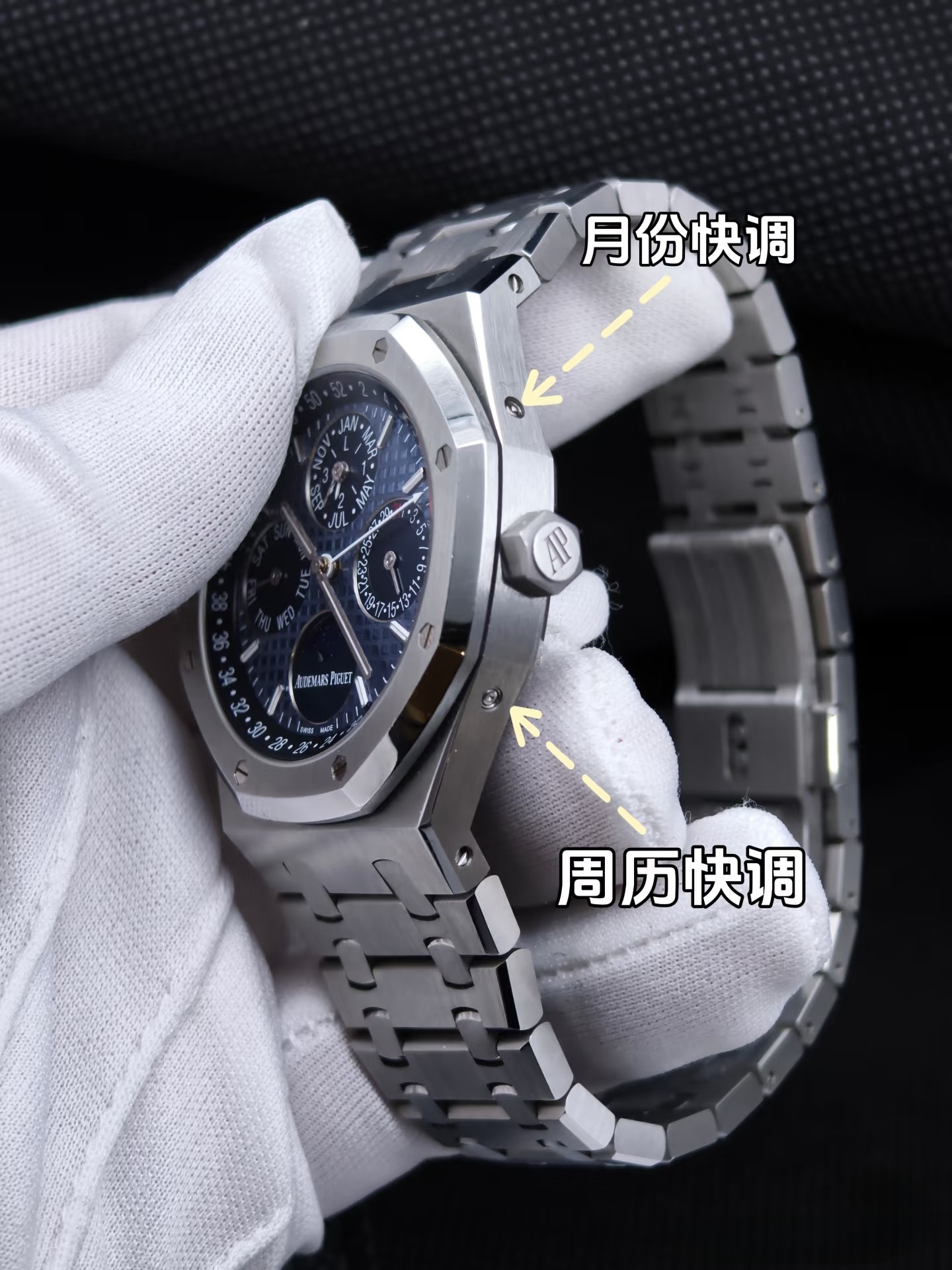 经典八角形表圈搭配8颗六角形精钢螺丝,螺丝头部抛光与拉丝表圈形成质感对比,可拆卸设计既保证牢固性,也是系列标志性元素。精钢表冠镌刻“AP”浮雕logo,防滑设计便于上链与调校,操作顺畅。