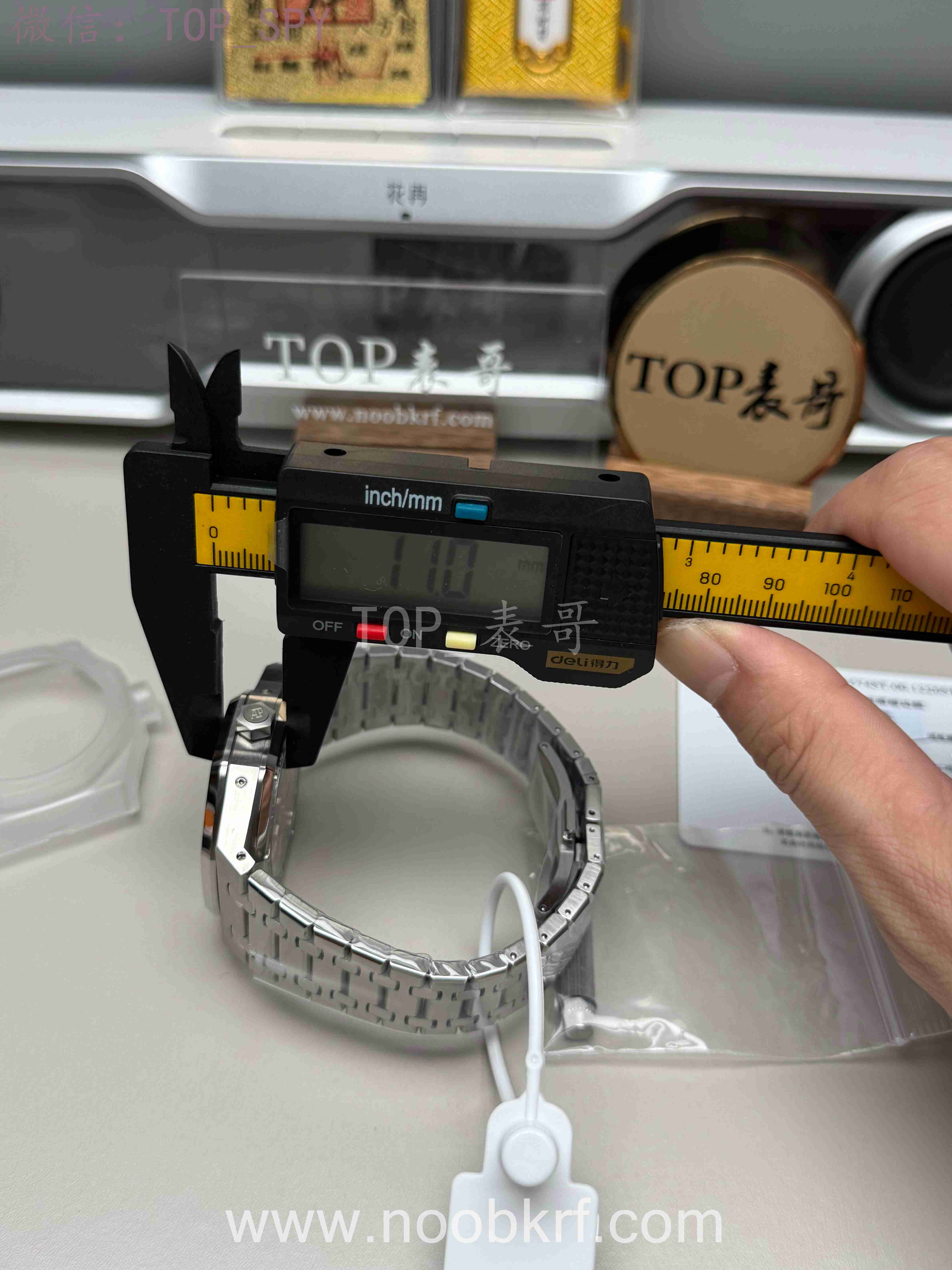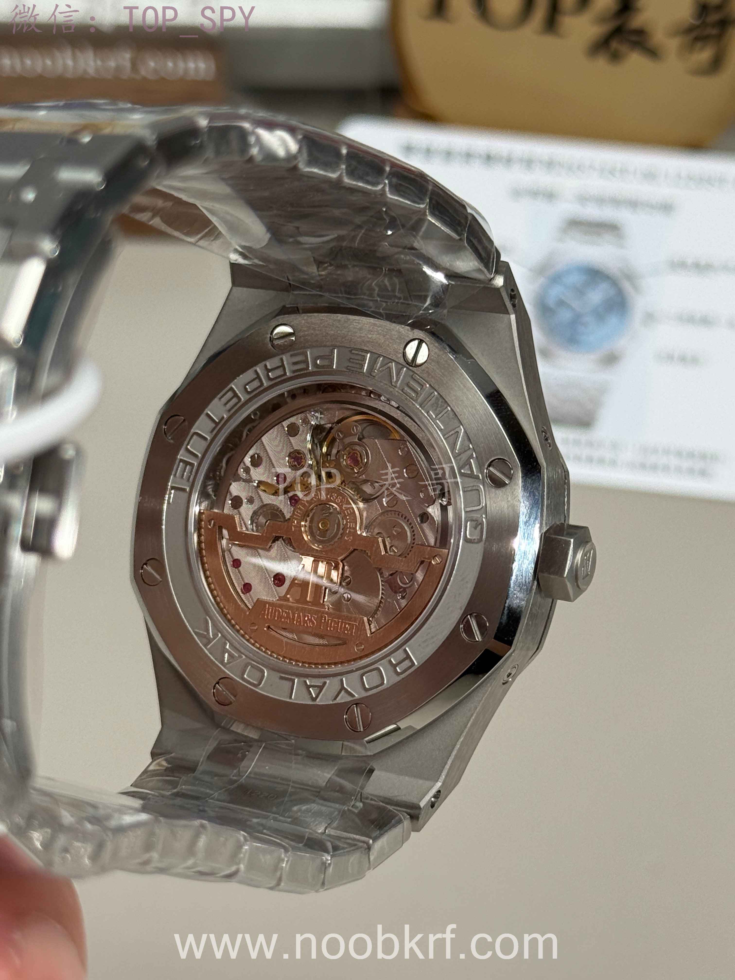 搭配皇家橡树标志性精钢五珠链带,链节采用拉丝+抛光工艺,衔接紧密,佩戴贴合不硌手。折叠安全表扣镌刻“AP”logo,开合顺畅、扣合牢固,带微调功能,可灵活适配手腕粗细。