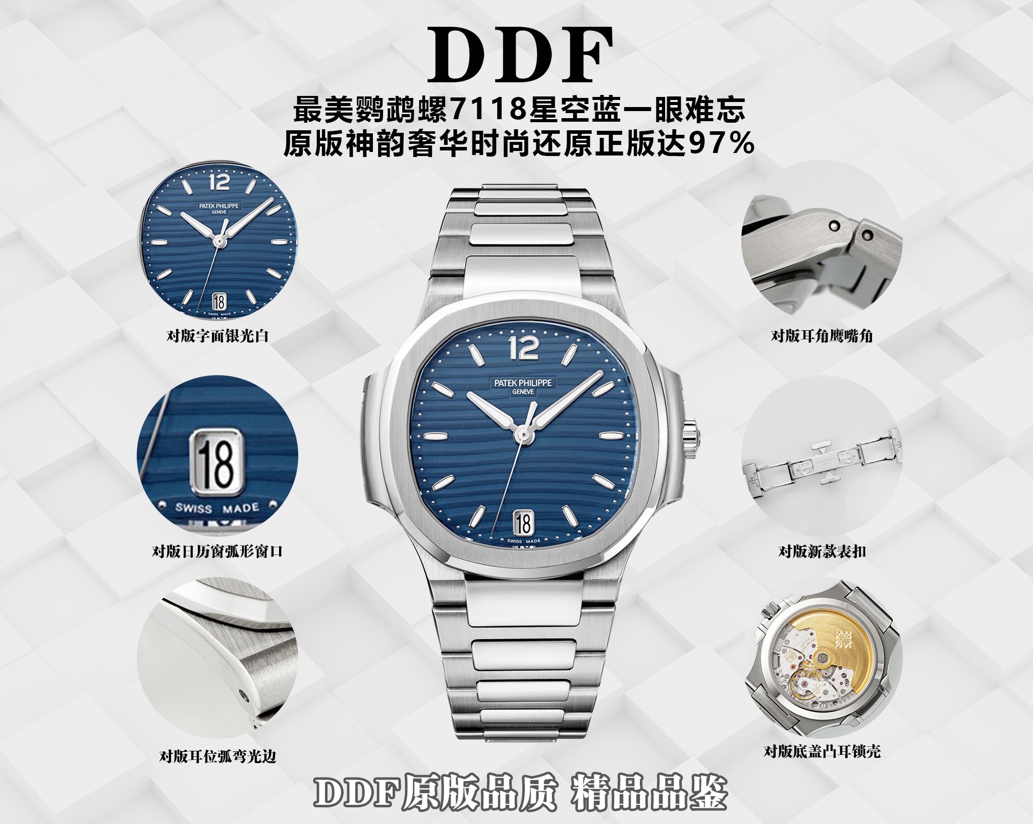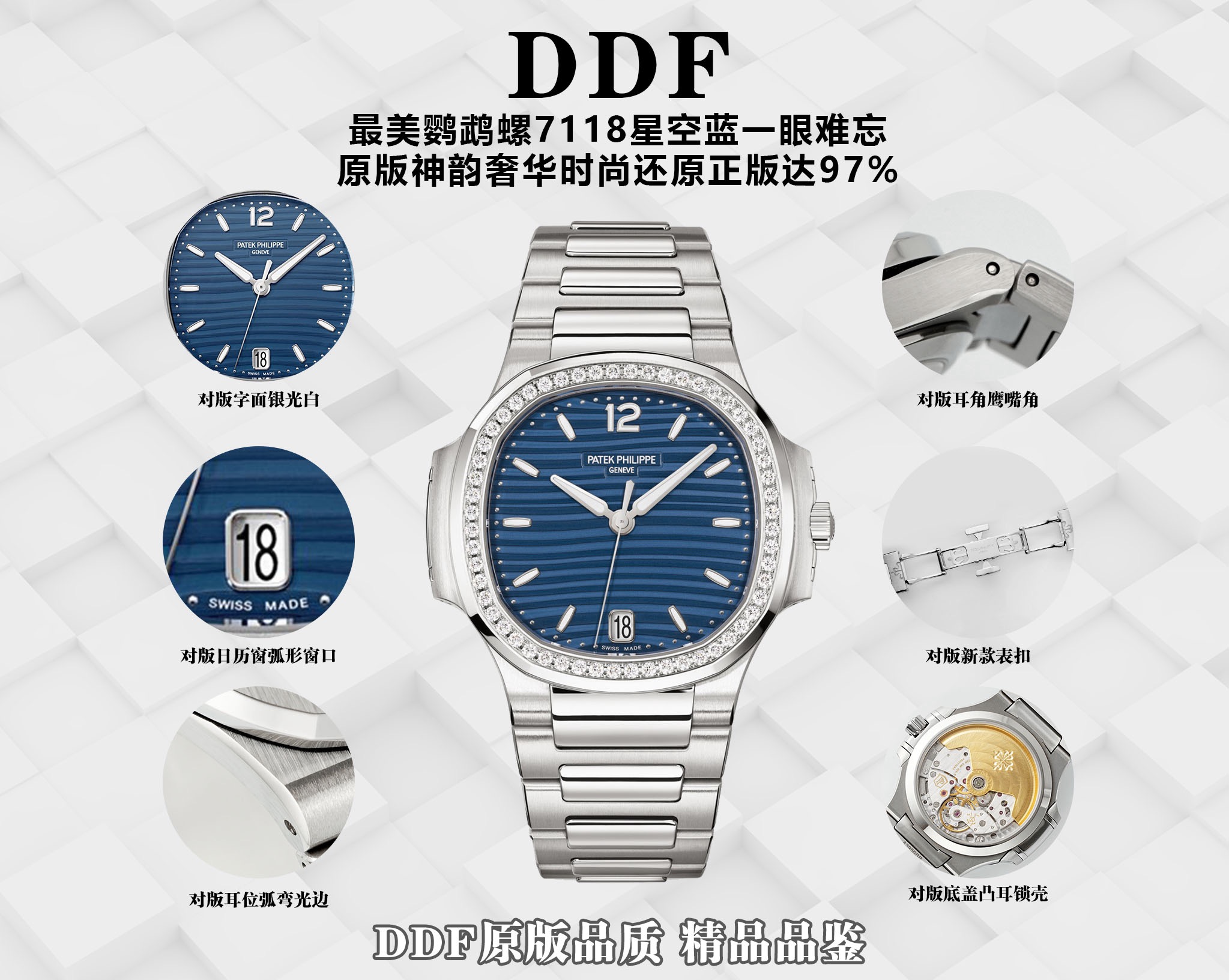 hello,大家好,我是TOP表哥,今天带给大家的腕表评测来自DDF工厂的百达翡丽女款鹦鹉螺7118精钢蓝盘腕表,腕表官方型号:百达翡丽运动优雅系列7118/1A-001腕表(精钢外圈版本)