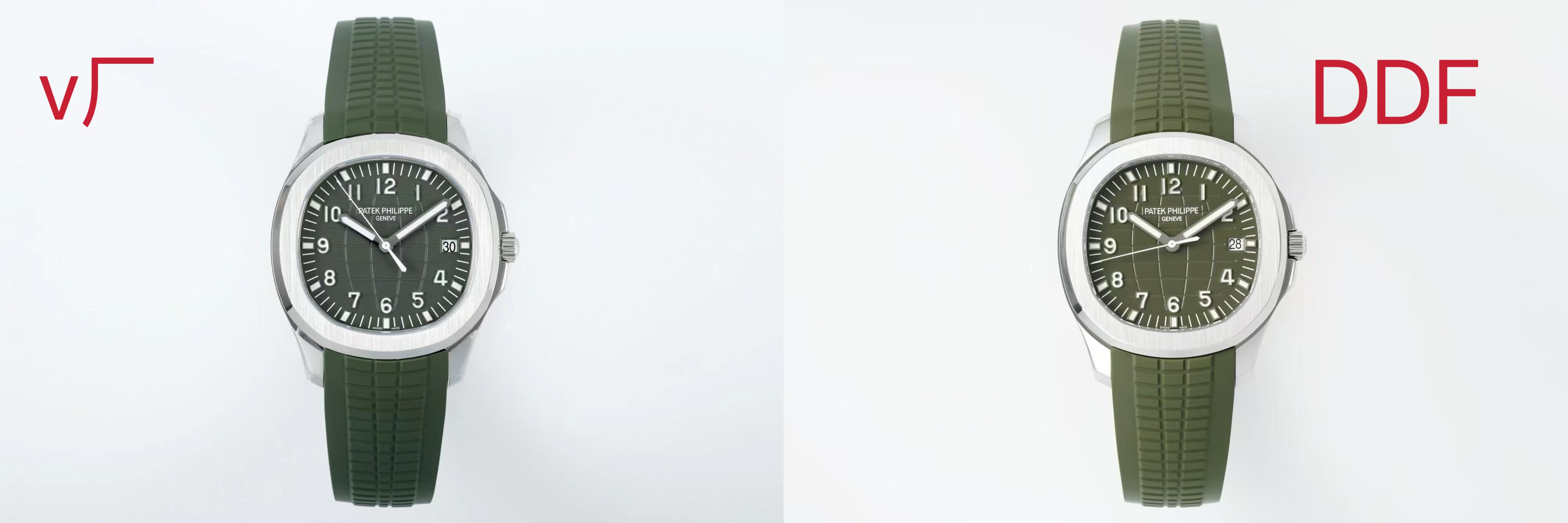 既然开篇表哥说了目前V厂的牛油果是目前最好的版本,那么首当其冲的肯定就是盘面的颜色,通过下图的并列对比不难发现,V厂在盘面颜色和胶带颜色方面均要比DDF厂更加对版,不得不说V厂好歹也是clean工厂的正宗接班人,哪怕到了百达翡丽这个品牌的复刻也还是在盘面的调色上做到了非常高的还原水准。