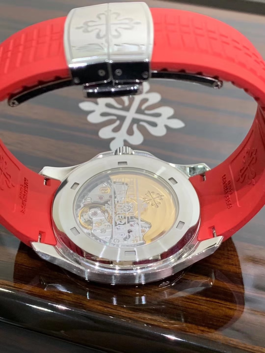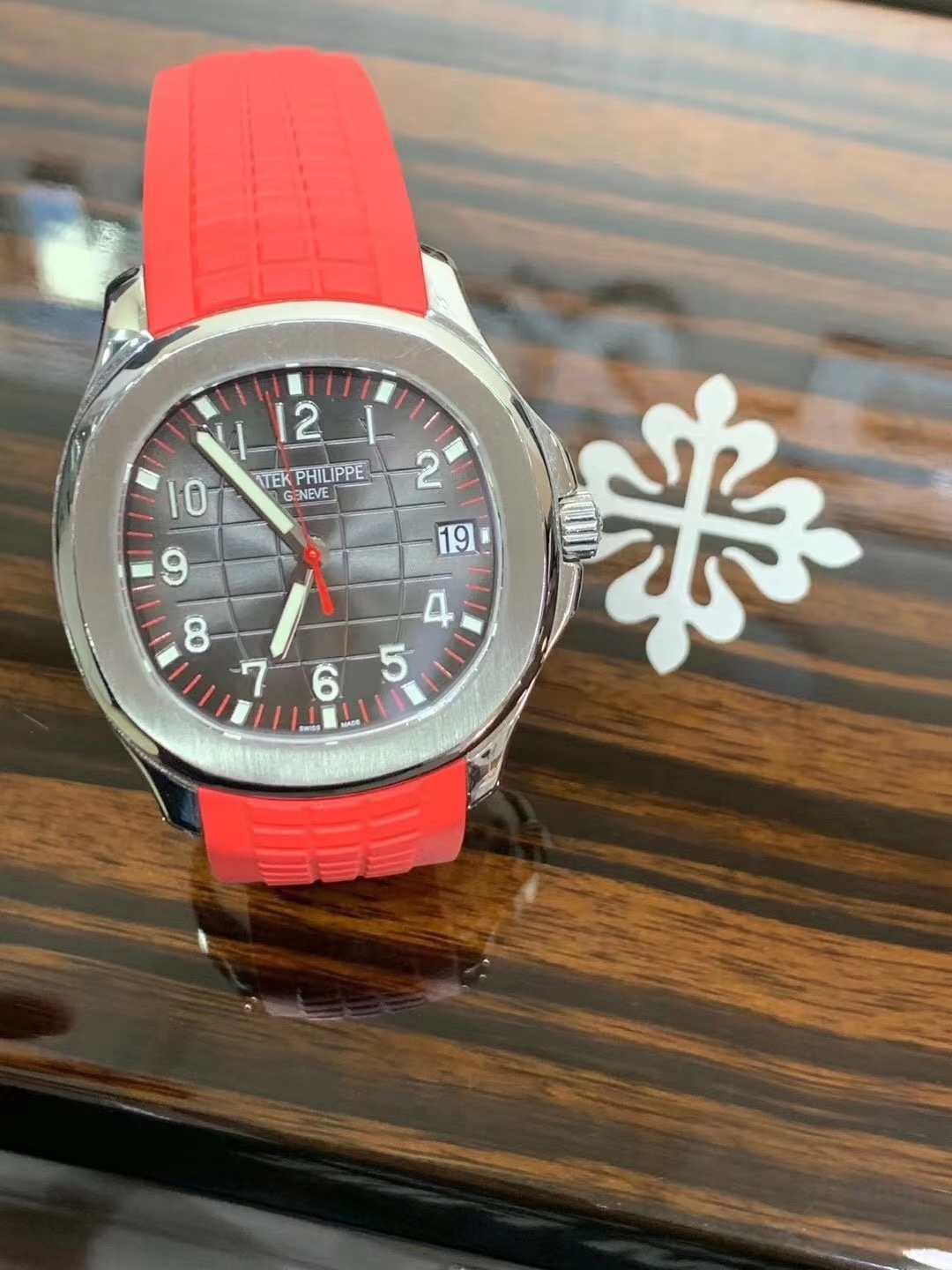 表盘设计极具辨识度,黑色浮雕棋盘格纹是Aquanaut系列的标志性元素,搭配红色分钟刻度圈与中央秒针,巧妙呼应新加坡国旗色彩,简约中暗藏巧思。表盘配备白金立体时标,覆有夜光涂层,3点位置设日期显示窗口,读时清晰便捷。表带采用红色Tropical复合材料,柔软耐用且透气性佳,搭配精钢折叠扣,佩戴安全稳固。