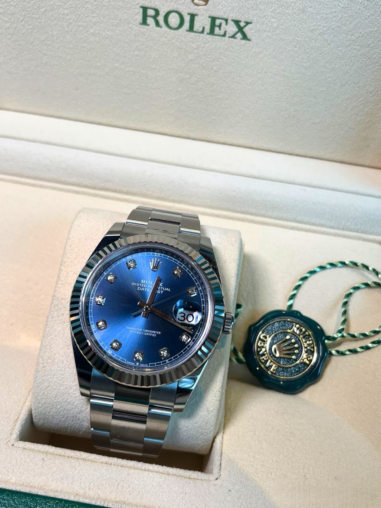 41毫米的表径适配多数腕围,无论是搭配正装出席商务场合,还是搭配休闲装日常出街,都能无缝衔接。它没有夸张的设计,却以蓝盘的温润与钻石的璀璨经得住时光考验,既是一枚精准可靠的时计,也是一份低调内敛的奢华,既适合年轻人作为第一块彰显格调的奢华腕表,开启劳力士收藏之旅,也能成为资深表友收藏清单中兼具颜值与价值的经典之选,完美诠释“经典与奢华共生”的真谛。
