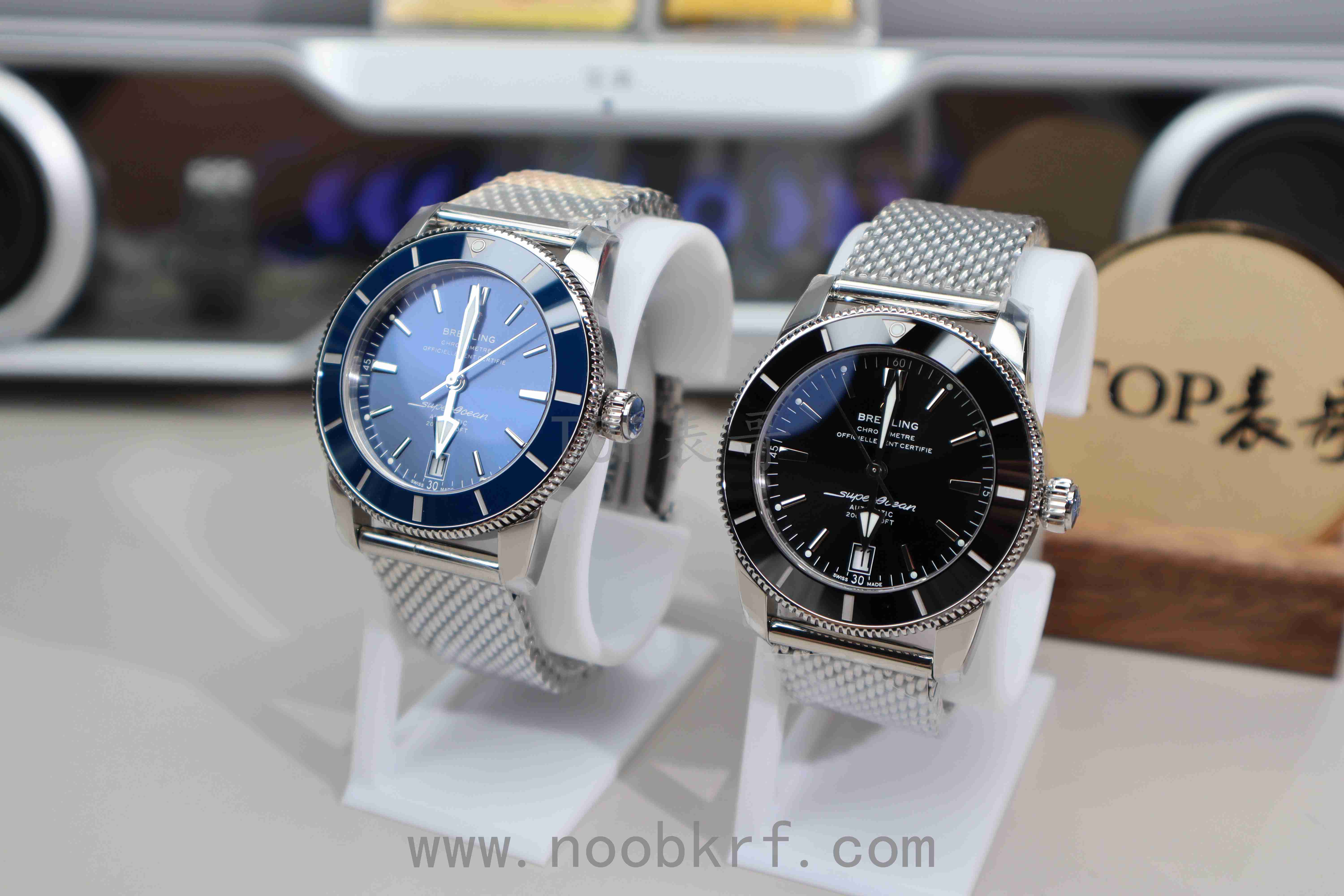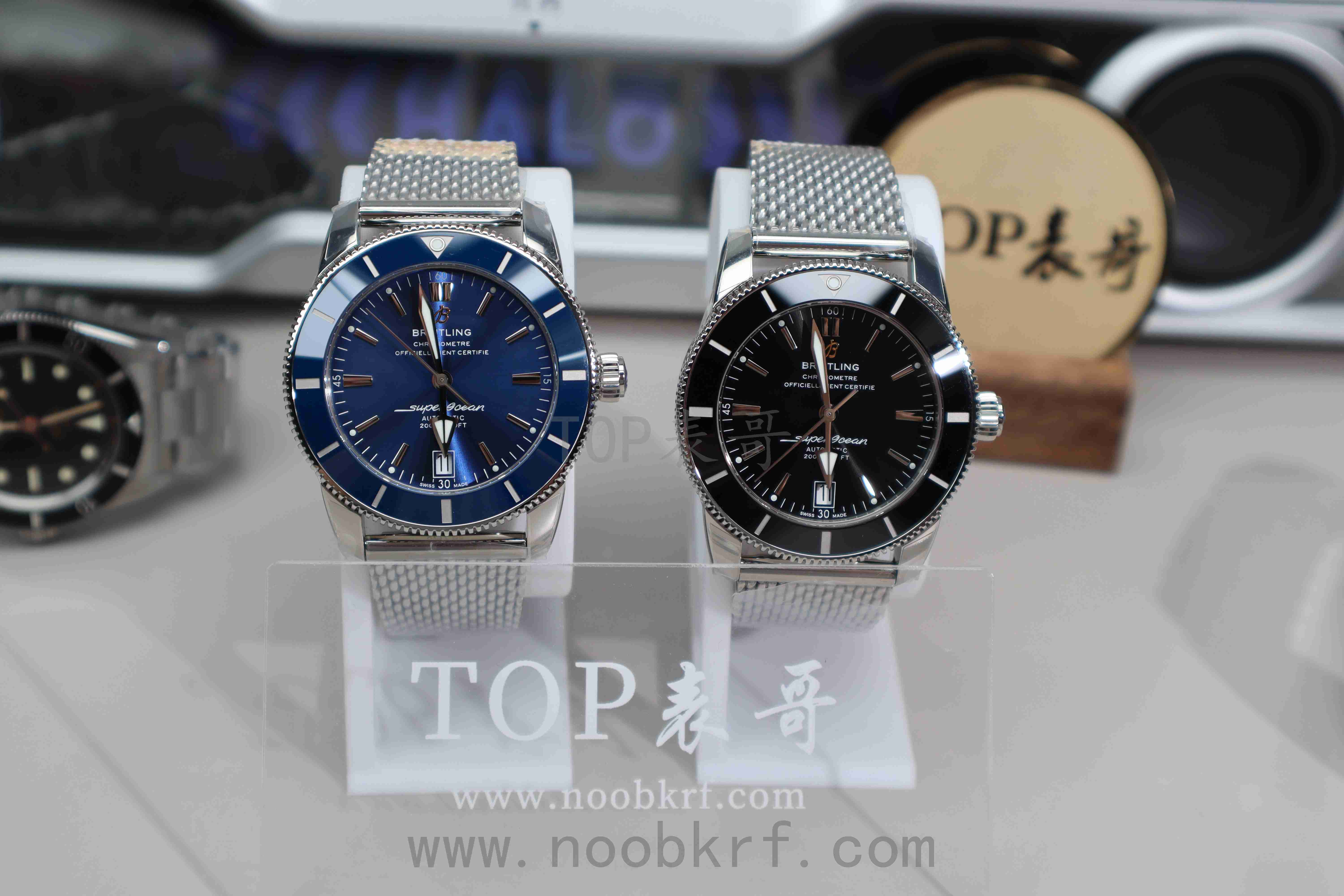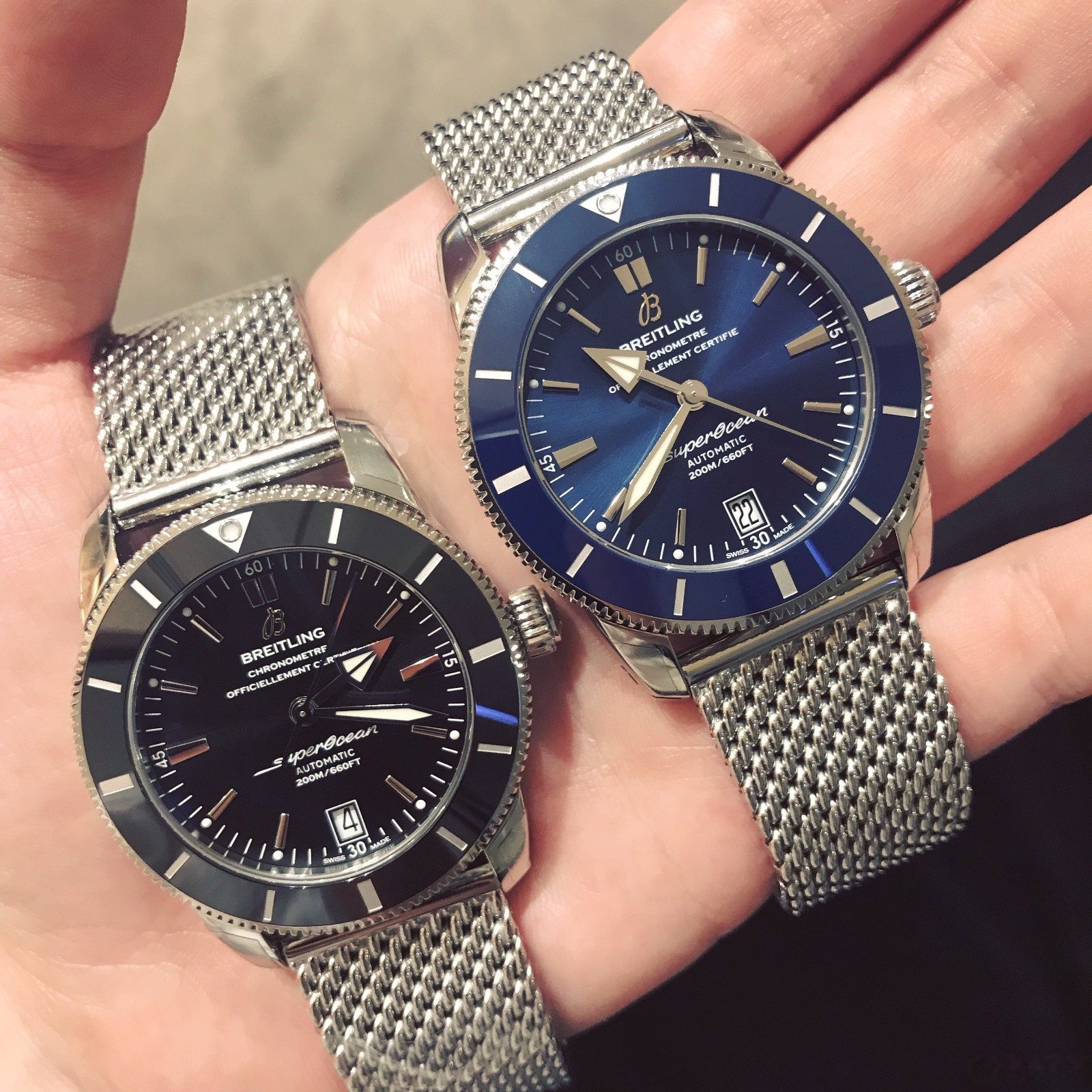 新款超级海洋文化使用陶瓷圈。表盘上是百年灵新的B字标志。