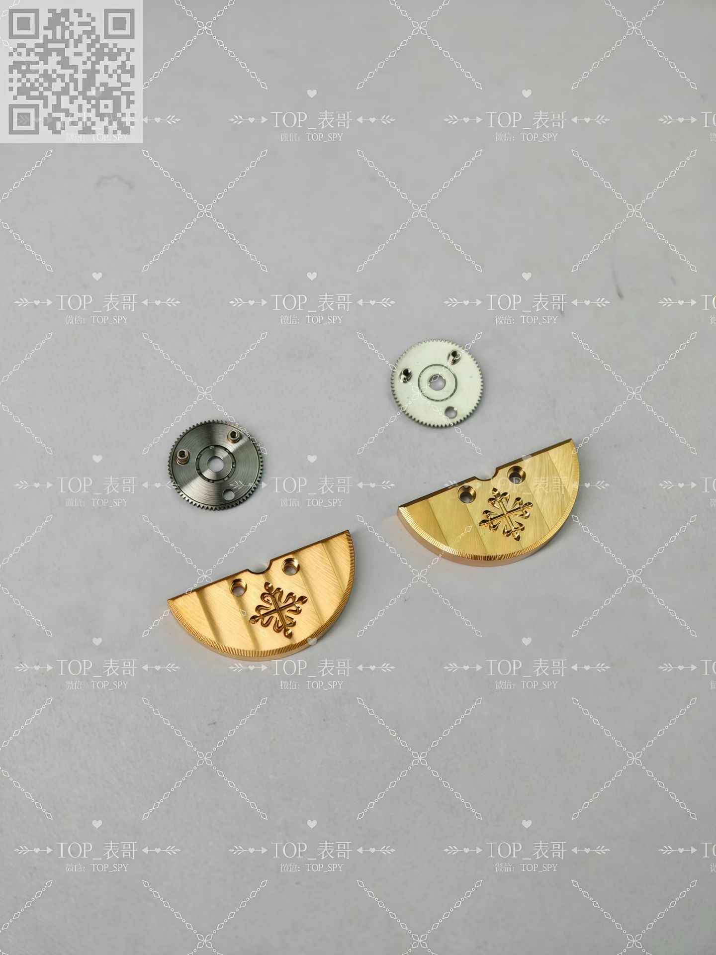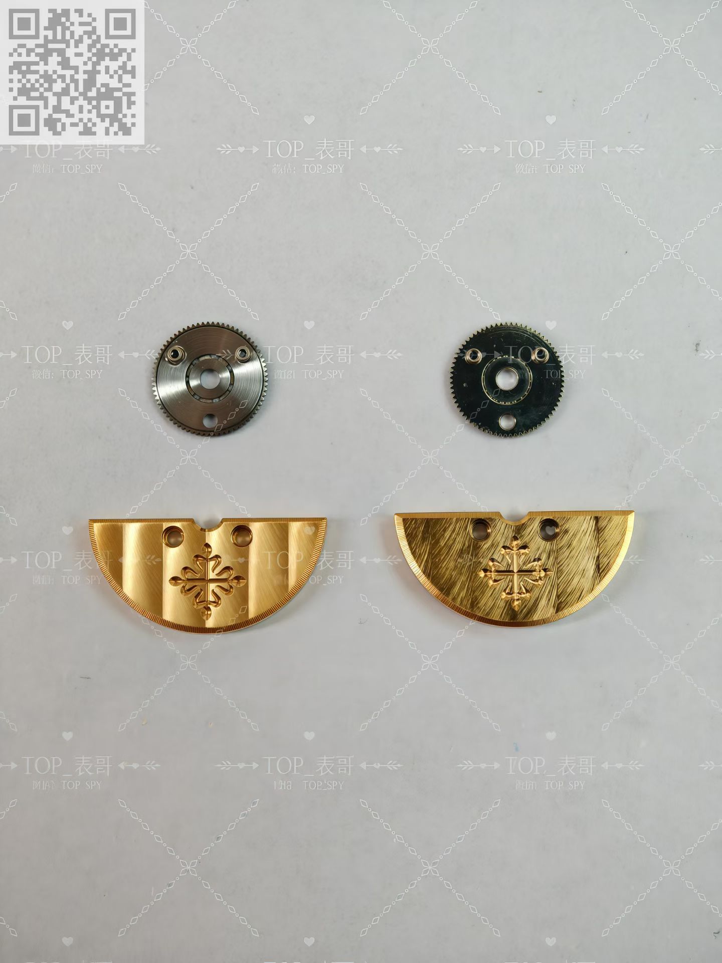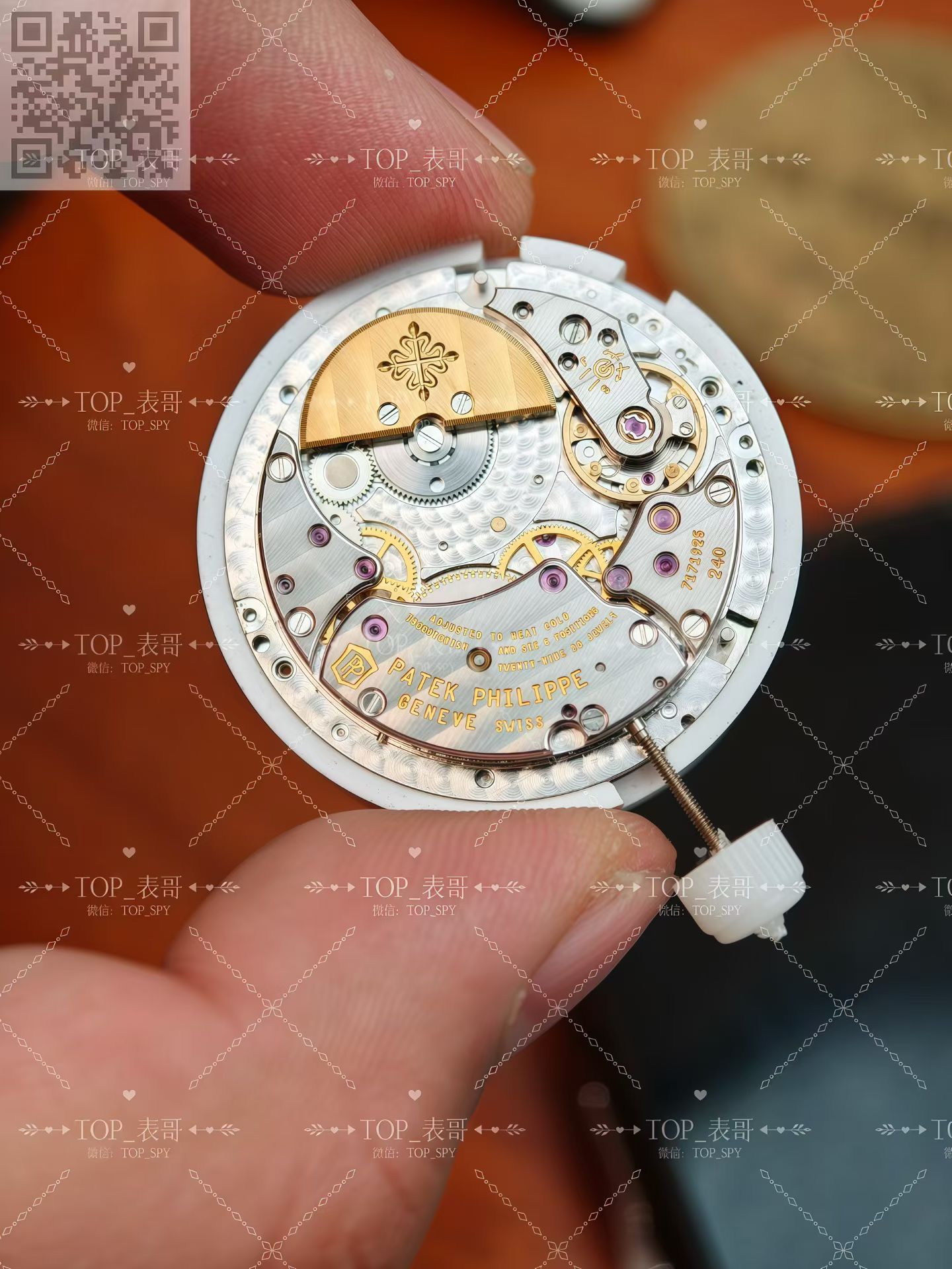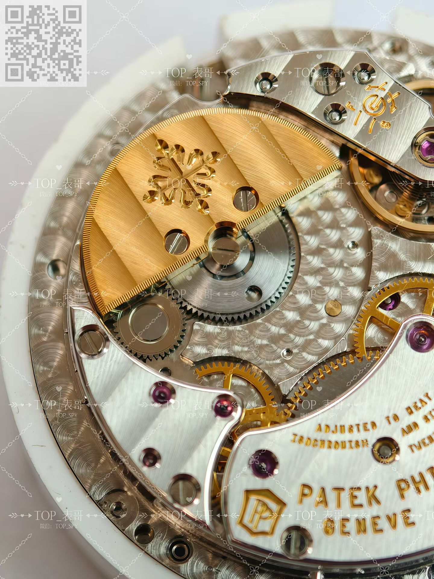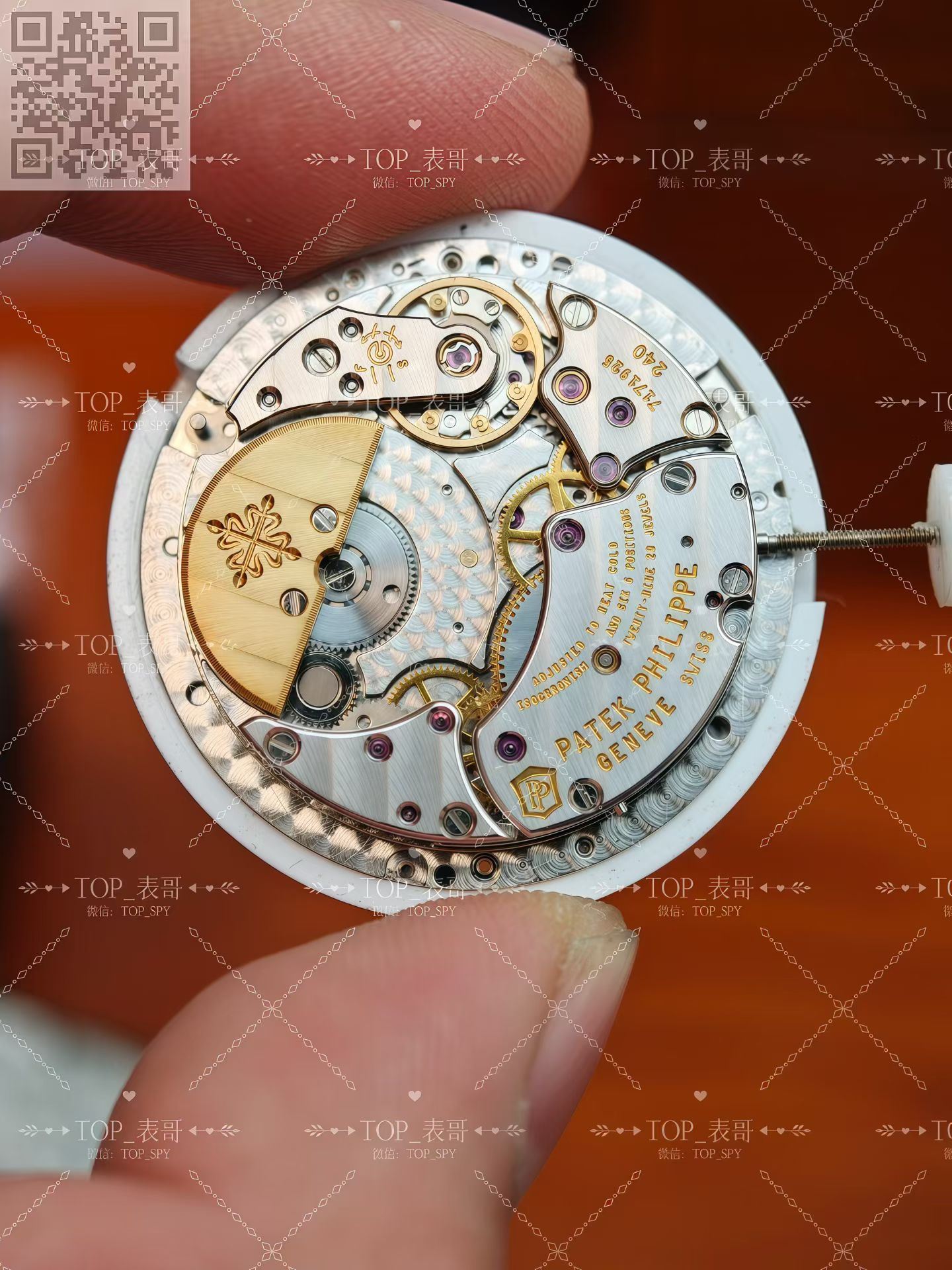 百达翡丽的240机芯珍珠陀材质为22k金材质,并不是大家熟悉的18k金材质,定制的材质240机芯在材质上也是同步原版的22k金材质,完美的鎏金雕刻印记,自动陀打磨拉丝细腻精密对比,相比较PPF厂的镀金自动陀差距可谓是天差地别的。